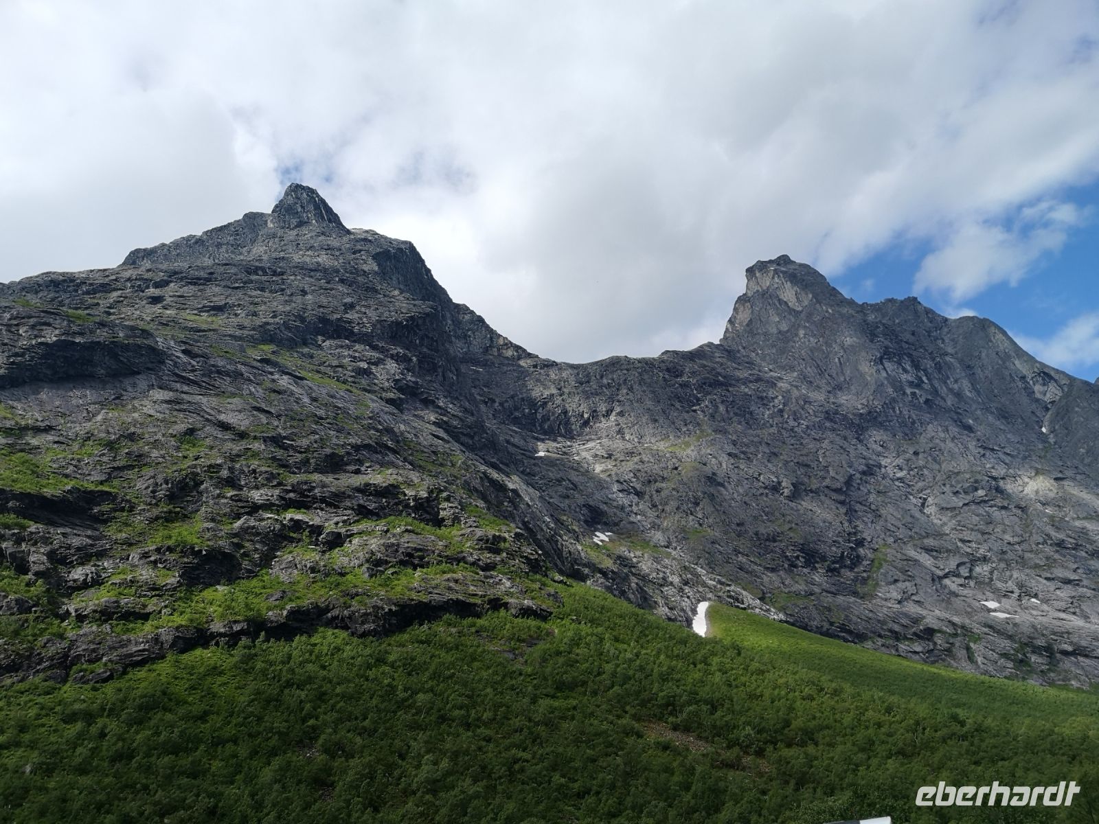 Trollstigen schlängelte sich vor uns hinauf und zeigte uns seine Schätze: der Wasserfall Stigfossen und Twerfossen, die alte Granitbrücke, und oben, auf dem Plateau, den herrlichen Blick auf die Romsdalsberge und Tal. Ich denke, diese Momente werden immer erst nach der Reise für Ewigkeit. Und wer konnte schon wissen, dass die Straße nur paar Tage nach unserem Besuch bis Ende der Saison wegen einer Gerölllawine gesperrt sein wird.