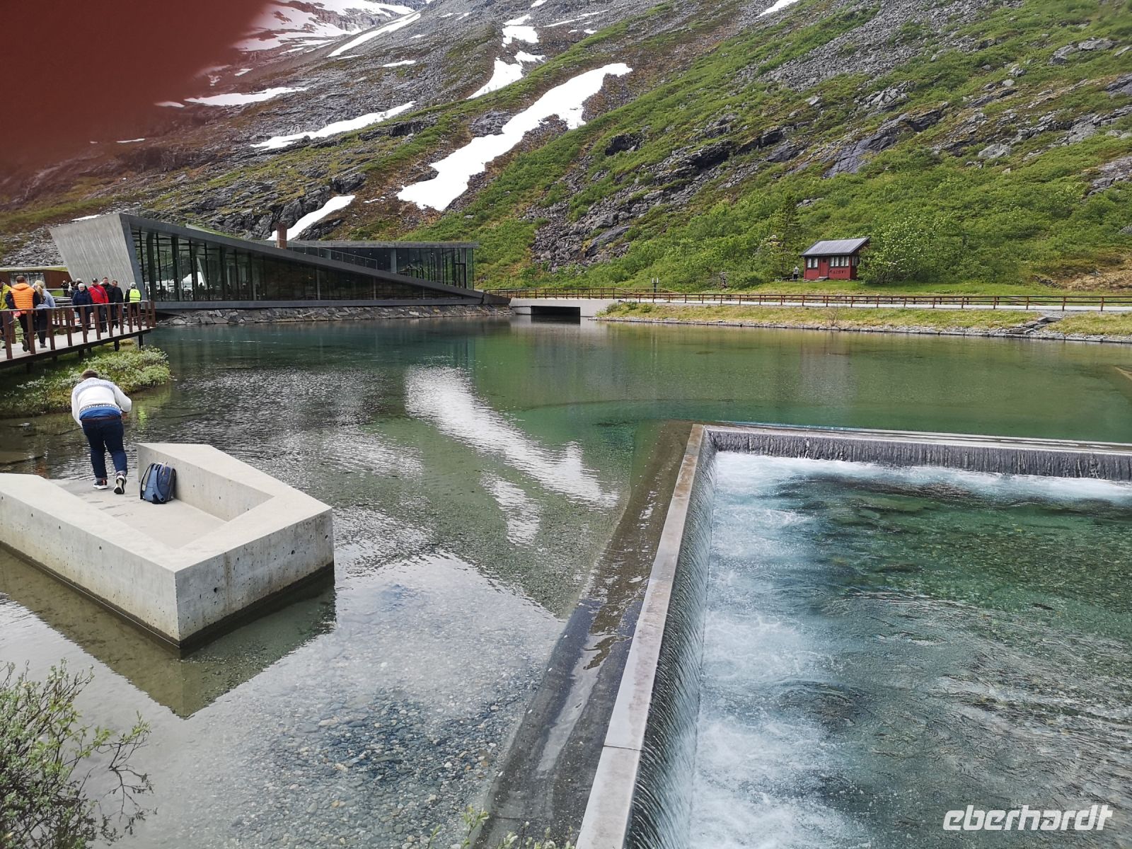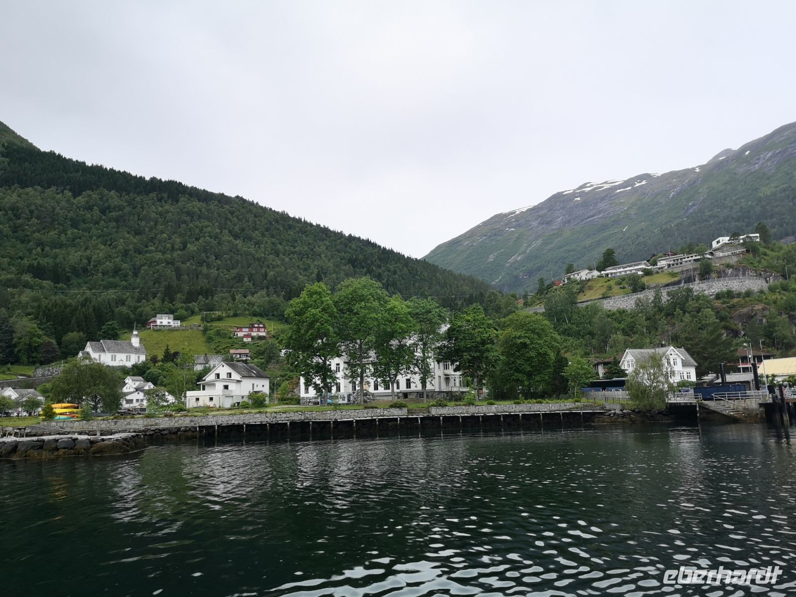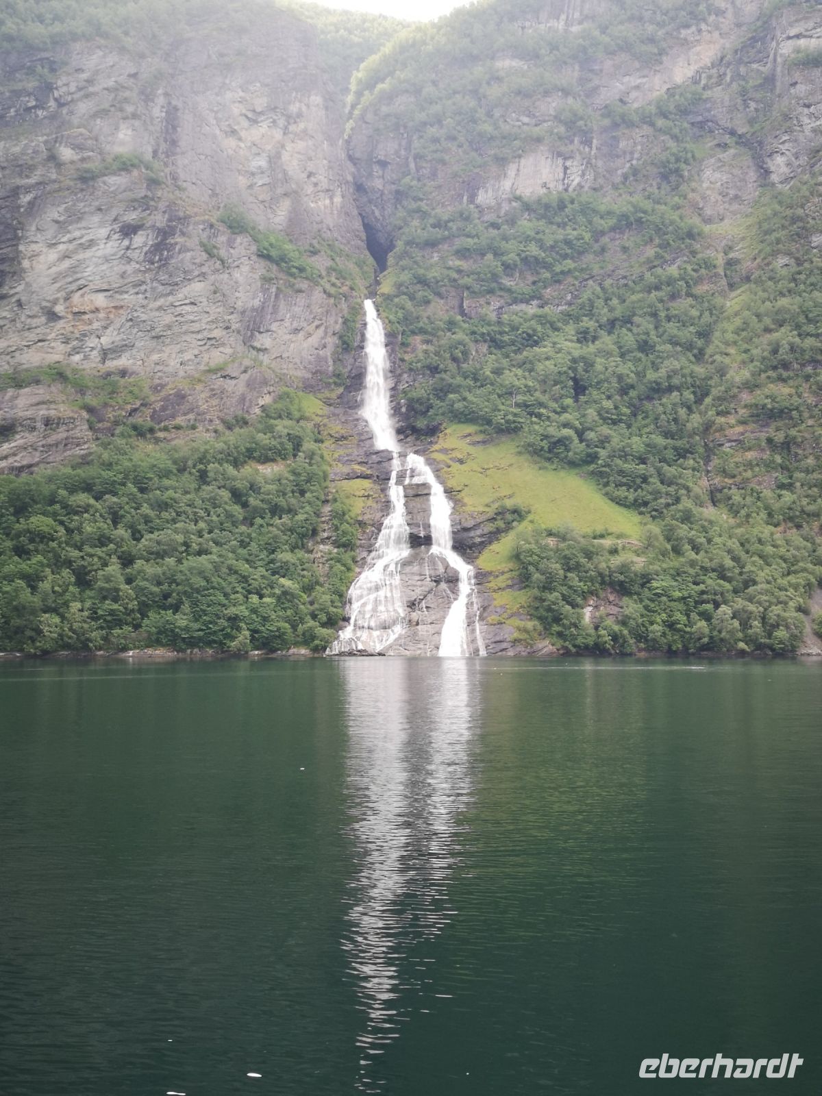 Die Fähre nach Hellesylt glitt über das dunkelgrüne Wasser des Geirangerfjords. Das Wetter ist halt trollig – man nehme etwas Wind, etwas Nieselregen, eine Brise Sonne und fertig ist es: ein perfektes norwegisches Wetter. Trotz oder vielleicht gerade deswegen kam der Fjord noch majestätischer vor: mit den (tatsächlich vorhandenen) 7 Schwestern und ihrem Freier, mit senkrecht aus dem Wasser steigenden Bergen mit Schnee bedeckten Gipfeln. Hellesylt begrüßte uns mit seinem, mitten in der Ortschaft rauschendem Wasserfall.