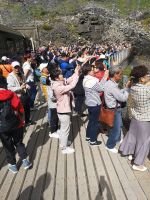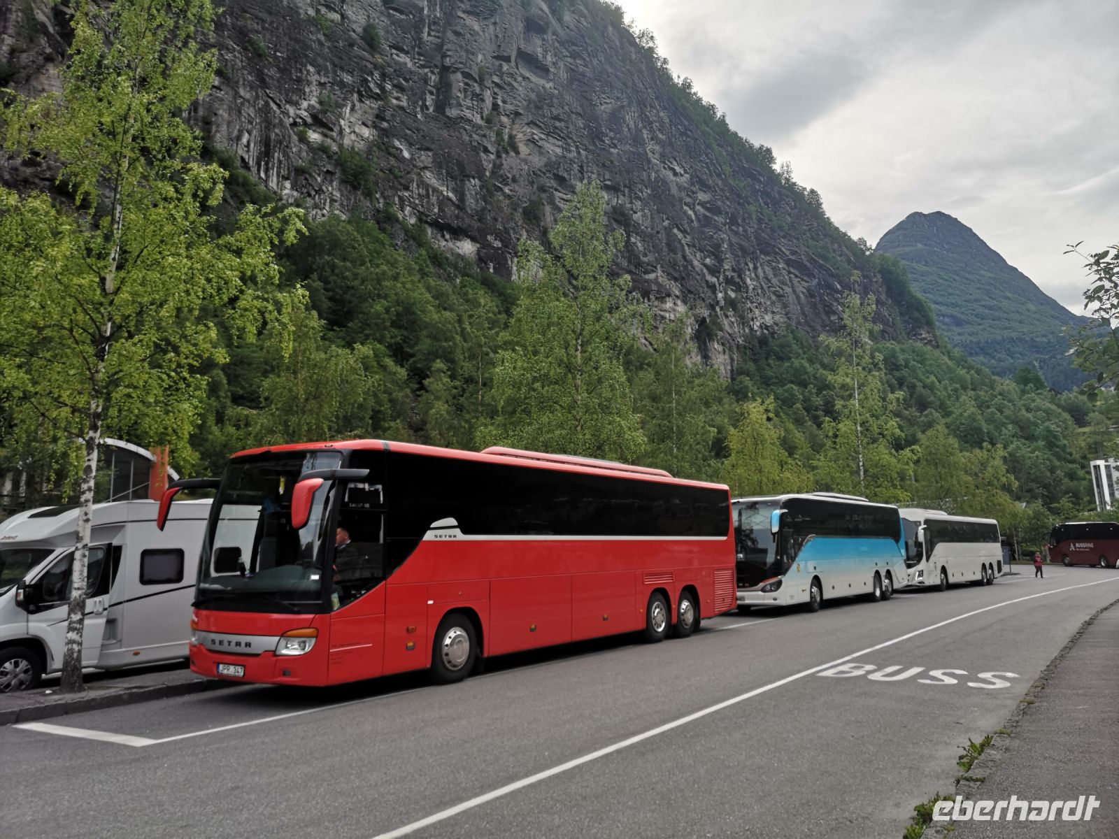 Die Adlerstrasse mit ihrem grandiosen Blick auf Geiranger Fjord hat es in sich. Die Nadelohrkurven verliehen den Gästen in der ersten Reihe so ein Gefühl, der Bus ragt über die Kurve hinaus. Nun ja, uns war bereits klar, das Lenkrad befand sich in den sichersten Händen und Jan seinem scharfen Blick entging nichts, nicht einmal eine Kleinigkeit.