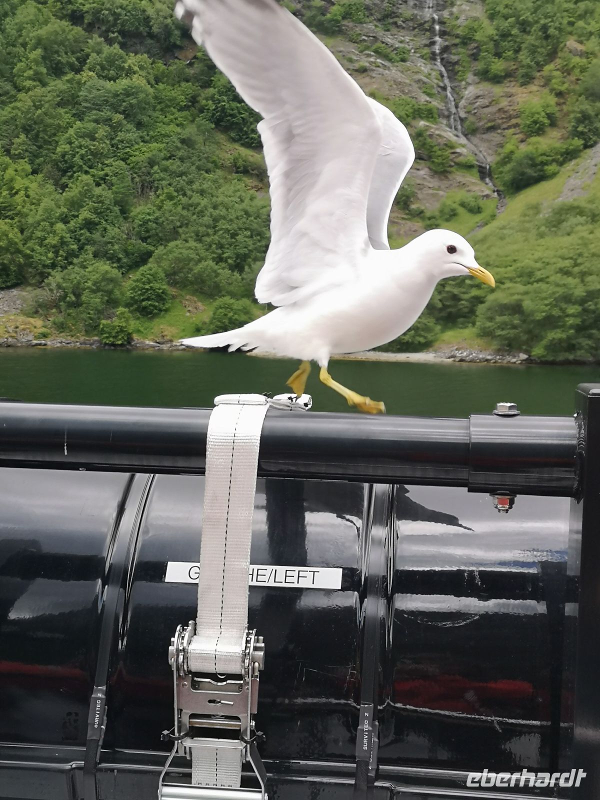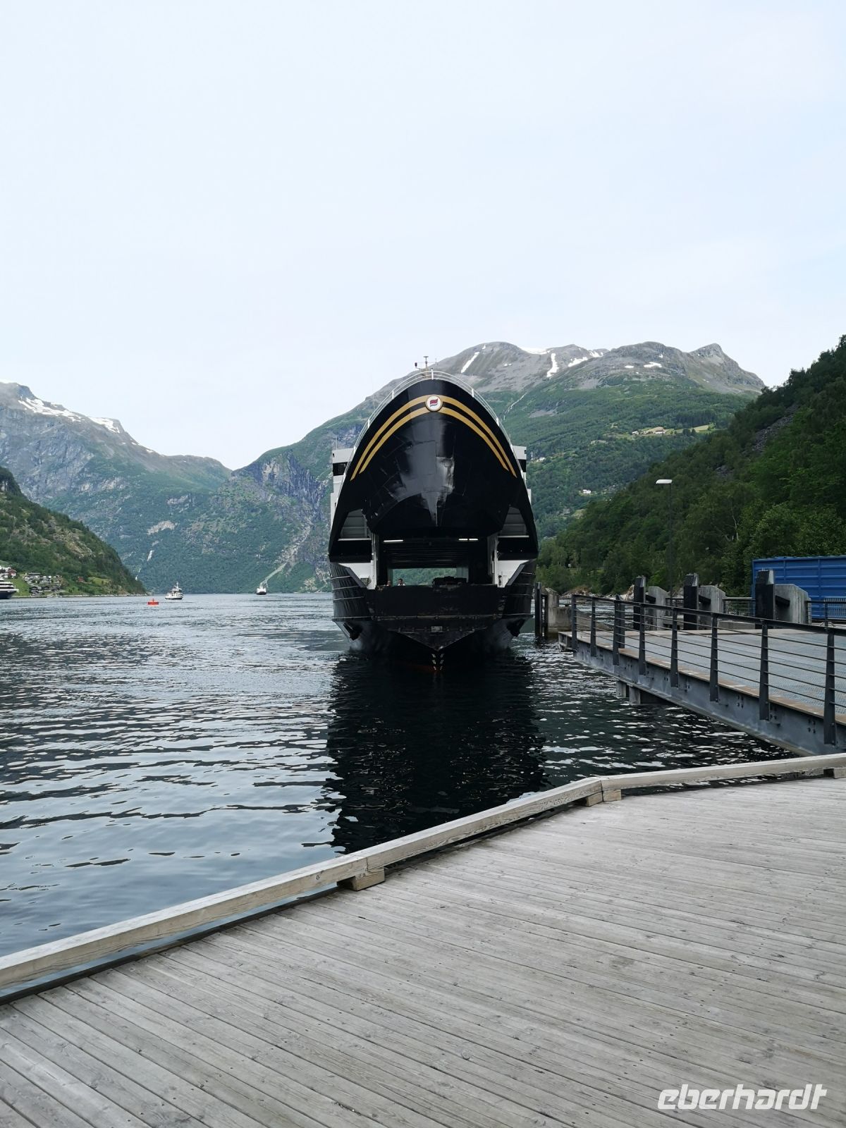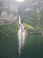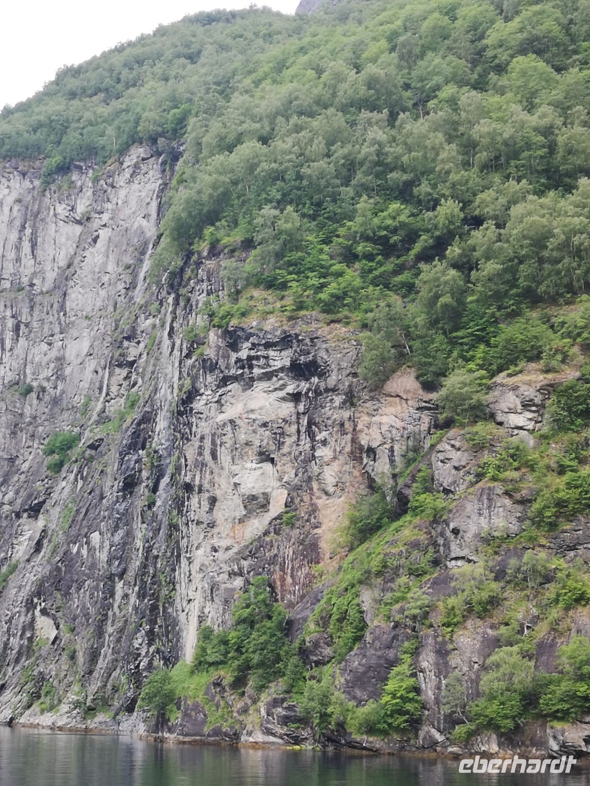 Naeroyfjord, einer den schönsten, und ganz sicher einer den schmalsten in Norwegen. Ein klitzekleiner Sonnenstrahl hätten wir uns gewünscht, aber auch gelegentliche Regentropfen und natürlich der Wind machte uns nur, „vom Winde verweht“, aber auf keinen Fall schlechte Laune. Die Wasserfälle in Fülle und emporsteigende Berge, lieblich am Ufer liegende, kleine, teilweise nur aus zwei, drei Häusern bestehenden Ortschaften. Vom Schiff aus wollte ich unbedingt bei Morki „die blasse Linde“ entdecken, schaffte es aber nicht.
