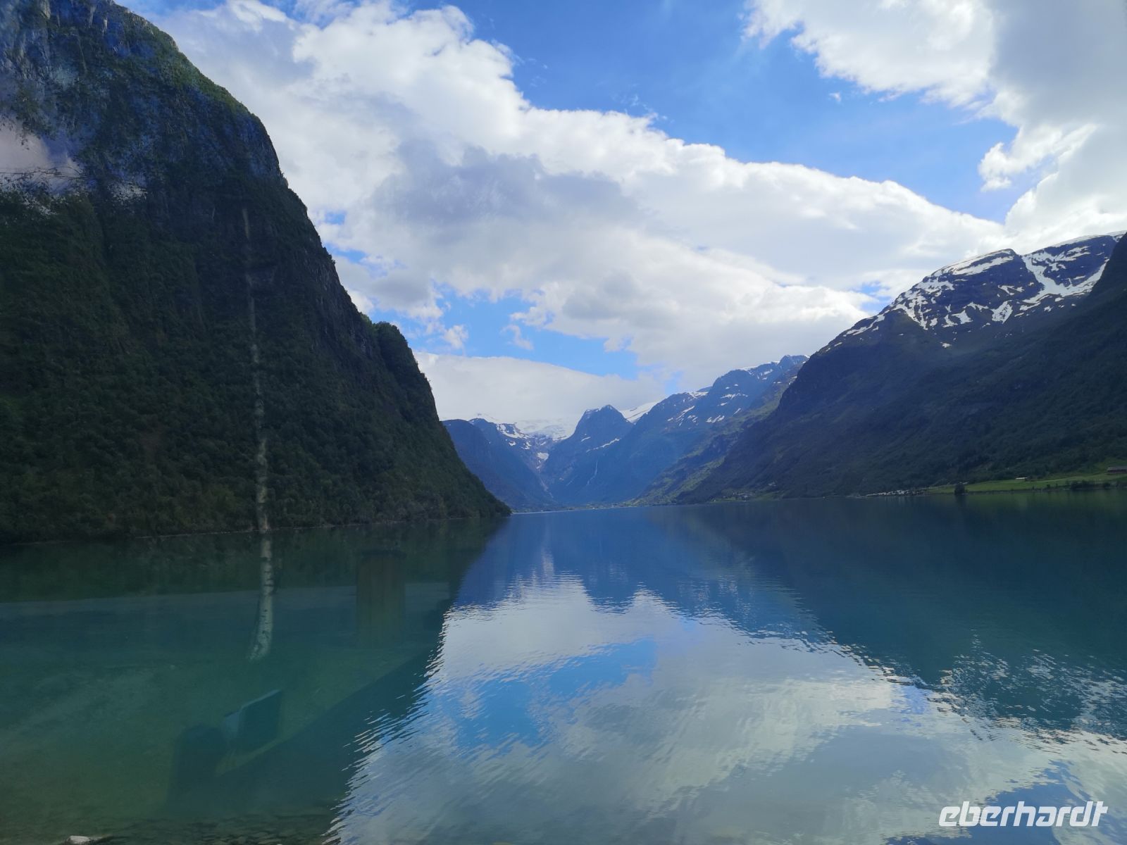 Briksdalsbreen, die Zunge/der Arm des Jostendalsbreens (der größte Gletscher Europas) streckte sich tief gen Tal runter, umgegeben mit Geröll und letztendlich ein Teil davon endend als Flüsschen im Gletschersee. Das helle, smaragdfarbene Wasser verzaubert jedem, der zu Fuß oder mit dem Trollwagen den Weg dorthin schafft. Ein lauter Knall deutete eine ständige Bewegung des Gletschers an – das Kalben des Gletschers.