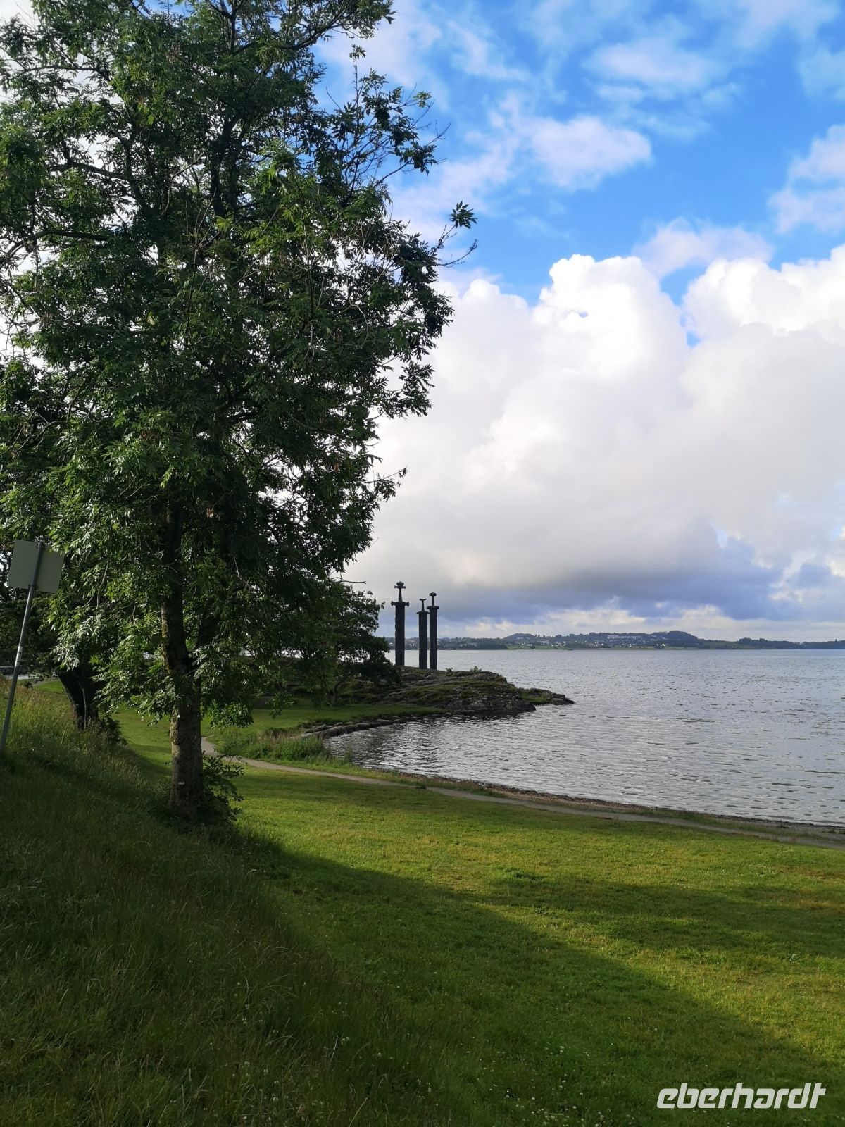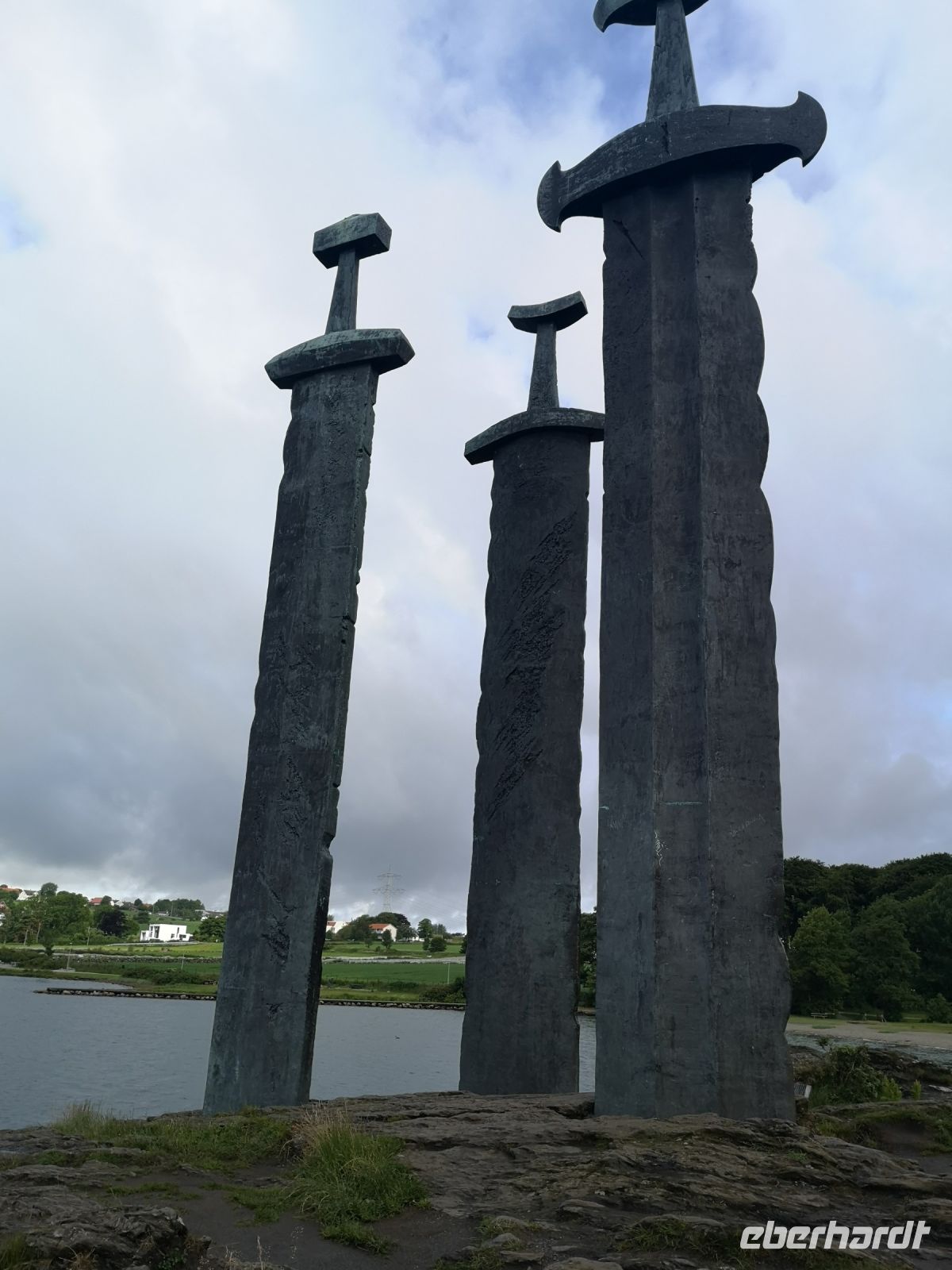 Wie sagte schon unsere Angela aus Bergen: man hat in Norwegen 100 Ausdrücke für Regen und nur 3 Wörter für schönes Wetter: Es regnet nicht. Also, diese 3 Wörter genossen wir gleich früh am Morgen, so konnten wir die 3 Schwerter, gewidmet der Schlacht im Hafrsfjord, im Sonnenlicht noch fotografieren.