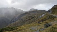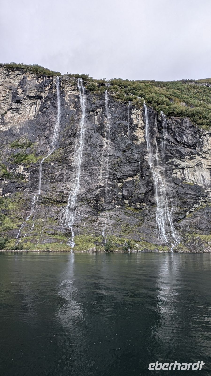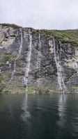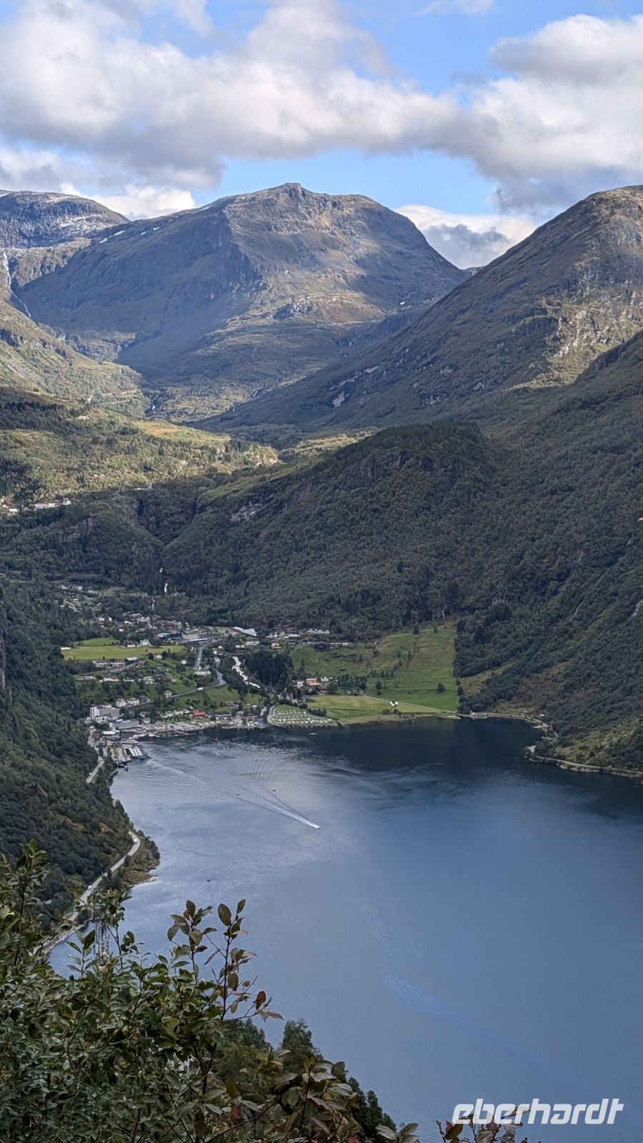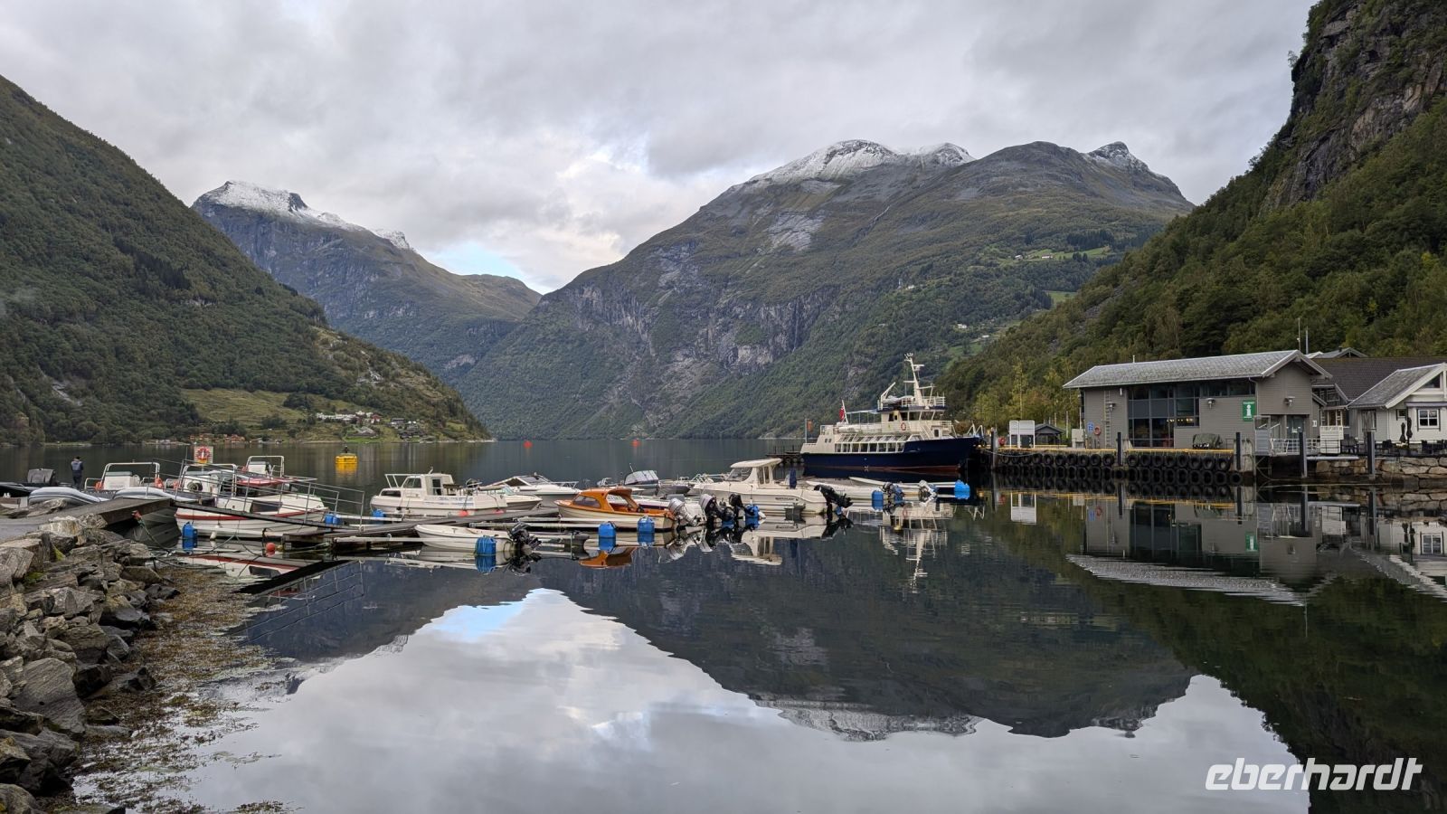 Zunächst noch etwas Regen, aber je näher man der Adlerkehre kam, umso heller wurde es und der Regen hörte auf. Die Sonne schien, Geiranger lag uns zu Füßen, der Dalsnibba darüber, die Wasserfälle der 7 Schwestern gegenüber und der Fjord in völliger Ruhe unter uns. Ein Platz zum länger verweilen.