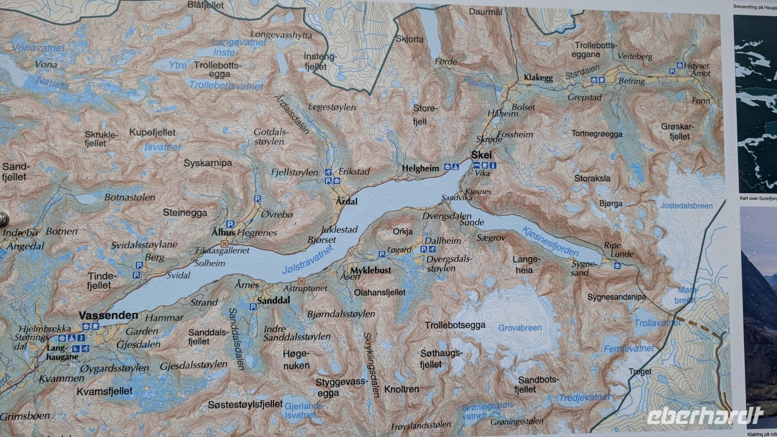 Unser Weg führte weiter durch das fruchtbare Valldal, vorbei an Obstbäumen und Erdbeefeldern, mit der Fähre über den Eidsfjord und hinüber zur Adlerkehre.