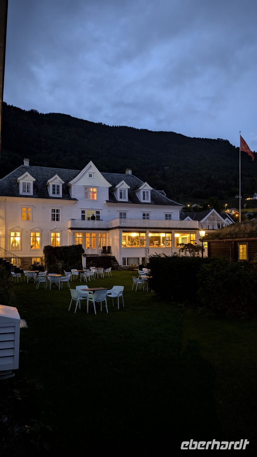 Unser Hotel lag direkt am zweitlängsten Fjord Europas in Leikanger. Ein uriges, gemütliches Hotel mit Seele und Flair aus der Zeit, als der Tourismus in Norwegen begann. Gelegen in einem der fruchtbarsten Gegenden Nortwewgens. Einem kleinen Paradies, wo Äpfel, Birnen, Obst und sogar Wein gedeihen. Der nördlichste Weinberg der Welt, hier in Leikanger.