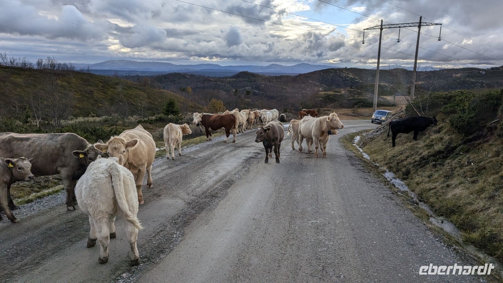 Eine traumhafte Hochebene mit grandiosen Ausblicken, herrliches Wetter, tolle Farben und eine Schotterstraße mit Kühen auf der Fahrbahn.