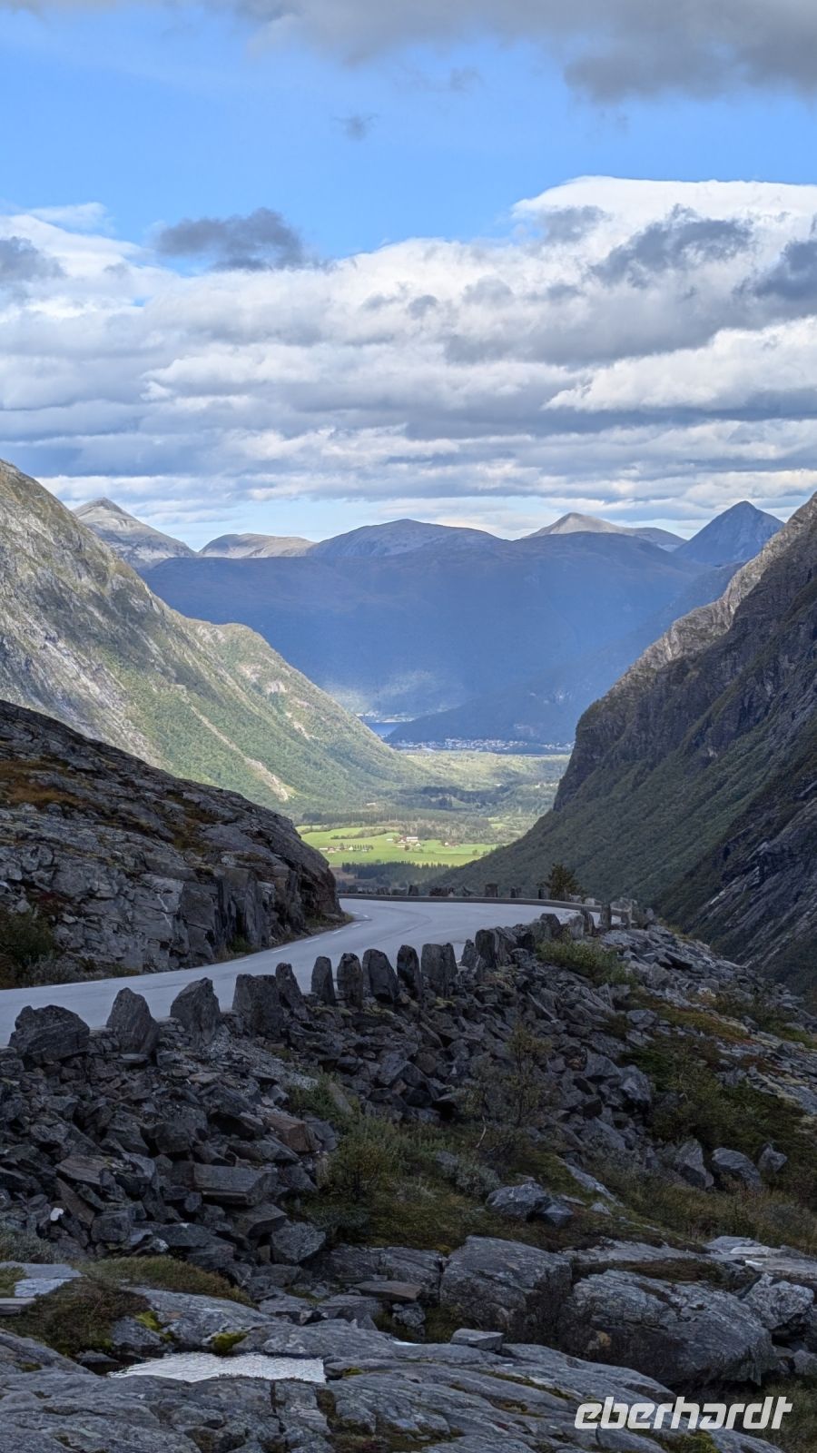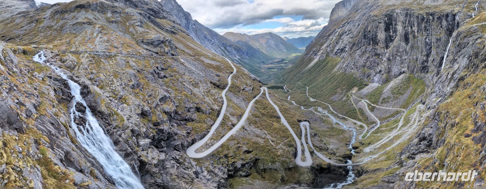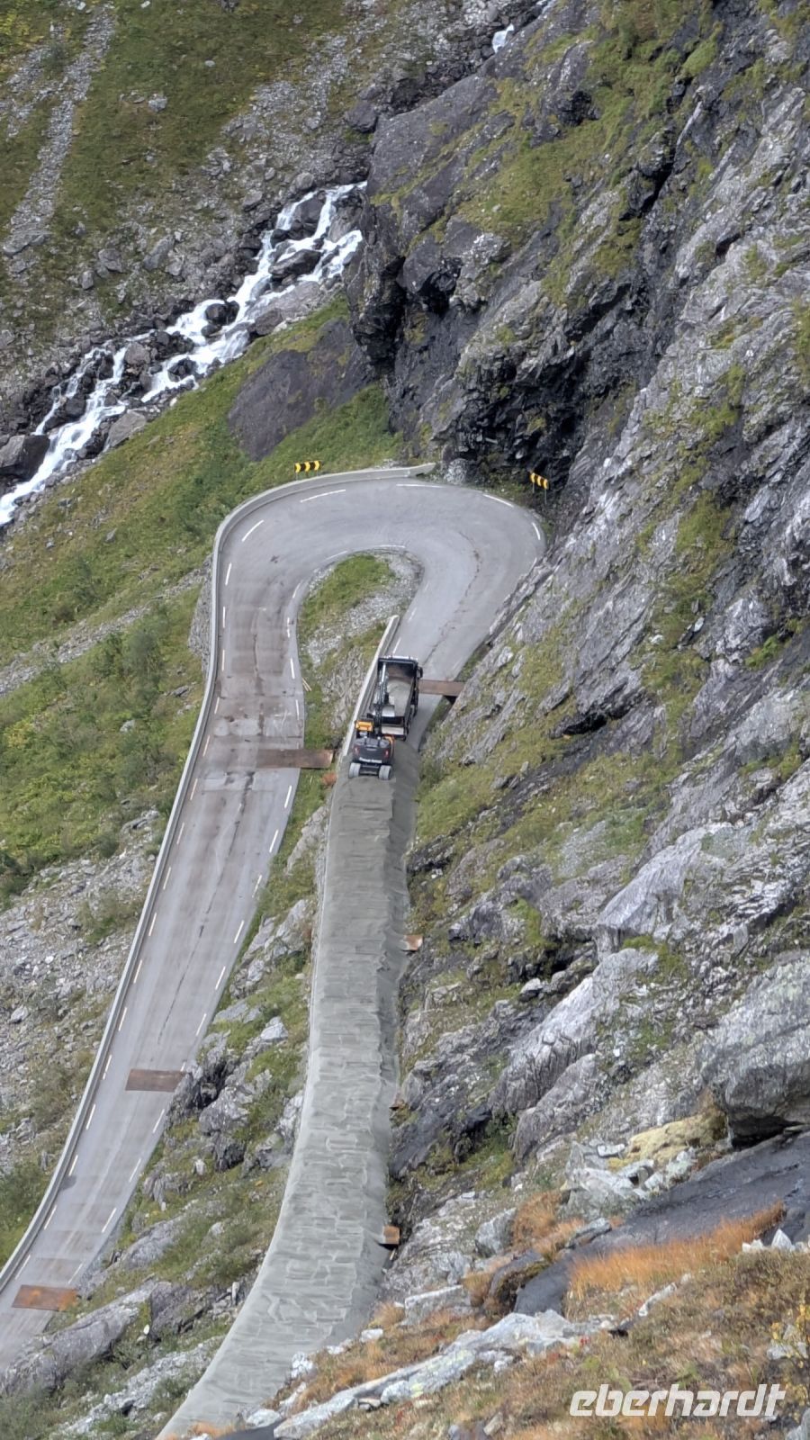 Uns aber wurde ein herrlicher Ausblick geschenkt bis nach Andalsnes, das von der Sonne beschienen wurde. Der Trollstigen war Autofrei, ein seltsamer Anblick und unter uns waren die Arbeiten an den Felswänden zur zukünftigen Sicherung der Straße voll im Gange.