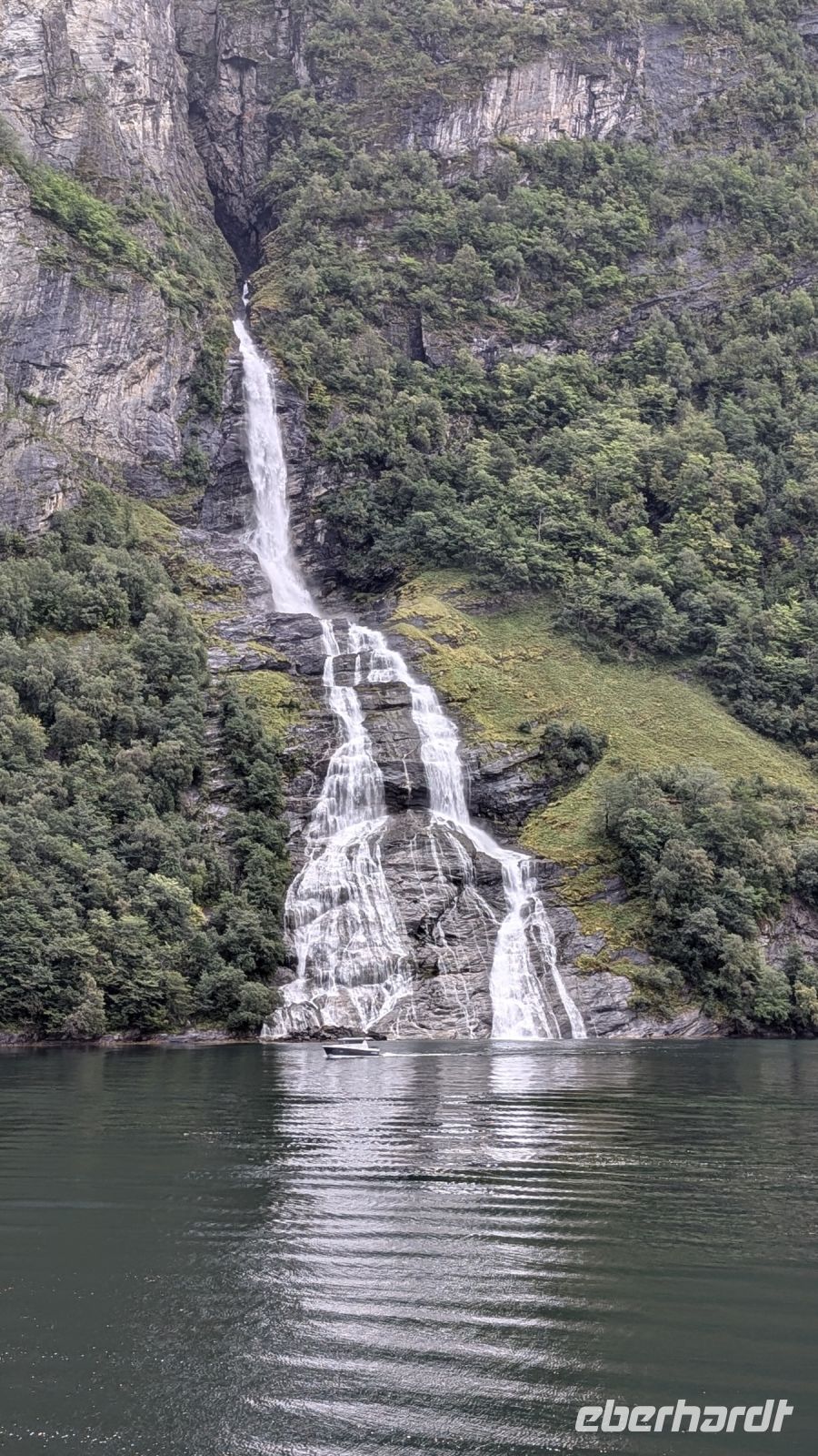 Eine traumhafte Fjordfahrt über den Geirangerfjord führte uns hinüber nach „Klein Hollywood“. Vorbei an den Fjordhöfen, den 7 Schwestern, dem Freier, dem Brautschleier, der Teufelsschlucht und Matvika. Akerneset, der Berg, der eines Tages in den Fjord stürzen wird, war in der Ferne zu erkennen.