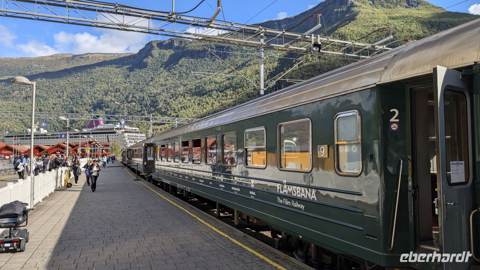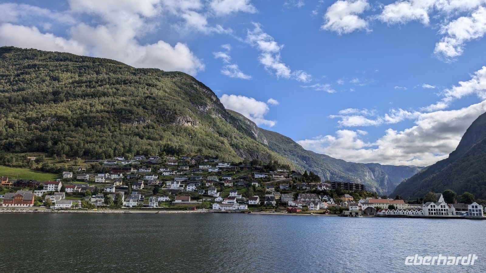 Nach 2 Stunden Fahrt der Stille, legte das Schiff im Hafen von Flam an. Flam ist immer ein Besuch wert, besonders das markante Wikingerhaus, unten am Hafen.