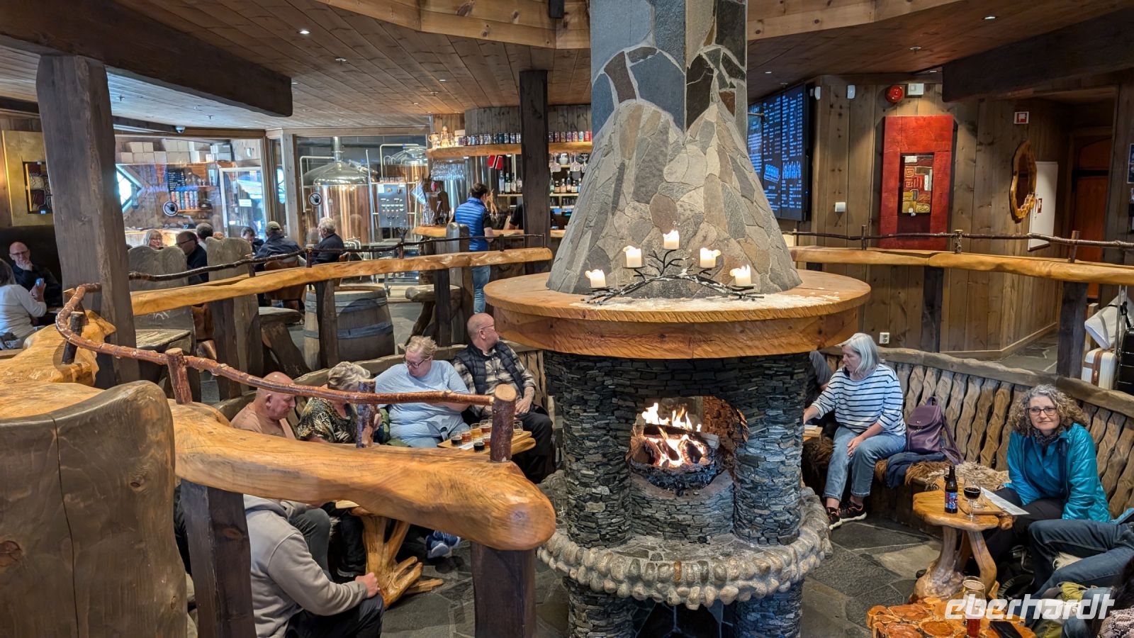 Die Heimat des Gottes Aegir. Rustikale Holzstühle mit Fell bedeckt, in der Mitte ein wohlig wärmender Holzofen und dahinter blitzen die blanken kupfernen Braukesseln mit Köstlichem Bier.