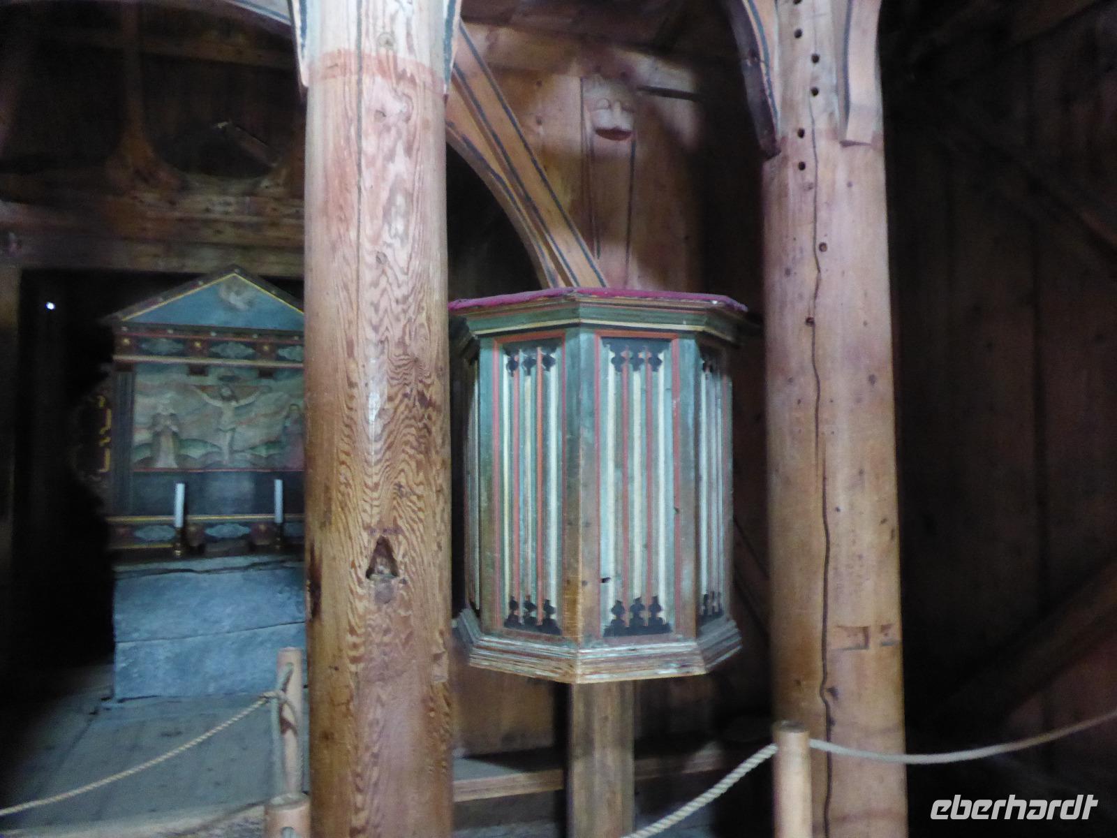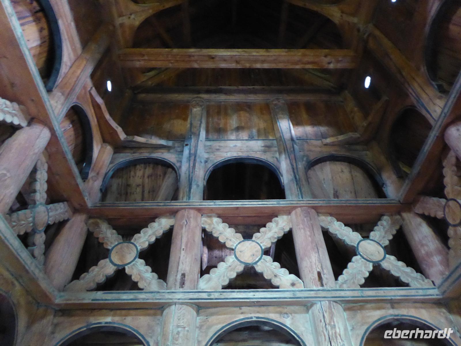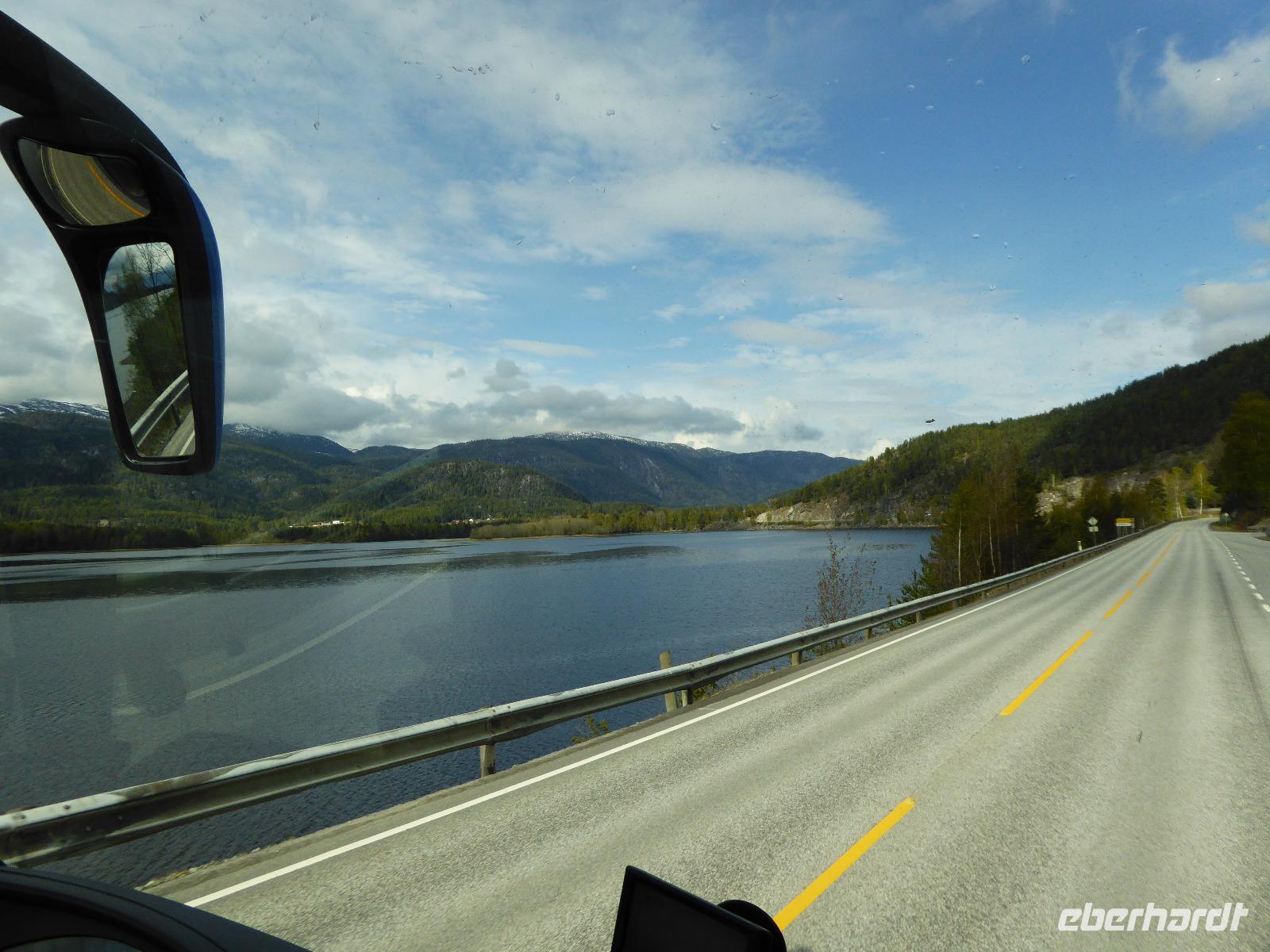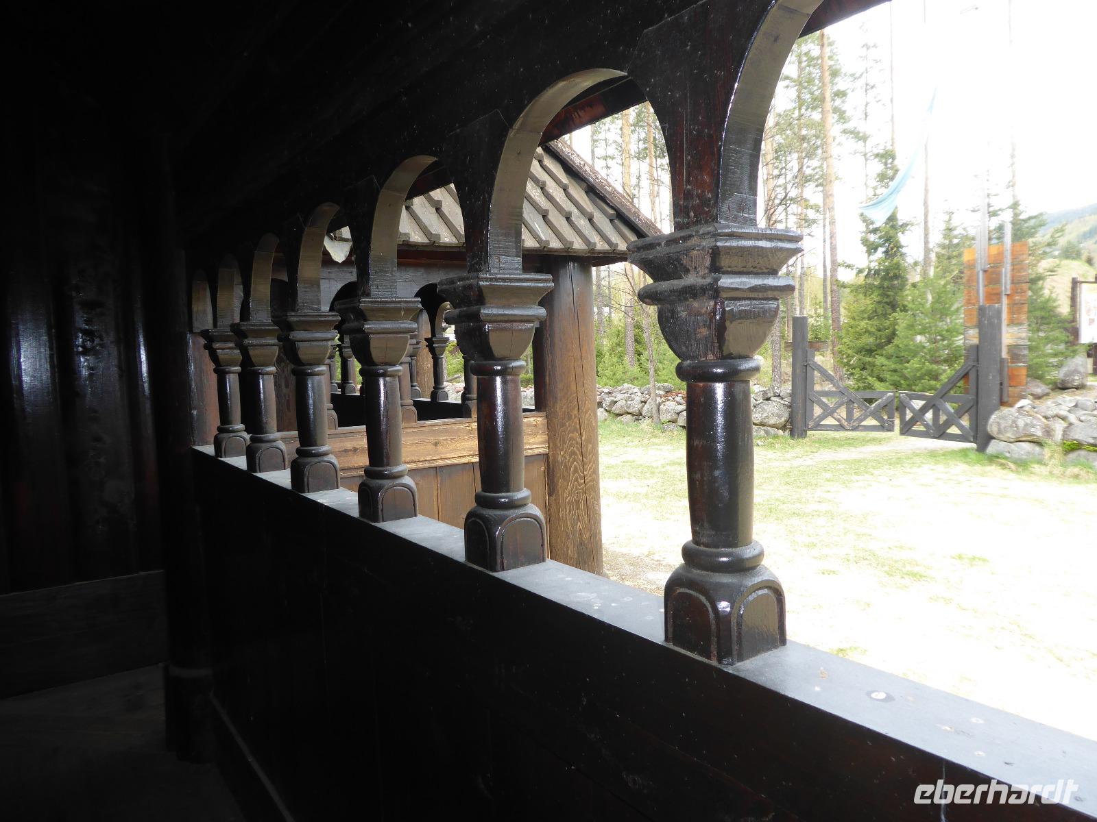Nach einem leckeren Frühstücksbuffet starten wir kurz vor Neun. Unsere Fahrt führt uns nördlich aus Oslo heraus. Wir streifen den Tyrifjorden, den größten Binnensee Norwegens. Vorbei an Honefoss, dem Glasbläserparadies Norwegens, geht es weiter bis zum Hallingdal. Die einzigartige Natur, die uns umgibt, wird von Vivaldis Violinenkonzert Vier Jahreszeiten untermalt. In Gol besuchen wir eine Stabkirche. Allerdings handelt es sich hier um einen Nachbau. Das Original befindet sich in Oslo im Nationalmuseum. Eine Stunde später kommen wir nach Borgund. Nach einem kleinen Abstecher durch den Ort, wo wir feststellen, dass sich die Stabkirche dort nicht befindet, kommen wir wenig später am Besucherzentrum an. Nun stillen wir erst einmal die irdischen Bedürfnisse. Es gibt etwas zu Essen und ein WC. Danach steht uns wieder der Sinn nach Kultur und Geschichte. Die Stabkirche von Borgund ist einzigartig. Sie gehört zu den Hauptattraktionen Norwegens. In der Hochsaison müssen Besucher wegen Überfüllung lange auf Einlass warten. Wir heute nicht, denn wir sind ganz allein hier. Wahrscheinlich wurde die Stabkirche Ende des 12. Jahrhunderts gebaut als noch heidnischer Glaube und Christentum nebeneinander existierten. Man bekommt eine Gänsehaut vom Anblick dieses wunderschönen Gebäudes. Und wenn man hineingeht, stehen die Nackenhaare zu Berge, so viel Geschichte atmet diese kleine Kirche. Was sich hier wohl alles angespielt hat? Die Runen der Wikinger müssen wir uns zeigen lassen, trotz Beschreibung sind sie so versteckt, dass wir sie nicht finden können. Der junge Guide zeigt uns gleich noch die vielen Einkerbungen in der Kirchentür. Diese sind aber keinesfalls auf die Wikinger zurückzuführen, sondern stammen von Bauern, die hier jahrhundertelang den Gottesdienst besuchten. Das Holz für die Kirche wurde nachweislich im Winter 1180 geschlagen. Man vermutet, dass die Kirche kurz danach errichtet wurde. Erbauer waren fahrende Handwerkergruppen, die viel Können und Erfahrungen mitbrachten. Die meisten Stabkirchen in Norwegen wurden um 1130 bis 1350 erbaut. Dann kam die Pest und die Bautätigkeit wurde beendet. In anderen europäischen Ländern gab es ähnliche Kirchen, aber nur in Norwegen sind sie erhalten geblieben. Einst waren es mindestens eintausend, 28 existieren noch. Die Stabkirche von Borgund hat ohne größere Änderungen überlebt. Warum? Sie wurde auf einem steinernen Sockel gebaut. So kam sie nicht in Berührung mit feuchtem Boden und faulte nicht.