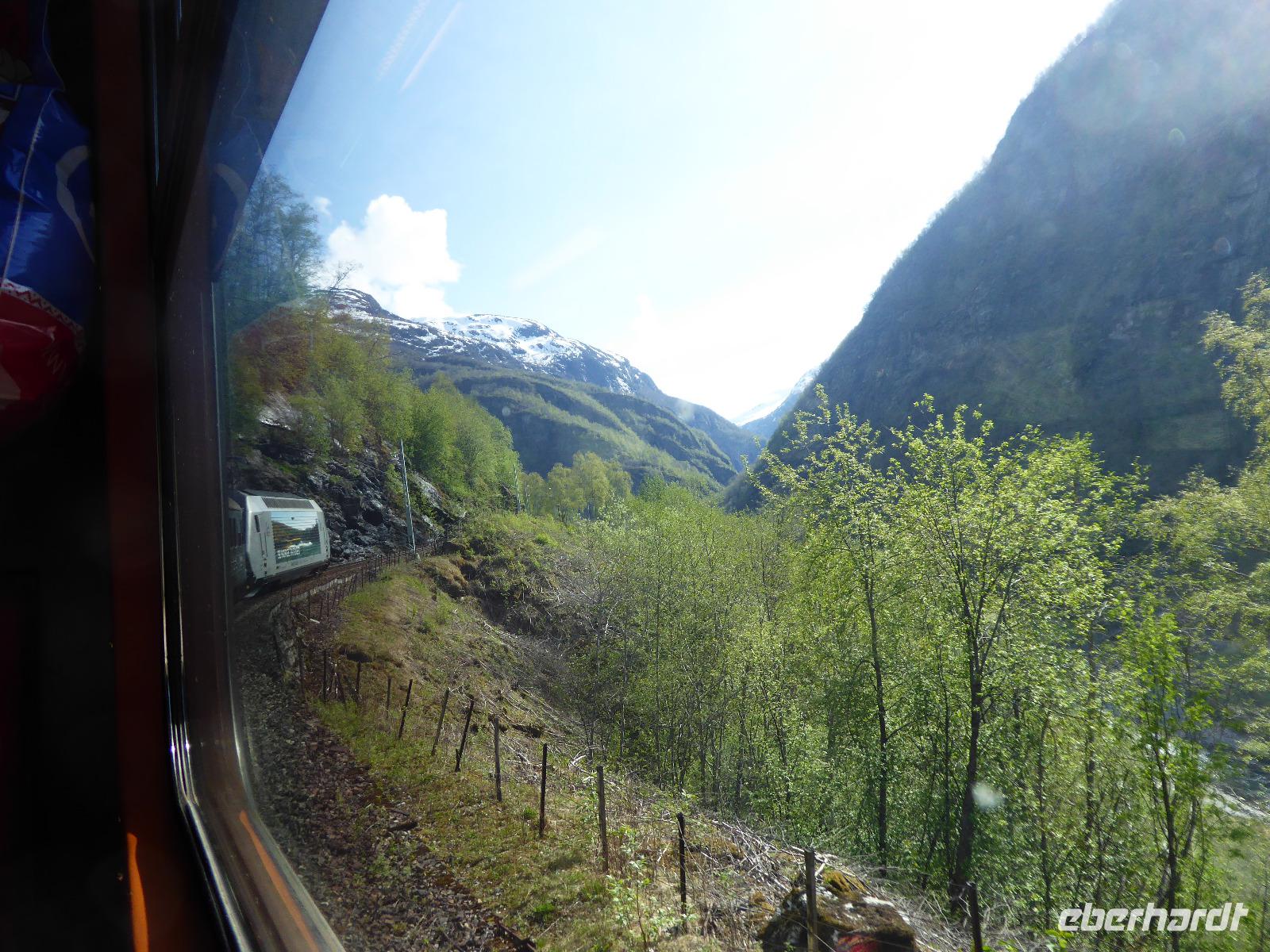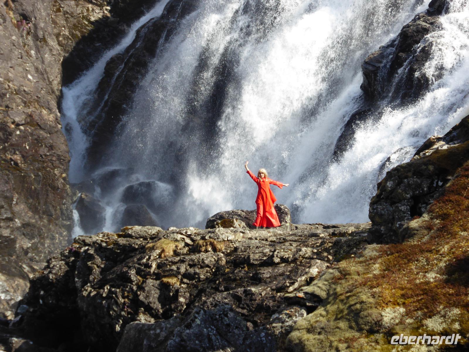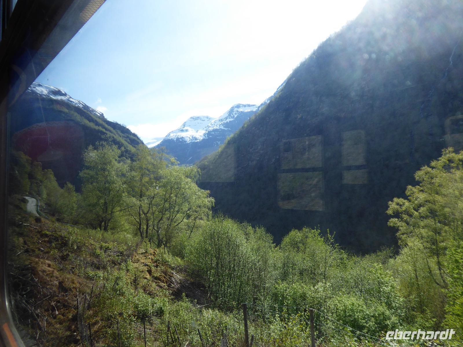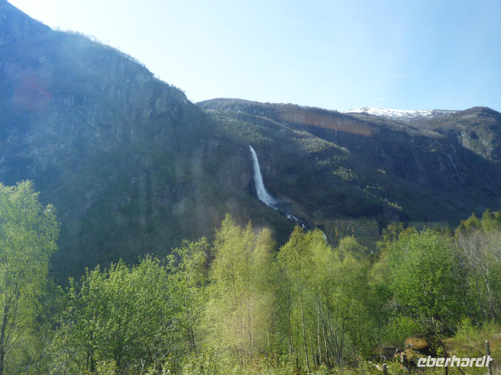 Kulinarisch und kulturell gesättigt setzen wir unseren Weg fort. Wir fahren durch den Laerdalstunnel, mit fast 25 Kilometern Länge der längste Straßentunnel der Welt. Nach fünf Kilometern ist der Tunnel blau illuminiert. Nach zehn Minuten haben wir die Hälfte des Tunnels durchquert, nach zwanzig erblicken wir wieder das Licht der Welt. Jetzt ist es nicht mehr weit bis nach Flam. Am Bahnhof haben wir Zeit, den Souvenirshop zu erobern und unser Geld los zu werden. 16.05 Uhr fährt die Bahn pünktlich ab. Wir haben Glück, es ist nicht voll und wir haben das ganze Abteil für uns allein. So können wir zum Fotografieren von rechts nach links und wieder zurück wechseln. Regelmäßig gibt es Durchsagen (auch auf Deutsch), wo wir uns befinden und was es hier zu sehen gibt. Am Wasserfall Kjosfossen legt der Zug eine fünfminütige Pause ein, wo wir den Zug verlassen und fotografieren können. Plötzlich erklingt Musik und Huldrene, die Fee im roten Kleid, versucht mit einem Tanz, die Männer zu sich in den Wasserfall zu locken. Zum Glück erliegt kein Herr aus unserer Gruppe dem sirenenartigen Gesang und wir setzen vollzählig die Fahrt fort. Nach einer Stunde kommen wir in Myrdal an. Wir haben einen Aufenthalt von gut fünfzig Minuten, können hier Kaffee trinken oder Eis essen. Nun steigen wir in die Bergenbahn. Im Gegensatz zur Flambahn, die vorrangig von Touristen genutzt wird, ist diese ein Regelzug, der aber durch eine nicht minder attraktive Landschaft fährt. Noch einmal eine Stunde Fahrt und wir sind in Geilo, wo uns Toralf mit dem Bus erwartet. Gegen 19 Uhr treffen wir im gemütlichen 3-Sterne Hotel Bardola Hoyfjellshotel ein. Wir beziehen unsere Balkonzimmer und genießen anschließend das hervorragende Abend-Buffet.