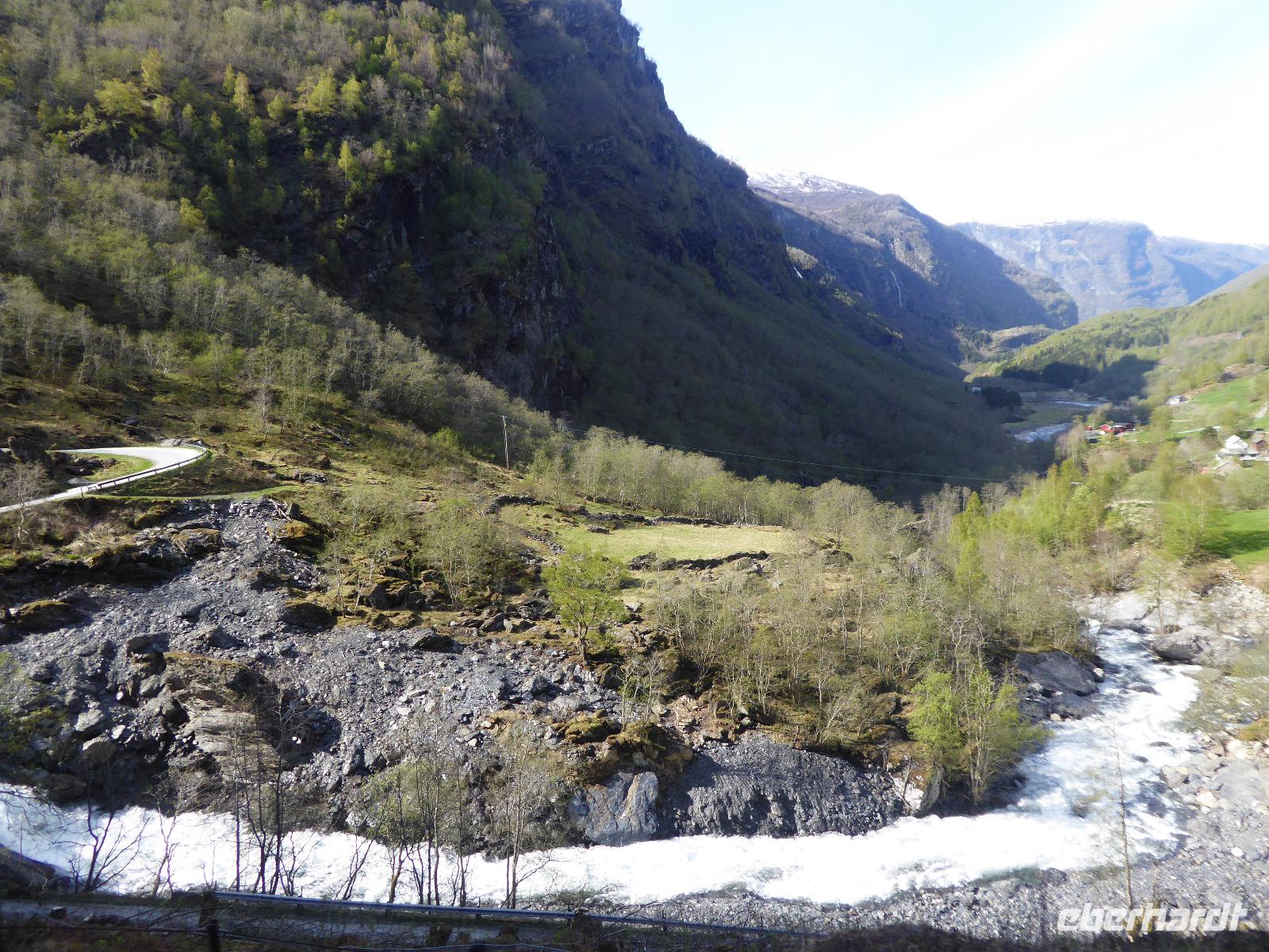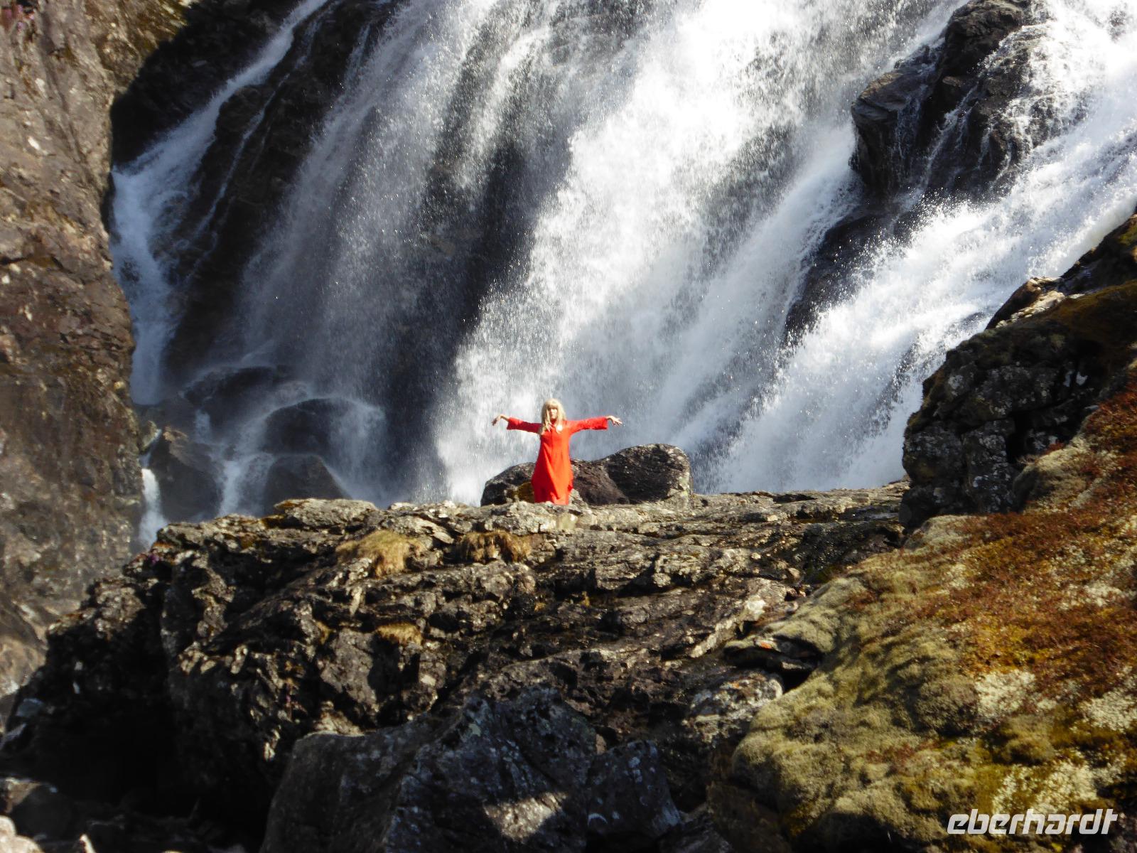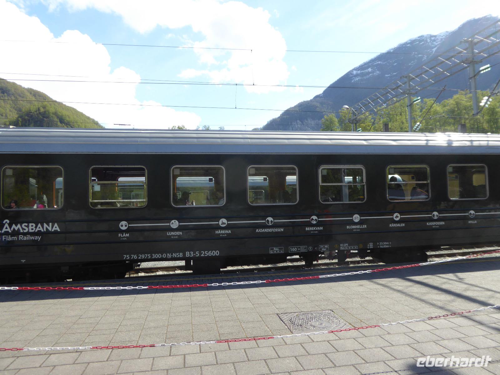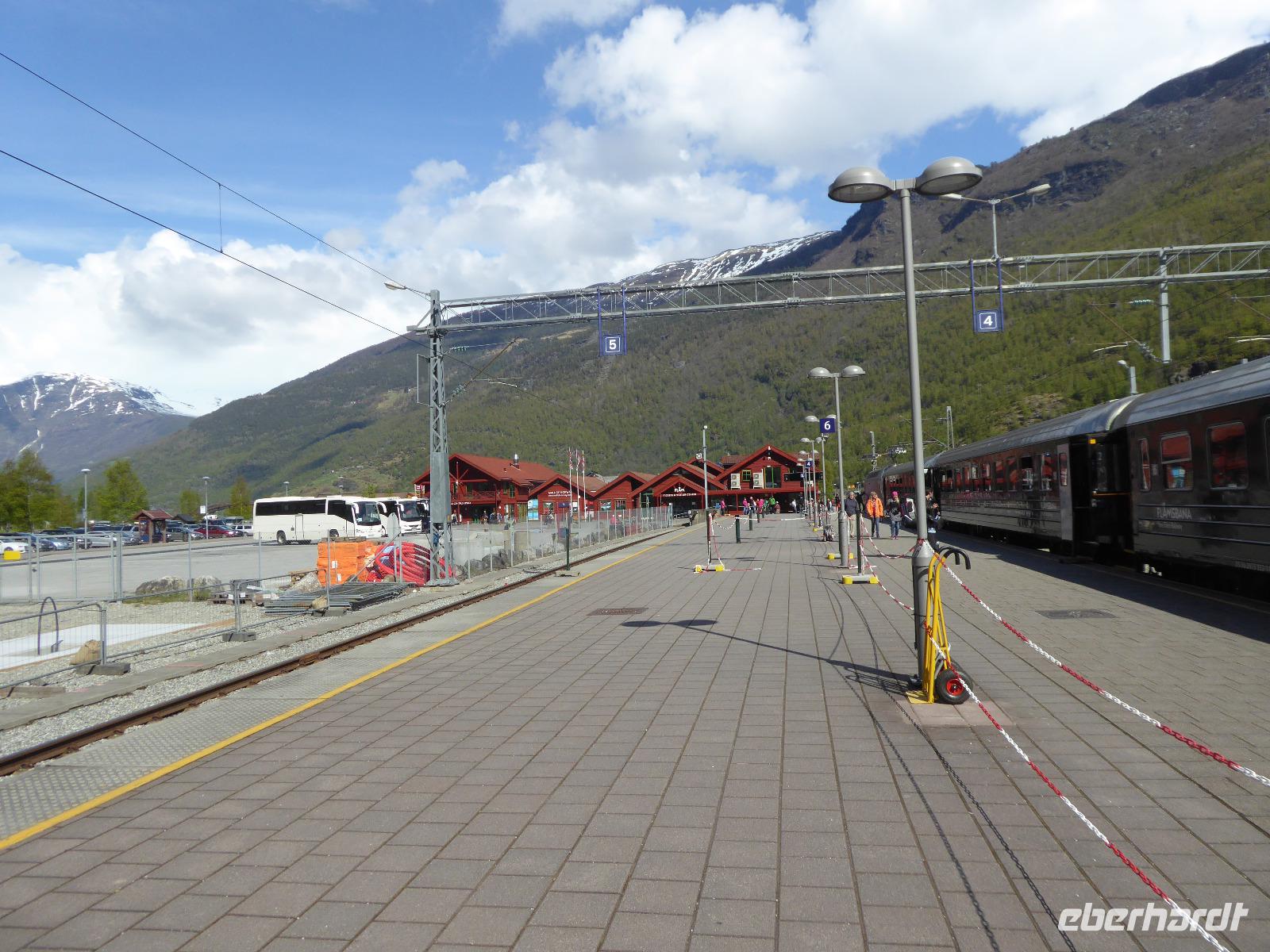 Kulinarisch und kulturell gesättigt setzen wir unseren Weg fort. Wir fahren durch den Laerdalstunnel, mit fast 25 Kilometern Länge der längste Straßentunnel der Welt. Nach fünf Kilometern ist der Tunnel blau illuminiert. Nach zehn Minuten haben wir die Hälfte des Tunnels durchquert, nach zwanzig erblicken wir wieder das Licht der Welt. Jetzt ist es nicht mehr weit bis nach Flam. Am Bahnhof haben wir Zeit, den Souvenirshop zu erobern und unser Geld los zu werden. 16.05 Uhr fährt die Bahn pünktlich ab. Wir haben Glück, es ist nicht voll und wir haben das ganze Abteil für uns allein. So können wir zum Fotografieren von rechts nach links und wieder zurück wechseln. Regelmäßig gibt es Durchsagen (auch auf Deutsch), wo wir uns befinden und was es hier zu sehen gibt. Am Wasserfall Kjosfossen legt der Zug eine fünfminütige Pause ein, wo wir den Zug verlassen und fotografieren können. Plötzlich erklingt Musik und Huldrene, die Fee im roten Kleid, versucht mit einem Tanz, die Männer zu sich in den Wasserfall zu locken. Zum Glück erliegt kein Herr aus unserer Gruppe dem sirenenartigen Gesang und wir setzen vollzählig die Fahrt fort. Nach einer Stunde kommen wir in Myrdal an. Wir haben einen Aufenthalt von gut fünfzig Minuten, können hier Kaffee trinken oder Eis essen. Nun steigen wir in die Bergenbahn. Im Gegensatz zur Flambahn, die vorrangig von Touristen genutzt wird, ist diese ein Regelzug, der aber durch eine nicht minder attraktive Landschaft fährt. Noch einmal eine Stunde Fahrt und wir sind in Geilo, wo uns Toralf mit dem Bus erwartet. Gegen 19 Uhr treffen wir im gemütlichen 3-Sterne Hotel Bardola Hoyfjellshotel ein. Wir beziehen unsere Balkonzimmer und genießen anschließend das hervorragende Abend-Buffet.
