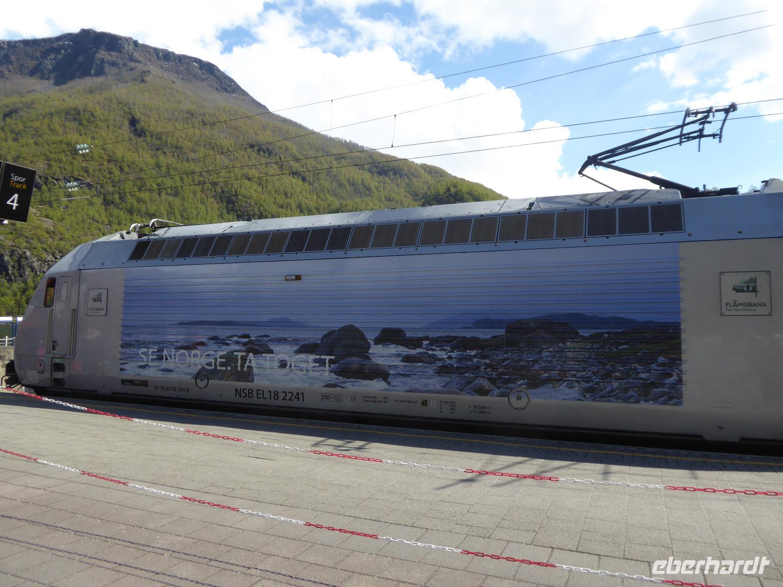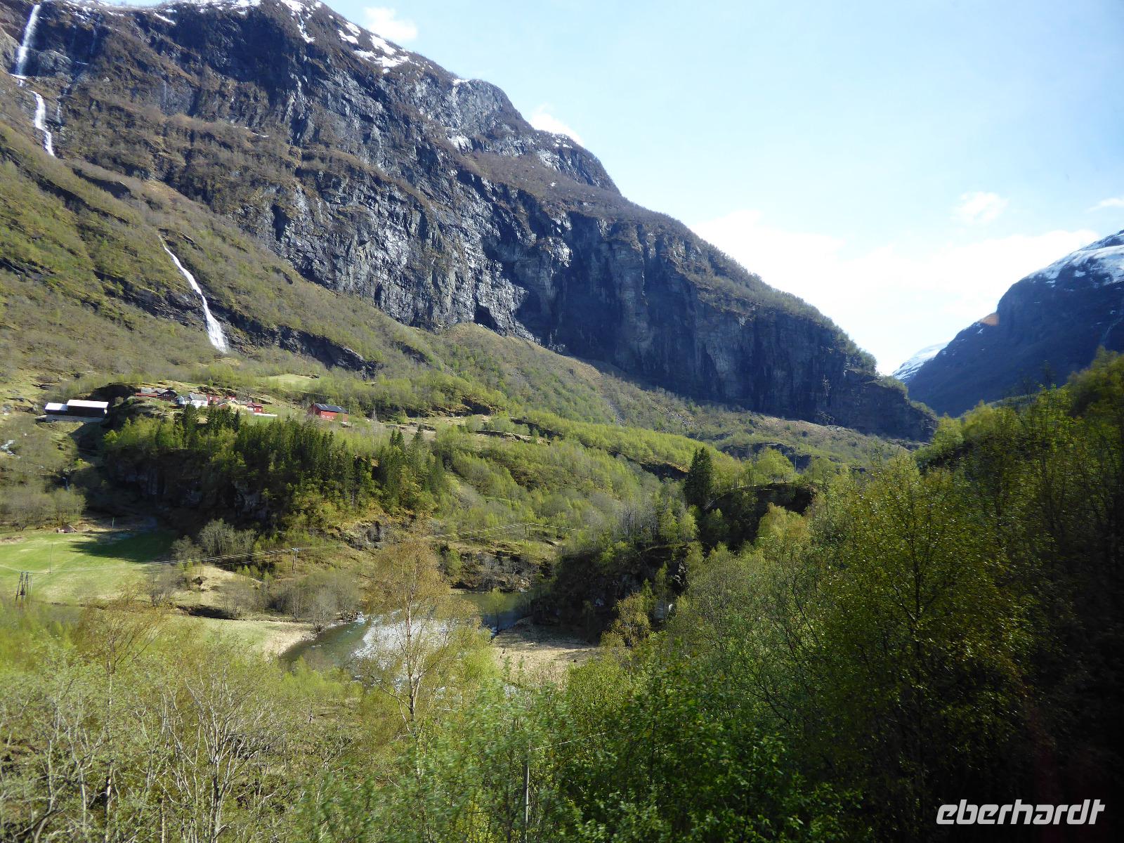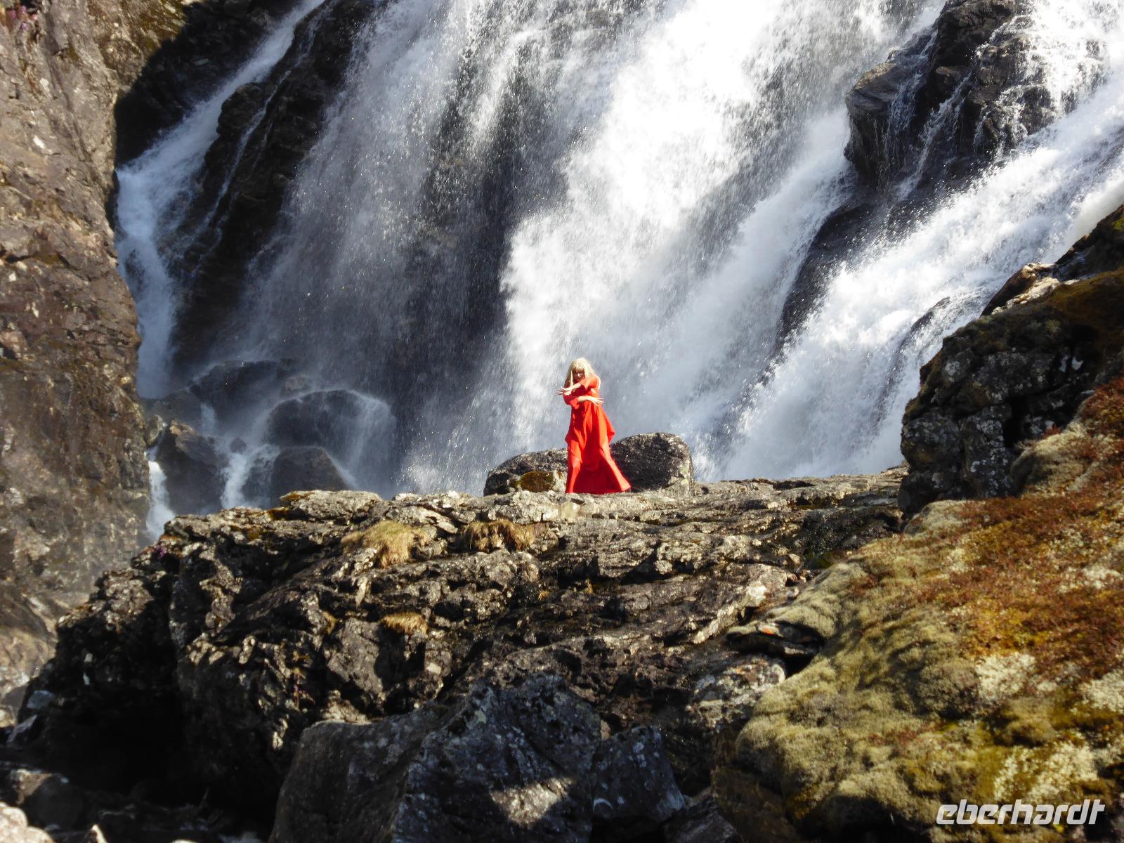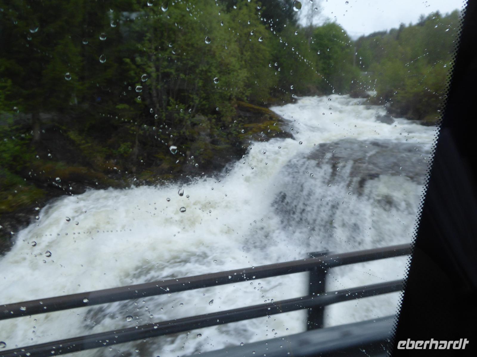 Kulinarisch und kulturell gesättigt setzen wir unseren Weg fort. Wir fahren durch den Laerdalstunnel, mit fast 25 Kilometern Länge der längste Straßentunnel der Welt. Nach fünf Kilometern ist der Tunnel blau illuminiert. Nach zehn Minuten haben wir die Hälfte des Tunnels durchquert, nach zwanzig erblicken wir wieder das Licht der Welt. Jetzt ist es nicht mehr weit bis nach Flam. Am Bahnhof haben wir Zeit, den Souvenirshop zu erobern und unser Geld los zu werden. 16.05 Uhr fährt die Bahn pünktlich ab. Wir haben Glück, es ist nicht voll und wir haben das ganze Abteil für uns allein. So können wir zum Fotografieren von rechts nach links und wieder zurück wechseln. Regelmäßig gibt es Durchsagen (auch auf Deutsch), wo wir uns befinden und was es hier zu sehen gibt. Am Wasserfall Kjosfossen legt der Zug eine fünfminütige Pause ein, wo wir den Zug verlassen und fotografieren können. Plötzlich erklingt Musik und Huldrene, die Fee im roten Kleid, versucht mit einem Tanz, die Männer zu sich in den Wasserfall zu locken. Zum Glück erliegt kein Herr aus unserer Gruppe dem sirenenartigen Gesang und wir setzen vollzählig die Fahrt fort. Nach einer Stunde kommen wir in Myrdal an. Wir haben einen Aufenthalt von gut fünfzig Minuten, können hier Kaffee trinken oder Eis essen. Nun steigen wir in die Bergenbahn. Im Gegensatz zur Flambahn, die vorrangig von Touristen genutzt wird, ist diese ein Regelzug, der aber durch eine nicht minder attraktive Landschaft fährt. Noch einmal eine Stunde Fahrt und wir sind in Geilo, wo uns Toralf mit dem Bus erwartet. Gegen 19 Uhr treffen wir im gemütlichen 3-Sterne Hotel Bardola Hoyfjellshotel ein. Wir beziehen unsere Balkonzimmer und genießen anschließend das hervorragende Abend-Buffet.