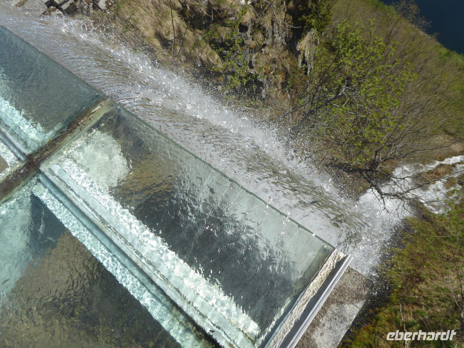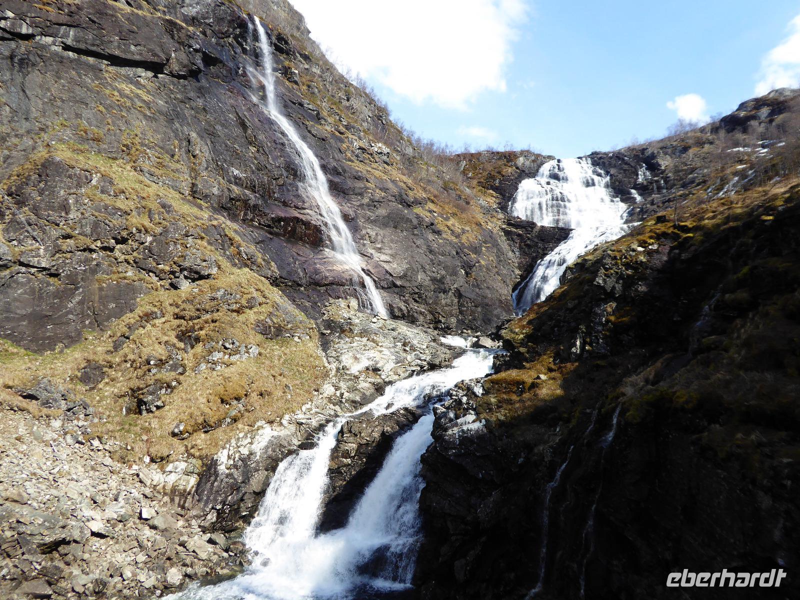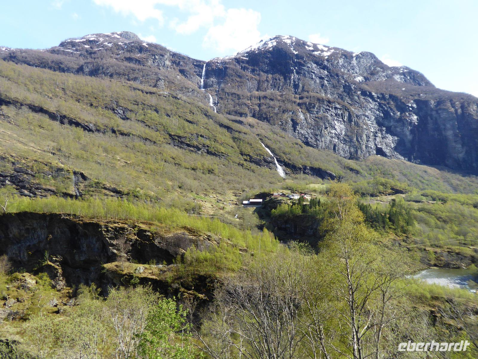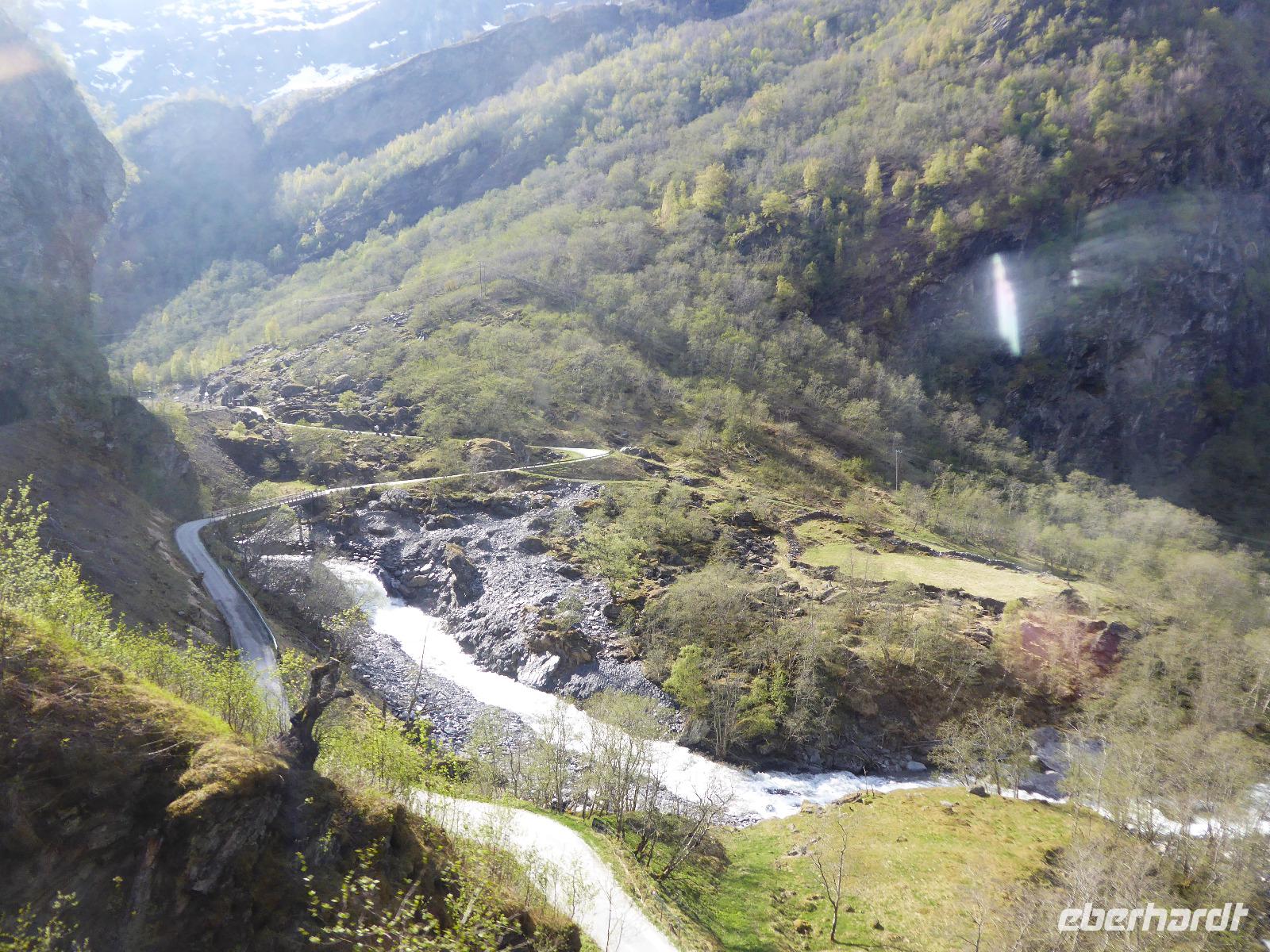 Kulinarisch und kulturell gesättigt setzen wir unseren Weg fort. Wir fahren durch den Laerdalstunnel, mit fast 25 Kilometern Länge der längste Straßentunnel der Welt. Nach fünf Kilometern ist der Tunnel blau illuminiert. Nach zehn Minuten haben wir die Hälfte des Tunnels durchquert, nach zwanzig erblicken wir wieder das Licht der Welt. Jetzt ist es nicht mehr weit bis nach Flam. Am Bahnhof haben wir Zeit, den Souvenirshop zu erobern und unser Geld los zu werden. 16.05 Uhr fährt die Bahn pünktlich ab. Wir haben Glück, es ist nicht voll und wir haben das ganze Abteil für uns allein. So können wir zum Fotografieren von rechts nach links und wieder zurück wechseln. Regelmäßig gibt es Durchsagen (auch auf Deutsch), wo wir uns befinden und was es hier zu sehen gibt. Am Wasserfall Kjosfossen legt der Zug eine fünfminütige Pause ein, wo wir den Zug verlassen und fotografieren können. Plötzlich erklingt Musik und Huldrene, die Fee im roten Kleid, versucht mit einem Tanz, die Männer zu sich in den Wasserfall zu locken. Zum Glück erliegt kein Herr aus unserer Gruppe dem sirenenartigen Gesang und wir setzen vollzählig die Fahrt fort. Nach einer Stunde kommen wir in Myrdal an. Wir haben einen Aufenthalt von gut fünfzig Minuten, können hier Kaffee trinken oder Eis essen. Nun steigen wir in die Bergenbahn. Im Gegensatz zur Flambahn, die vorrangig von Touristen genutzt wird, ist diese ein Regelzug, der aber durch eine nicht minder attraktive Landschaft fährt. Noch einmal eine Stunde Fahrt und wir sind in Geilo, wo uns Toralf mit dem Bus erwartet. Gegen 19 Uhr treffen wir im gemütlichen 3-Sterne Hotel Bardola Hoyfjellshotel ein. Wir beziehen unsere Balkonzimmer und genießen anschließend das hervorragende Abend-Buffet.