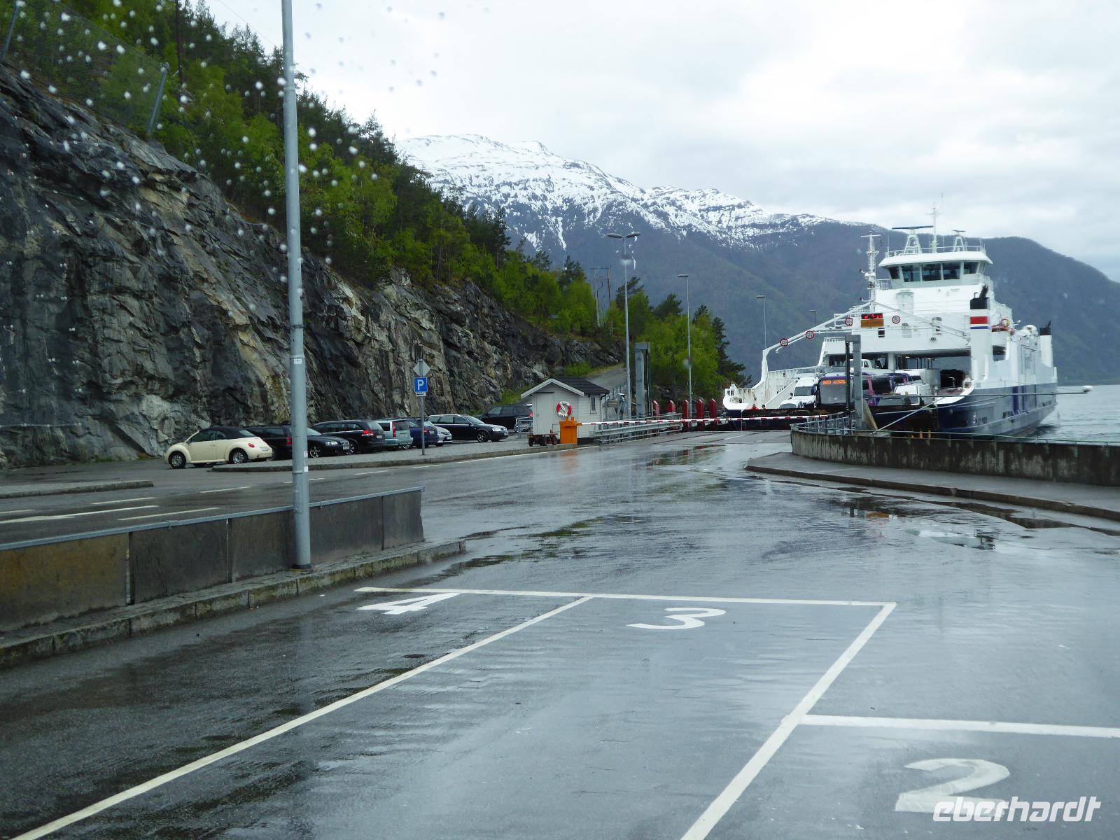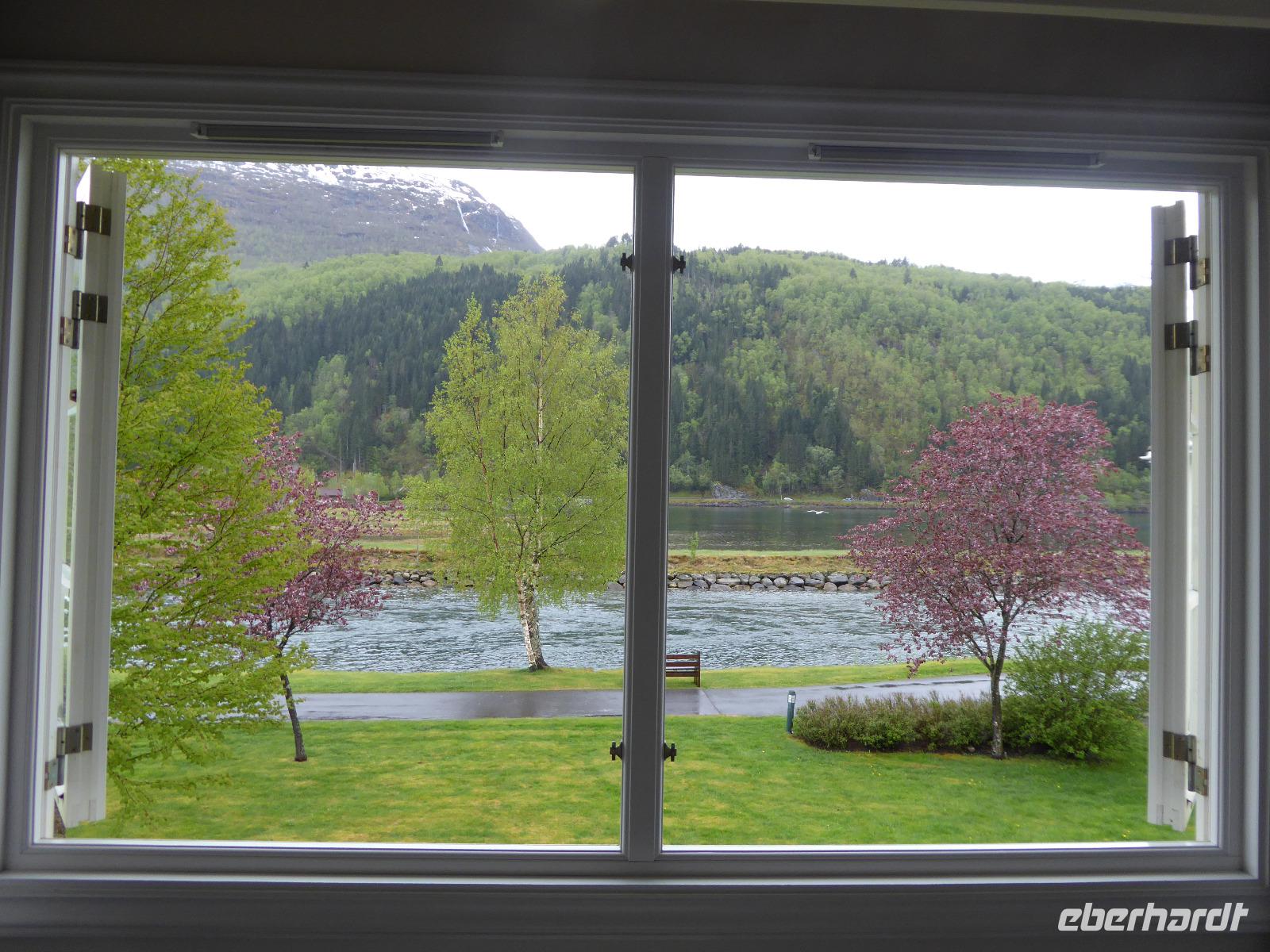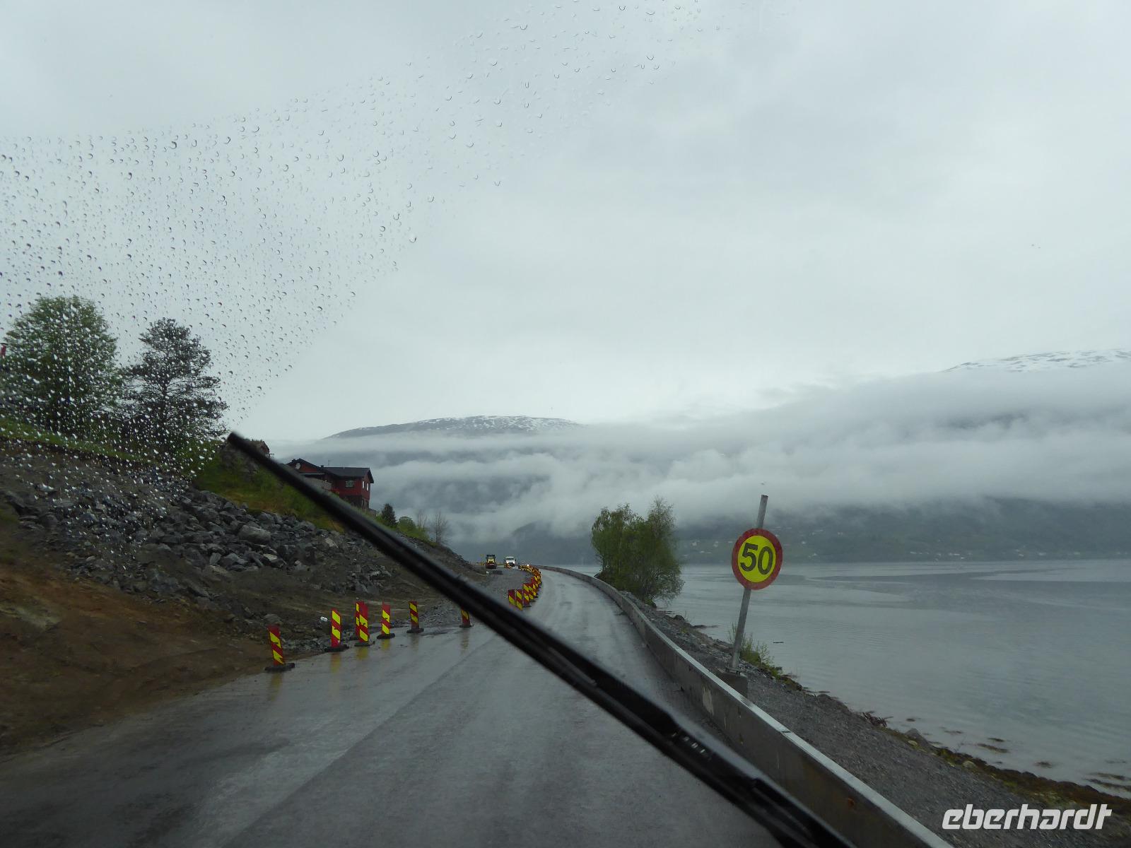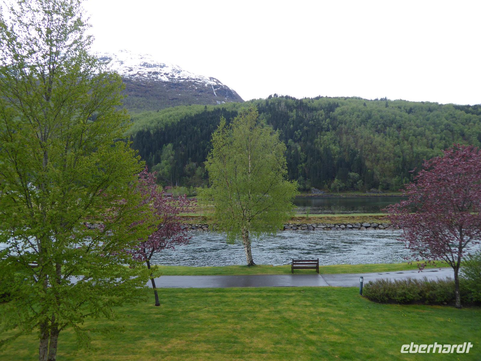 Zum Glück sitzen wir heute fast den ganzen Tag im Bus. Es will einfach nicht aufhören zu regnen. Auf Grund der örtlichen Gegebenheiten in Norwegen, bleibt uns erst einmal nichts Anderes übrig, als einen Teil der Strecke, den wir gestern schon gefahren sind, noch einmal zu absolvieren. Wir fahren Richtung Gol und von dort nach Borgund. Hier kennen wir bereits das Besucherzentrum und die sauberen WCs. Was sein muss, muss sein. Außerdem können wir nun die Leckereien, auf die wir gestern verzichtet haben und es abends bereuten (Ach, hätte ich doch nur, das und das.... mitgenommen...) endlich einkaufen. So gibt es für alle Bonbons aus der einheimischen Dropsfabrik. Von Borgund ist es nicht mehr weit bis nach Fodnes, wo wir mit der Fähre nach Mannheller übersetzen. Es regnet weiter. Auf einem idyllisch gelegenen Parkplatz, der bei sonnigem Wetter zu traumhaften Fotos einladen würde, verspeisen wir im Bus unsere Mittagswürstchen. Am Nachmittag besuchen wir das Gletschermuseum in Fjaerland. Am Eingang befindet sich eine Skulptur mit echtem Gletschereis. Wie oft das wohl nachgelegt werden muss? Ein aufrecht stehender Eisbär bewacht den Eingang zum Kinosaal. Hier entsteht auch unser Gruppenfoto. Wir schauen uns gemeinsam den Multivisionsfilm über eine Tour zum Gletscher an. Danach hat jeder Zeit, die Ausstellung individuell zu besichtigen, Kaffee zu trinken oder Souvenirs zu kaufen. Bei weiteren Regenschauern fahren wir nun am Joestedalsbreen Nationalpark vorbei bis nach Loen zu unserem Hotel. Unterwegs erleben wir, wie entspannt die Norweger mit ihren Straßenbaustellen umgehen. Keine Ampeln, keine Arbeiter, die Autos mit Fähnchen durchwinken. Die Fahrer müssen und können das alles selbst regeln. So ist das hier. Die einzigen, die sich darüber aufregen, sind wir. Das Hotel, das wir dann bald erreichen, liegt direkt am Fjord und wir haben einen tollen Ausblick auf diesen und die Berge. Am Abend erwartet uns wieder ein überaus reichhaltiges und schmackhaftes Buffet.
