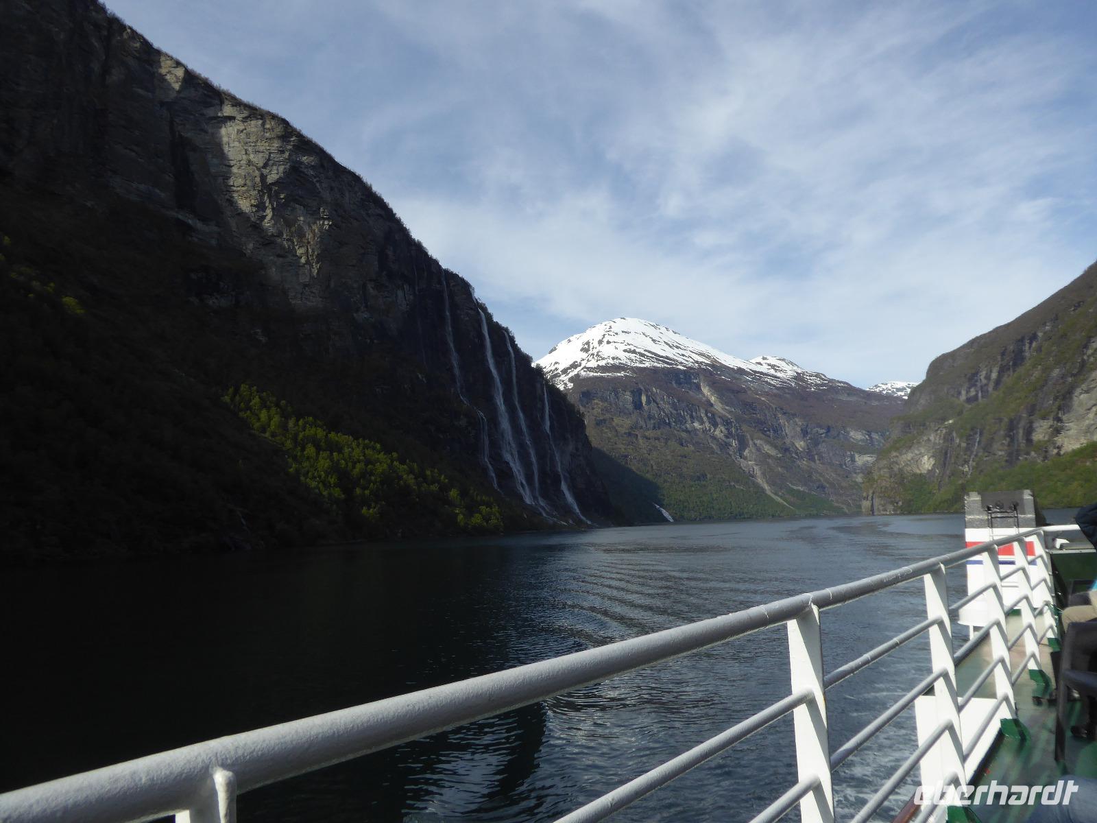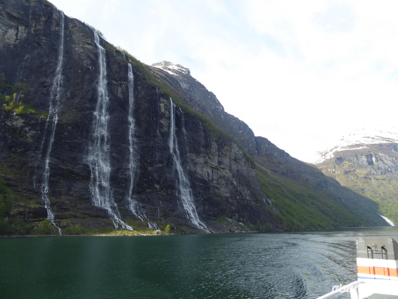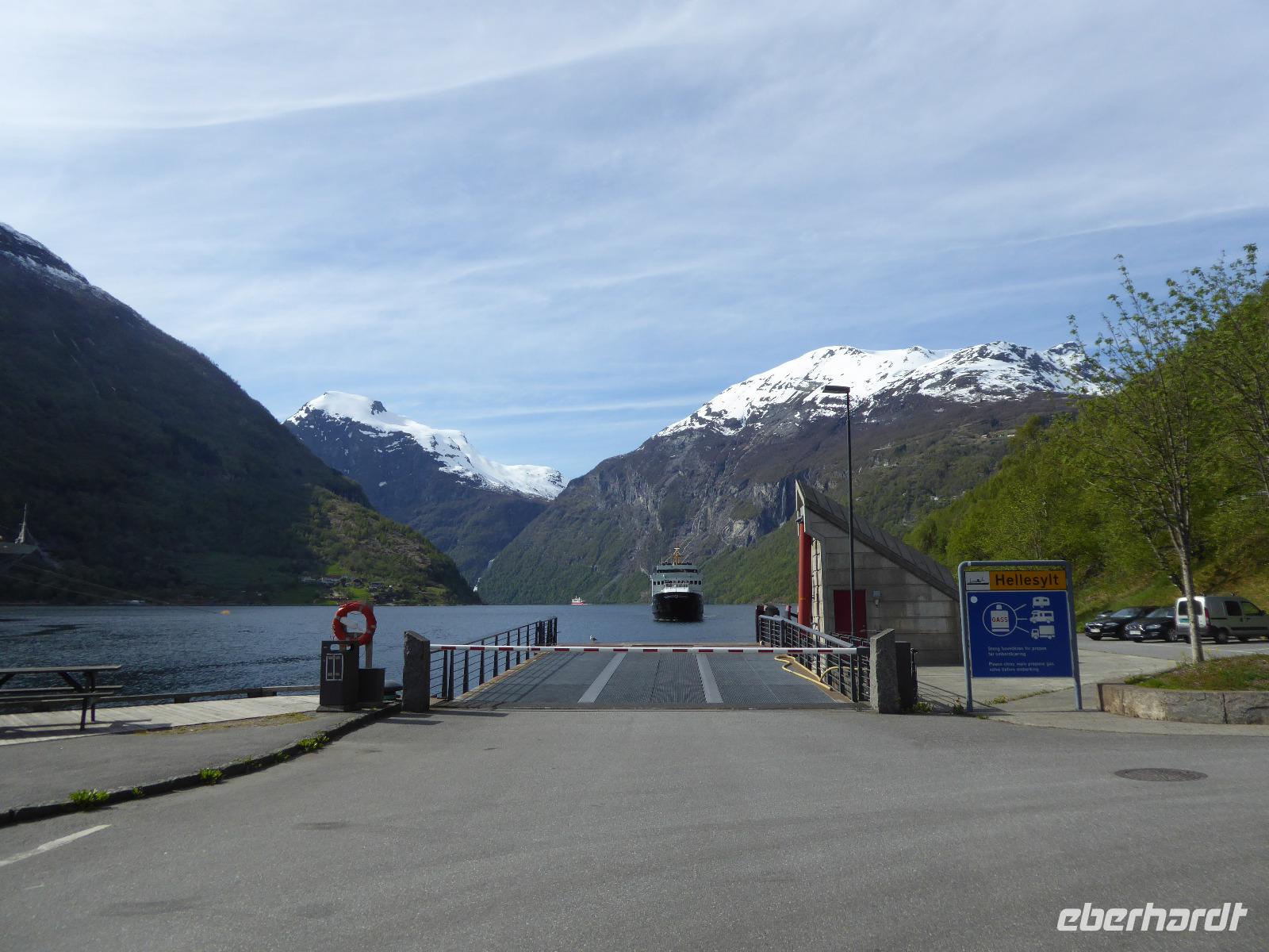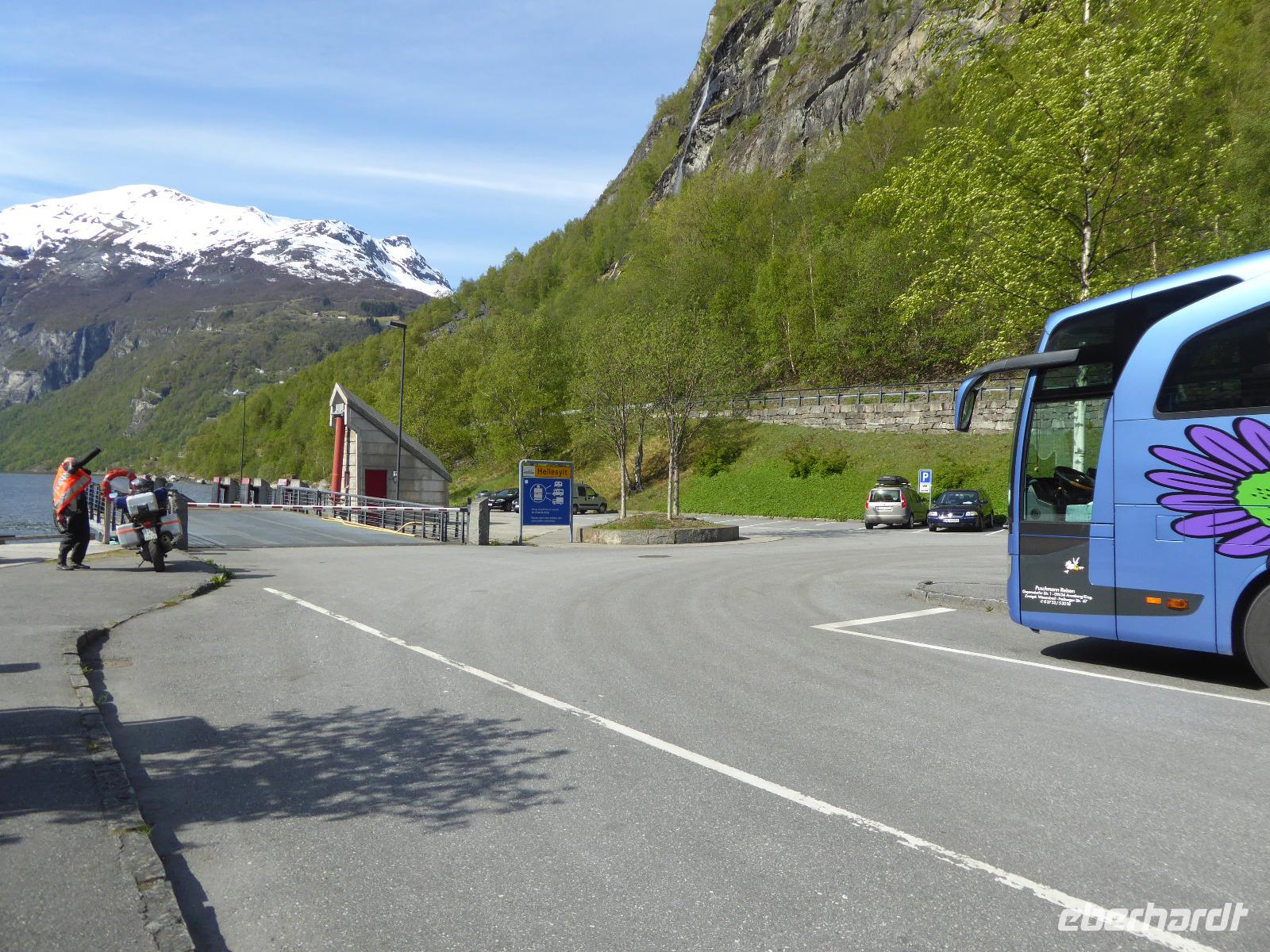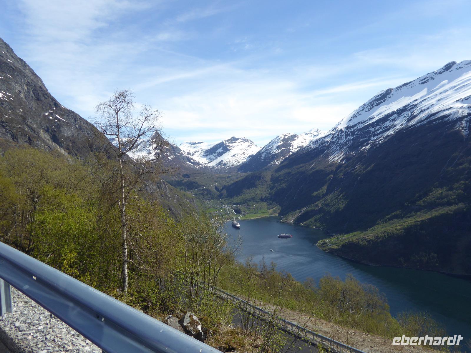 Im Urlaub soll man sich auch erholen. Und am Feiertag erst recht. Gemütlich können wir bis zehn Uhr frühstücken, dann die Sonne und die tollen Ausblicke genießen (oh ja, man glaubt es nicht - die Sonne scheint!). Erst um zwölf beginnt heute unser Ausflug. Auf der Straße 39 fahren wir den Fjord entlang, bis wir auf die 60 abbiegen. 64 Kilometer sind es bis Stranda, wo unsere erste Fährüberfahrt stattfindet. Heute ist der Nationalfeiertag der Norweger. Alle Häuser sind beflaggt. Ab und zu sehen wir ein paar gut gekleidete Menschen und auch einige in Nationaltracht. An einem Aussichtspunkt legen wir einen Stopp zum Fotografieren ein. Bald schon haben wir Stranda erreicht und setzen nach Liabygda über. Wir sind ganz knapp noch auf die Fähre gekommen, anderenfalls hätten wir eben eine halbe Stunde gewartet. So geschieht es dann in Vallda, wo wir nach Eidsdal fahren wollen, die Fähre aber gerade weg ist. Macht nichts. Wir haben sowieso vor, eine kleine Mittagspause einzulegen. Und unter strahlend blauem Himmel mit Sonnenschein schmecken die Würstchen doch nochmal so gut. Von Eidsdal fahren wir Richtung Geiranger. Auf der Adlerstraße muss unser Toralf ganze elf Nadelkurven bewältigen. An der Adlerkehre machen wir nochmals zu einem ausgiebigen Fotostopp Halt. In Geiranger bleibt uns fast eine Stunde bis unser Boot kommt. Trotz Feiertag hat der Souvenirladen geöffnet, was sich umsatztechnisch eben lohnt. Wir tragen unseren Teil dazu bei. Gegen 16.45 Uhr dürfen wir zu Fuß unser Schiff betreten. Toralf muss mit dem Bus noch etwas warten. Doch pünktlich um 17 Uhr fahren wir ab. Eine Stunde Traumschifffahrt durch den Geirangerfjord. Einfach großartig. Vorbei an den Sieben Schwestern und dem Freier, der noch heute aus der Flasche trinkt, schippert unser Boot durch die traumhafte Landschaft. Gegen 18 Uhr kommen wir in Hellesylt an. Noch eine Stunde Busfahrt zum Hotel und schon ruft wieder unser leckeres Abendessen.