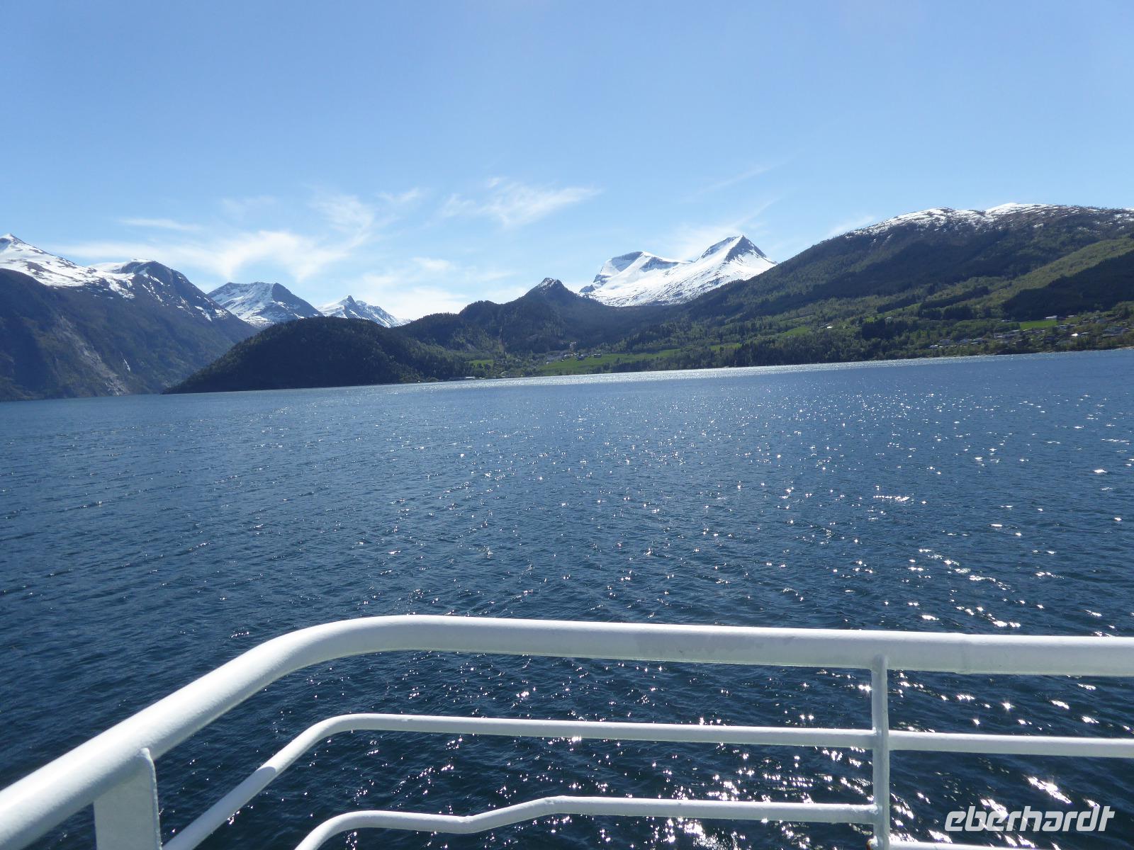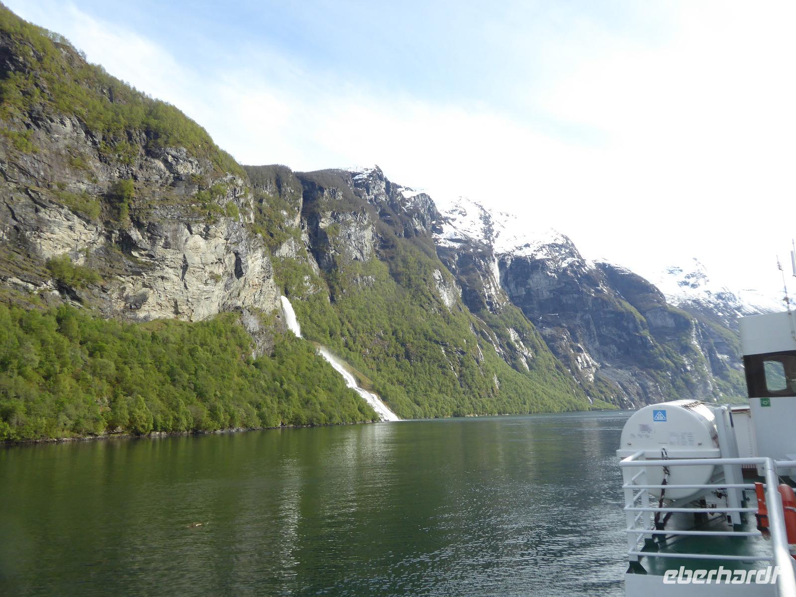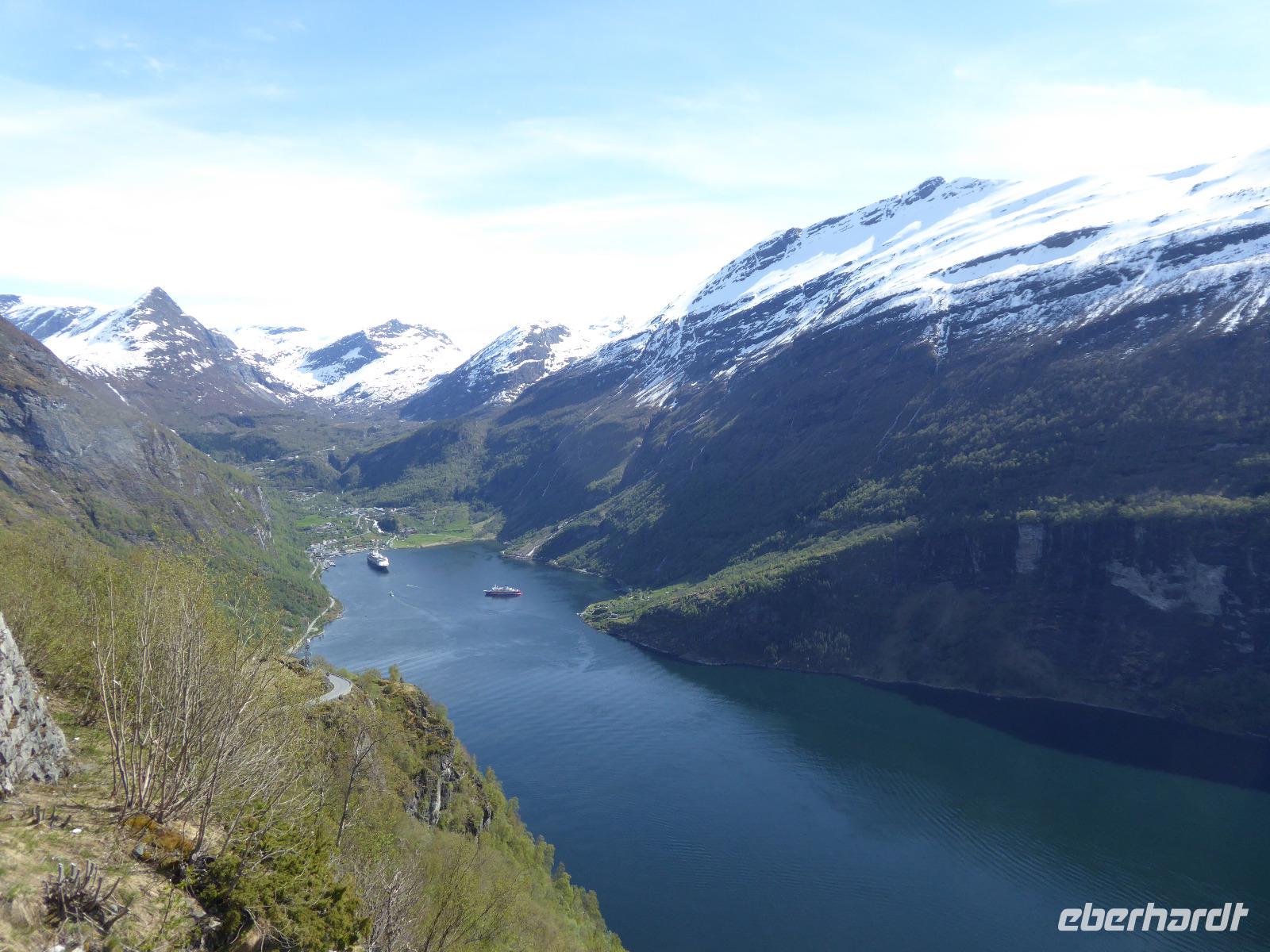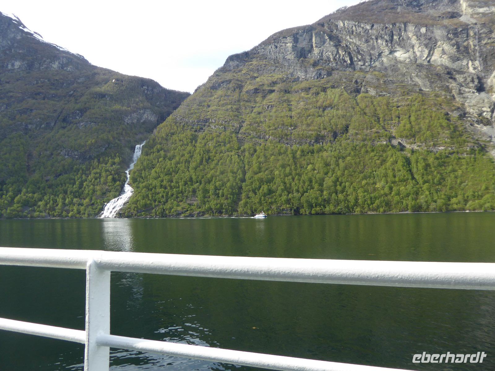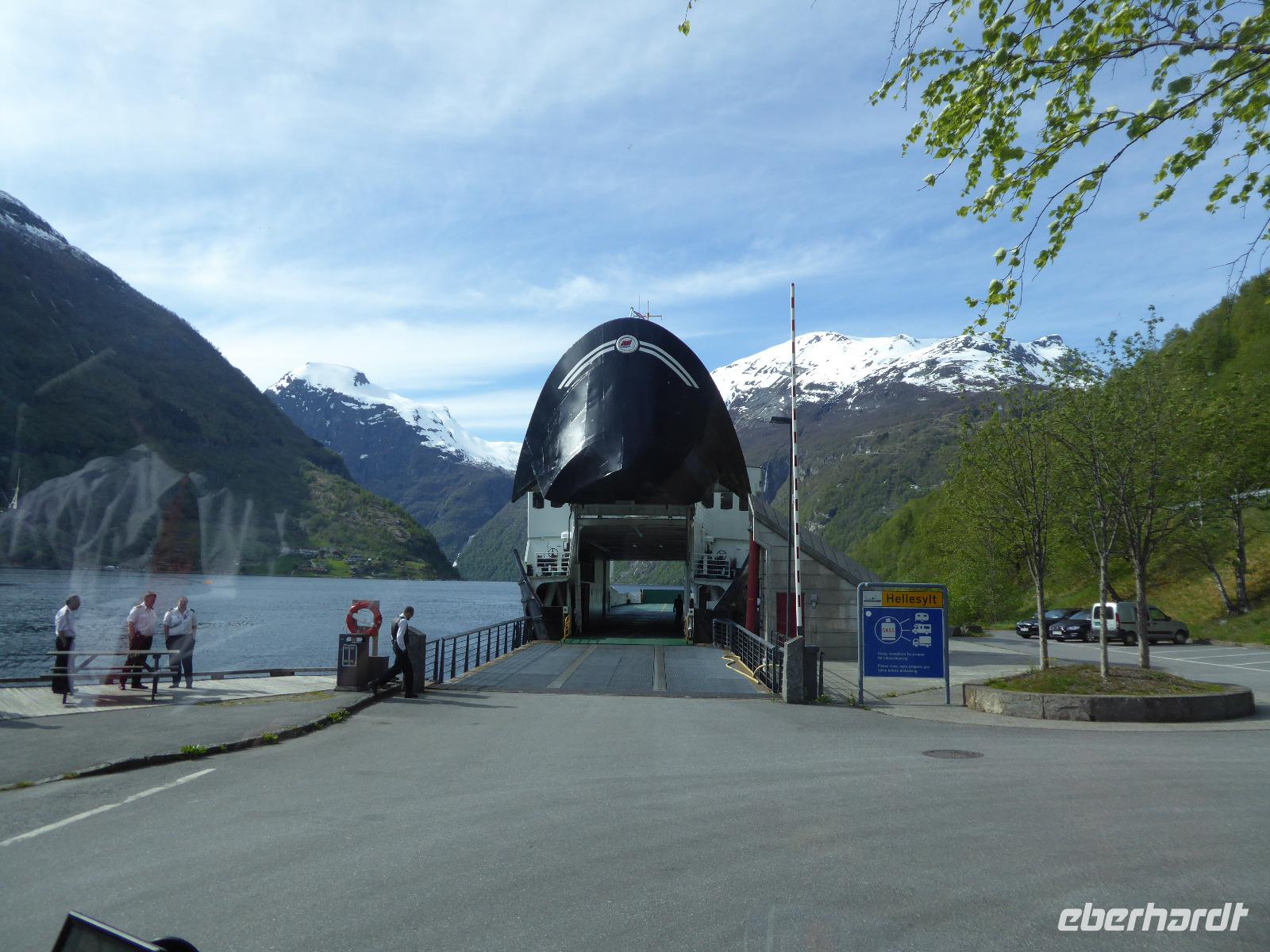 Im Urlaub soll man sich auch erholen. Und am Feiertag erst recht. Gemütlich können wir bis zehn Uhr frühstücken, dann die Sonne und die tollen Ausblicke genießen (oh ja, man glaubt es nicht - die Sonne scheint!). Erst um zwölf beginnt heute unser Ausflug. Auf der Straße 39 fahren wir den Fjord entlang, bis wir auf die 60 abbiegen. 64 Kilometer sind es bis Stranda, wo unsere erste Fährüberfahrt stattfindet. Heute ist der Nationalfeiertag der Norweger. Alle Häuser sind beflaggt. Ab und zu sehen wir ein paar gut gekleidete Menschen und auch einige in Nationaltracht. An einem Aussichtspunkt legen wir einen Stopp zum Fotografieren ein. Bald schon haben wir Stranda erreicht und setzen nach Liabygda über. Wir sind ganz knapp noch auf die Fähre gekommen, anderenfalls hätten wir eben eine halbe Stunde gewartet. So geschieht es dann in Vallda, wo wir nach Eidsdal fahren wollen, die Fähre aber gerade weg ist. Macht nichts. Wir haben sowieso vor, eine kleine Mittagspause einzulegen. Und unter strahlend blauem Himmel mit Sonnenschein schmecken die Würstchen doch nochmal so gut. Von Eidsdal fahren wir Richtung Geiranger. Auf der Adlerstraße muss unser Toralf ganze elf Nadelkurven bewältigen. An der Adlerkehre machen wir nochmals zu einem ausgiebigen Fotostopp Halt. In Geiranger bleibt uns fast eine Stunde bis unser Boot kommt. Trotz Feiertag hat der Souvenirladen geöffnet, was sich umsatztechnisch eben lohnt. Wir tragen unseren Teil dazu bei. Gegen 16.45 Uhr dürfen wir zu Fuß unser Schiff betreten. Toralf muss mit dem Bus noch etwas warten. Doch pünktlich um 17 Uhr fahren wir ab. Eine Stunde Traumschifffahrt durch den Geirangerfjord. Einfach großartig. Vorbei an den Sieben Schwestern und dem Freier, der noch heute aus der Flasche trinkt, schippert unser Boot durch die traumhafte Landschaft. Gegen 18 Uhr kommen wir in Hellesylt an. Noch eine Stunde Busfahrt zum Hotel und schon ruft wieder unser leckeres Abendessen.
