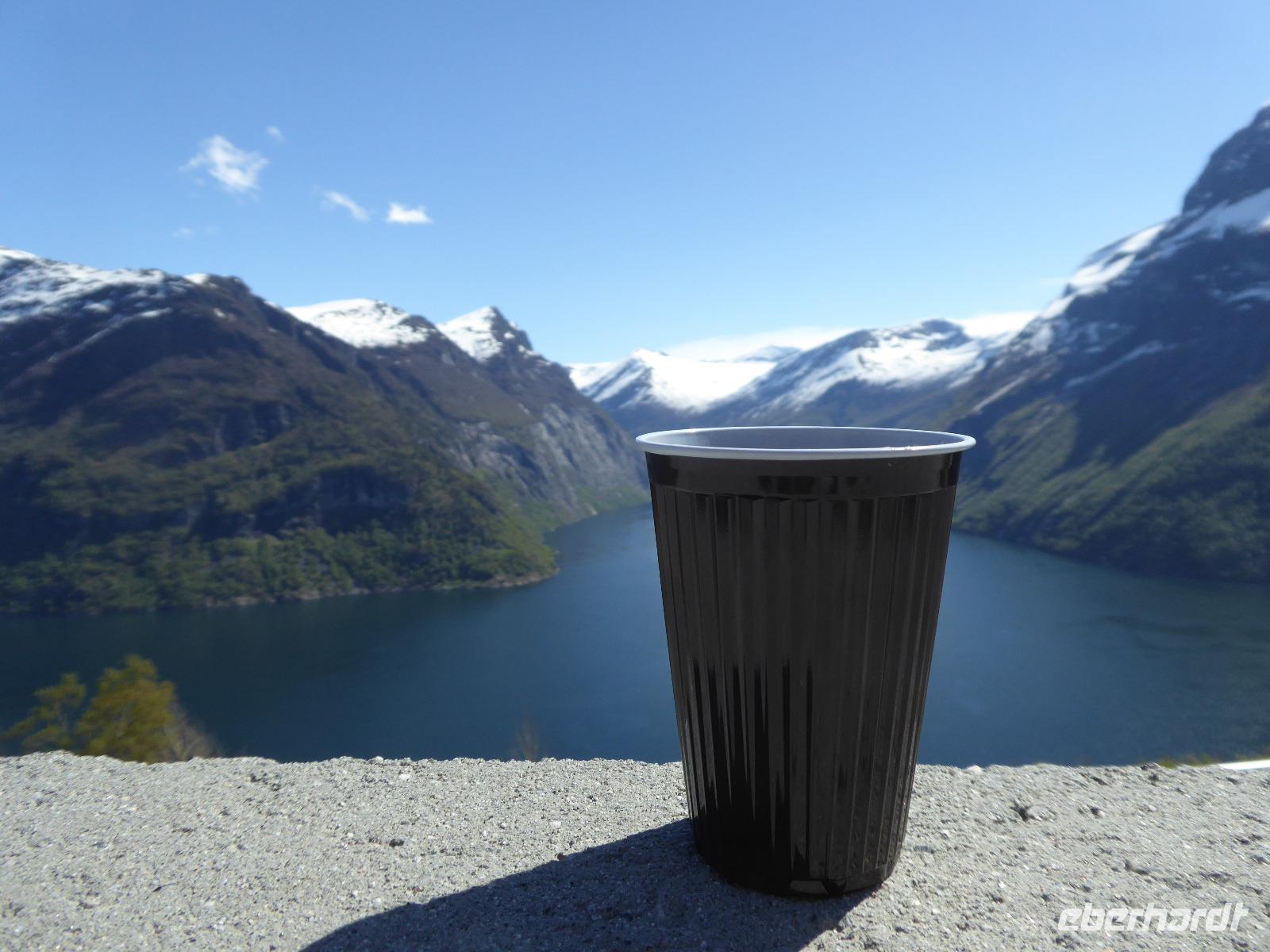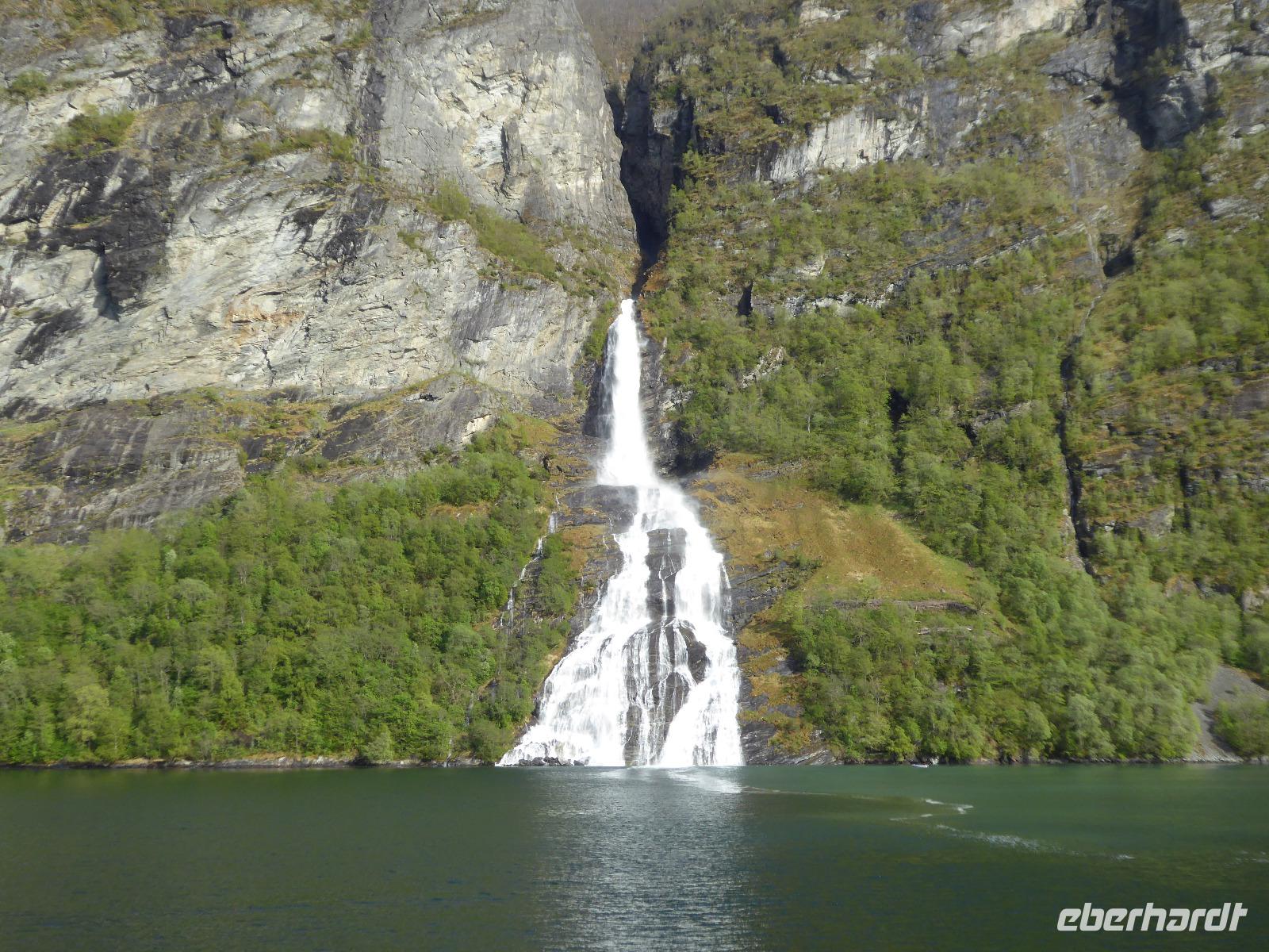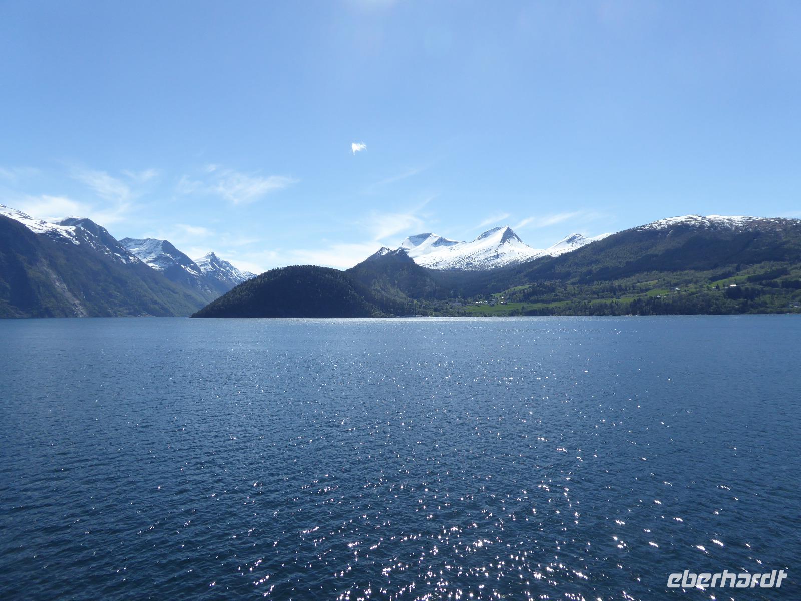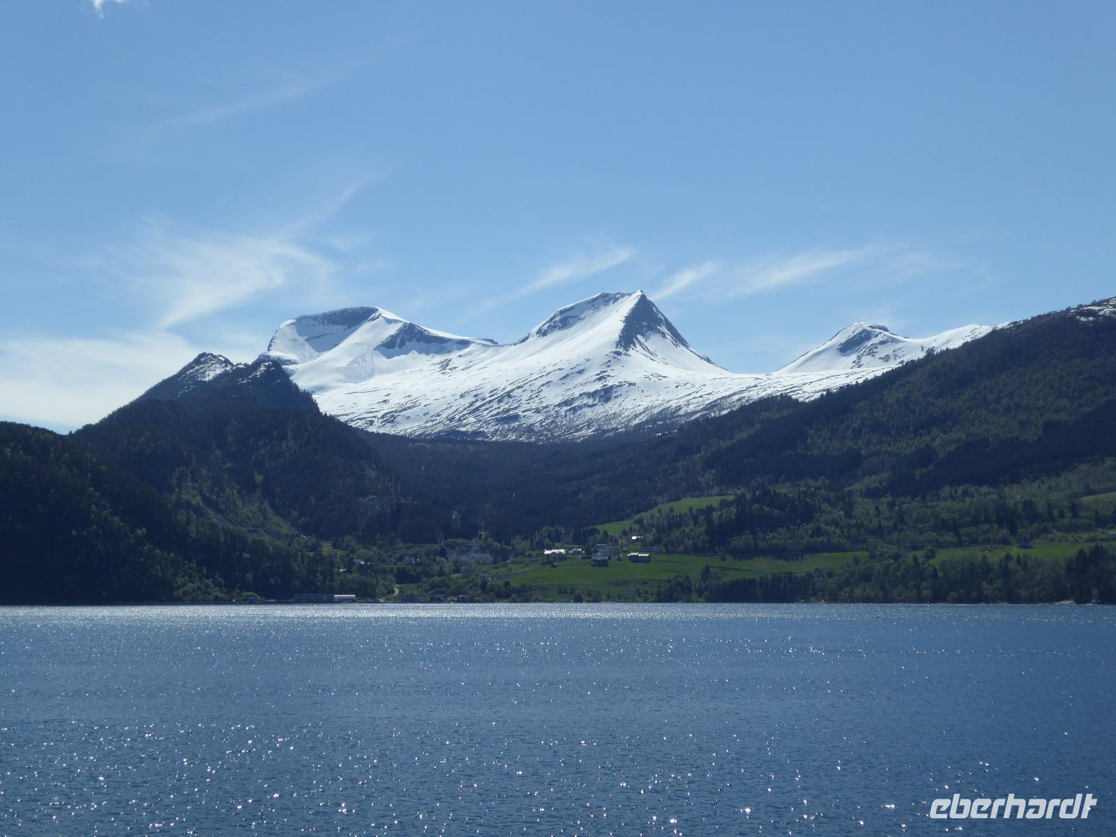 Im Urlaub soll man sich auch erholen. Und am Feiertag erst recht. Gemütlich können wir bis zehn Uhr frühstücken, dann die Sonne und die tollen Ausblicke genießen (oh ja, man glaubt es nicht - die Sonne scheint!). Erst um zwölf beginnt heute unser Ausflug. Auf der Straße 39 fahren wir den Fjord entlang, bis wir auf die 60 abbiegen. 64 Kilometer sind es bis Stranda, wo unsere erste Fährüberfahrt stattfindet. Heute ist der Nationalfeiertag der Norweger. Alle Häuser sind beflaggt. Ab und zu sehen wir ein paar gut gekleidete Menschen und auch einige in Nationaltracht. An einem Aussichtspunkt legen wir einen Stopp zum Fotografieren ein. Bald schon haben wir Stranda erreicht und setzen nach Liabygda über. Wir sind ganz knapp noch auf die Fähre gekommen, anderenfalls hätten wir eben eine halbe Stunde gewartet. So geschieht es dann in Vallda, wo wir nach Eidsdal fahren wollen, die Fähre aber gerade weg ist. Macht nichts. Wir haben sowieso vor, eine kleine Mittagspause einzulegen. Und unter strahlend blauem Himmel mit Sonnenschein schmecken die Würstchen doch nochmal so gut. Von Eidsdal fahren wir Richtung Geiranger. Auf der Adlerstraße muss unser Toralf ganze elf Nadelkurven bewältigen. An der Adlerkehre machen wir nochmals zu einem ausgiebigen Fotostopp Halt. In Geiranger bleibt uns fast eine Stunde bis unser Boot kommt. Trotz Feiertag hat der Souvenirladen geöffnet, was sich umsatztechnisch eben lohnt. Wir tragen unseren Teil dazu bei. Gegen 16.45 Uhr dürfen wir zu Fuß unser Schiff betreten. Toralf muss mit dem Bus noch etwas warten. Doch pünktlich um 17 Uhr fahren wir ab. Eine Stunde Traumschifffahrt durch den Geirangerfjord. Einfach großartig. Vorbei an den Sieben Schwestern und dem Freier, der noch heute aus der Flasche trinkt, schippert unser Boot durch die traumhafte Landschaft. Gegen 18 Uhr kommen wir in Hellesylt an. Noch eine Stunde Busfahrt zum Hotel und schon ruft wieder unser leckeres Abendessen.