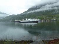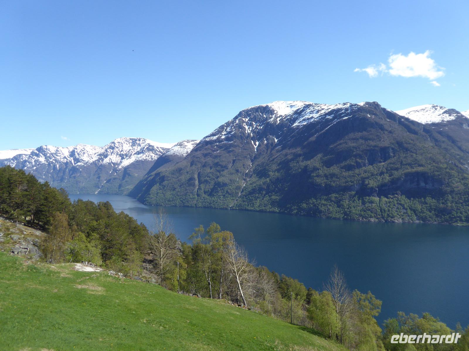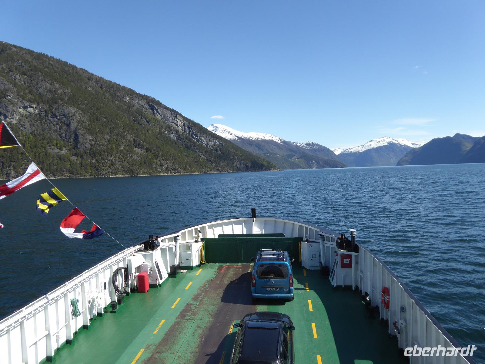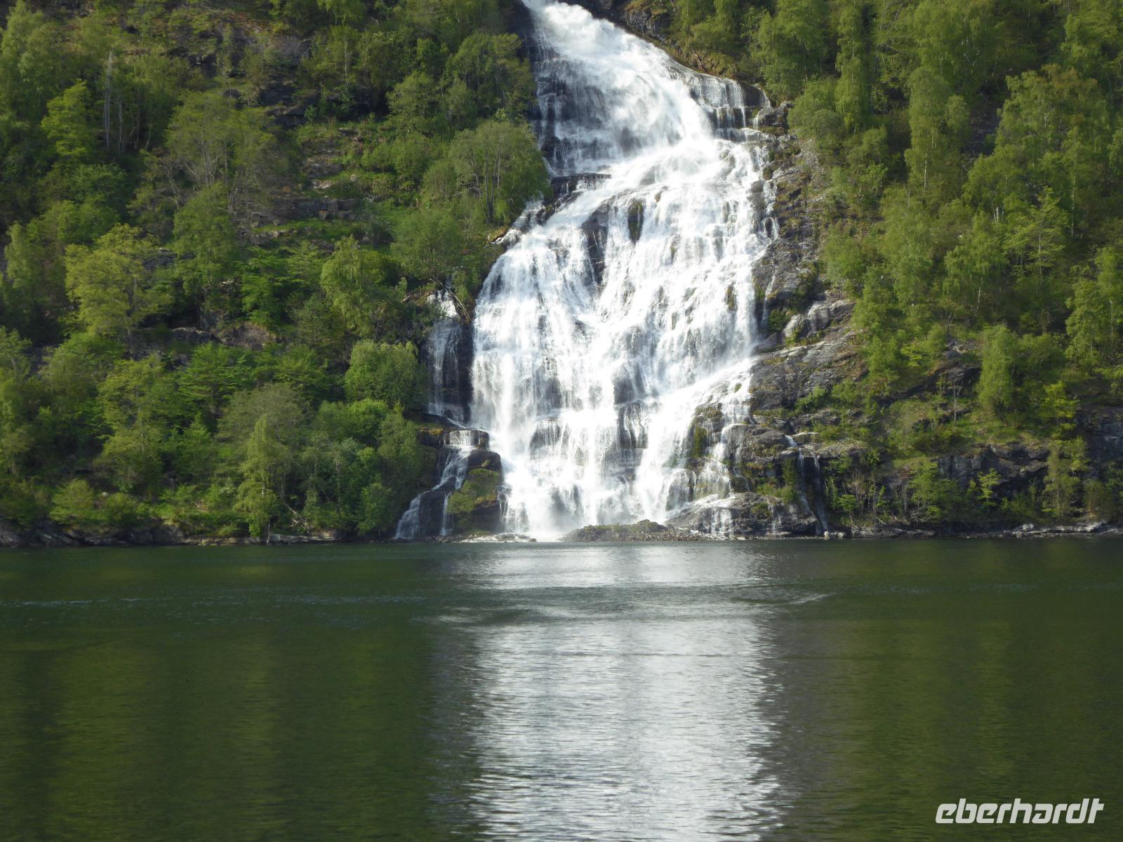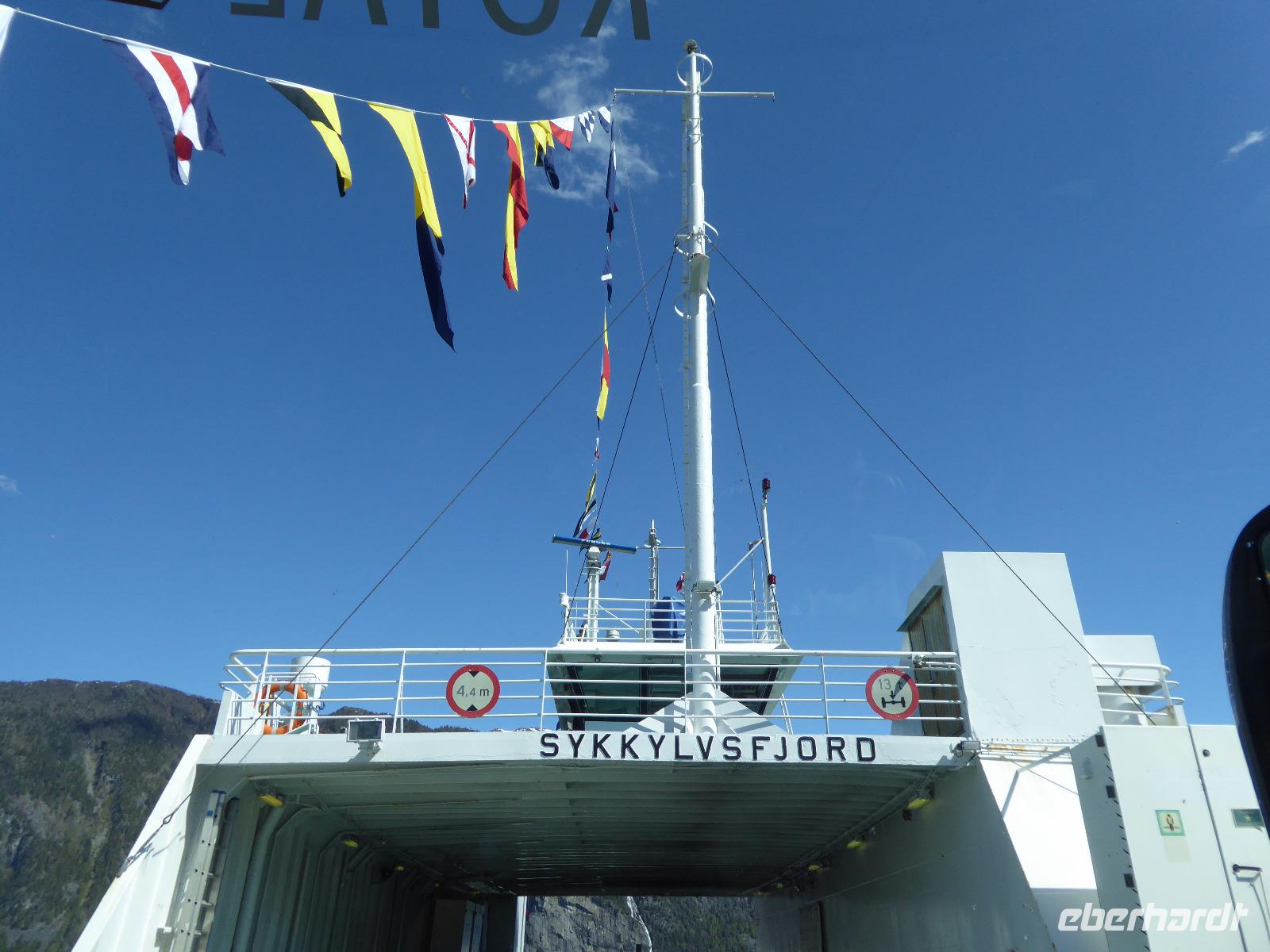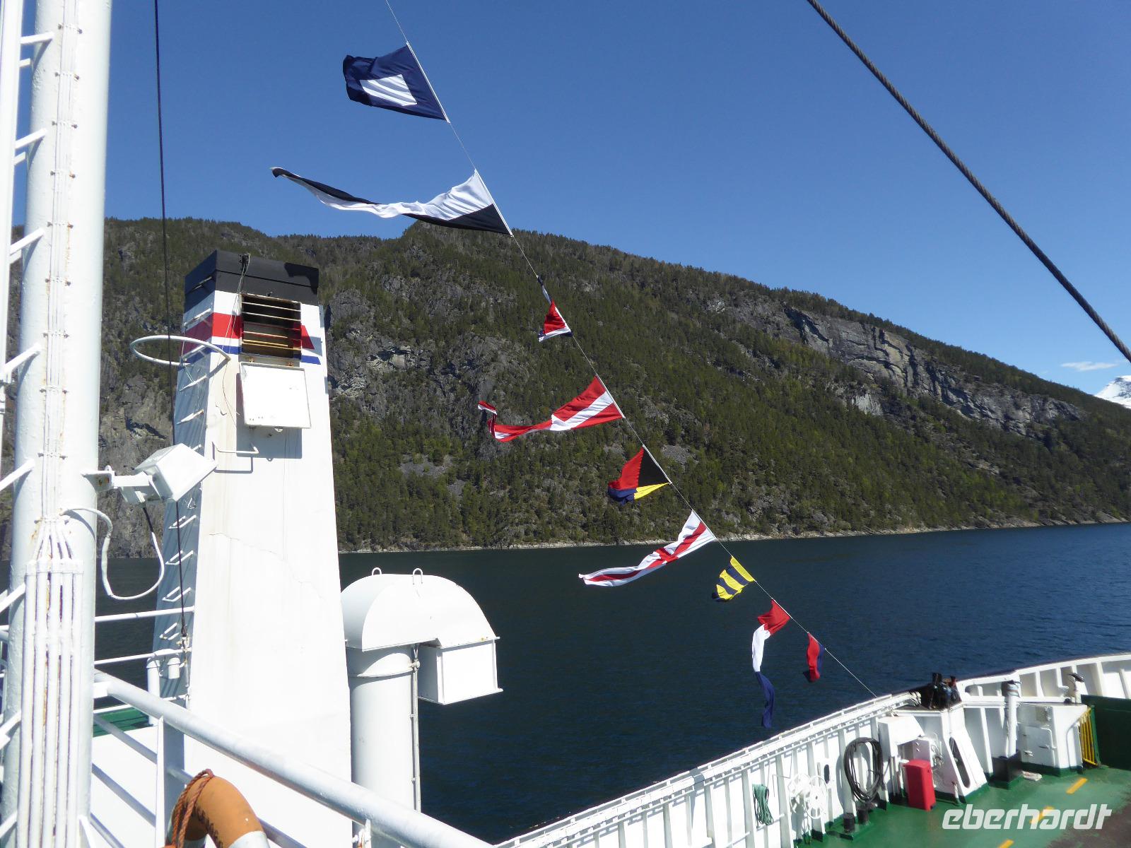 Im Urlaub soll man sich auch erholen. Und am Feiertag erst recht. Gemütlich können wir bis zehn Uhr frühstücken, dann die Sonne und die tollen Ausblicke genießen (oh ja, man glaubt es nicht - die Sonne scheint!). Erst um zwölf beginnt heute unser Ausflug. Auf der Straße 39 fahren wir den Fjord entlang, bis wir auf die 60 abbiegen. 64 Kilometer sind es bis Stranda, wo unsere erste Fährüberfahrt stattfindet. Heute ist der Nationalfeiertag der Norweger. Alle Häuser sind beflaggt. Ab und zu sehen wir ein paar gut gekleidete Menschen und auch einige in Nationaltracht. An einem Aussichtspunkt legen wir einen Stopp zum Fotografieren ein. Bald schon haben wir Stranda erreicht und setzen nach Liabygda über. Wir sind ganz knapp noch auf die Fähre gekommen, anderenfalls hätten wir eben eine halbe Stunde gewartet. So geschieht es dann in Vallda, wo wir nach Eidsdal fahren wollen, die Fähre aber gerade weg ist. Macht nichts. Wir haben sowieso vor, eine kleine Mittagspause einzulegen. Und unter strahlend blauem Himmel mit Sonnenschein schmecken die Würstchen doch nochmal so gut. Von Eidsdal fahren wir Richtung Geiranger. Auf der Adlerstraße muss unser Toralf ganze elf Nadelkurven bewältigen. An der Adlerkehre machen wir nochmals zu einem ausgiebigen Fotostopp Halt. In Geiranger bleibt uns fast eine Stunde bis unser Boot kommt. Trotz Feiertag hat der Souvenirladen geöffnet, was sich umsatztechnisch eben lohnt. Wir tragen unseren Teil dazu bei. Gegen 16.45 Uhr dürfen wir zu Fuß unser Schiff betreten. Toralf muss mit dem Bus noch etwas warten. Doch pünktlich um 17 Uhr fahren wir ab. Eine Stunde Traumschifffahrt durch den Geirangerfjord. Einfach großartig. Vorbei an den Sieben Schwestern und dem Freier, der noch heute aus der Flasche trinkt, schippert unser Boot durch die traumhafte Landschaft. Gegen 18 Uhr kommen wir in Hellesylt an. Noch eine Stunde Busfahrt zum Hotel und schon ruft wieder unser leckeres Abendessen.