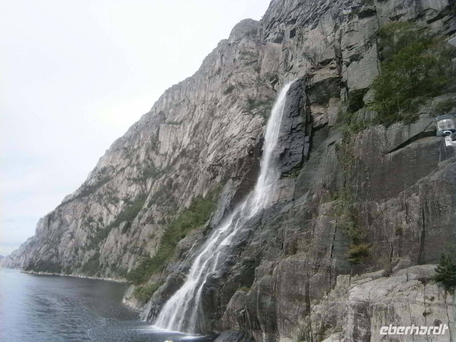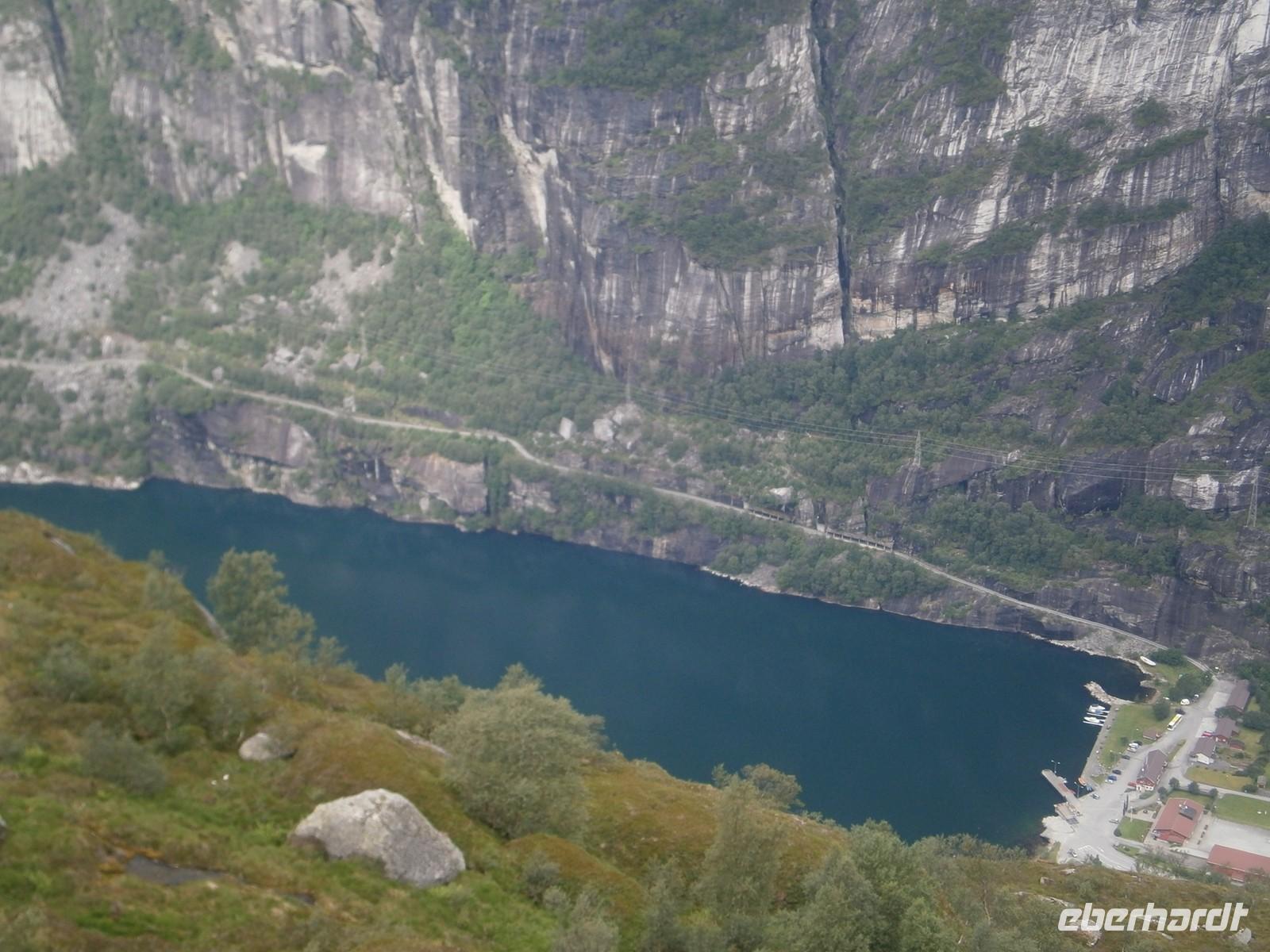 An seinem Ufer befindet sich eine der Hauptsehenswürdigkeiten des Landes. Der Prekestolen, die Kanzel, etwa 600 Meter über dem Fjord, ist ein großes Gebirgsplateau.
