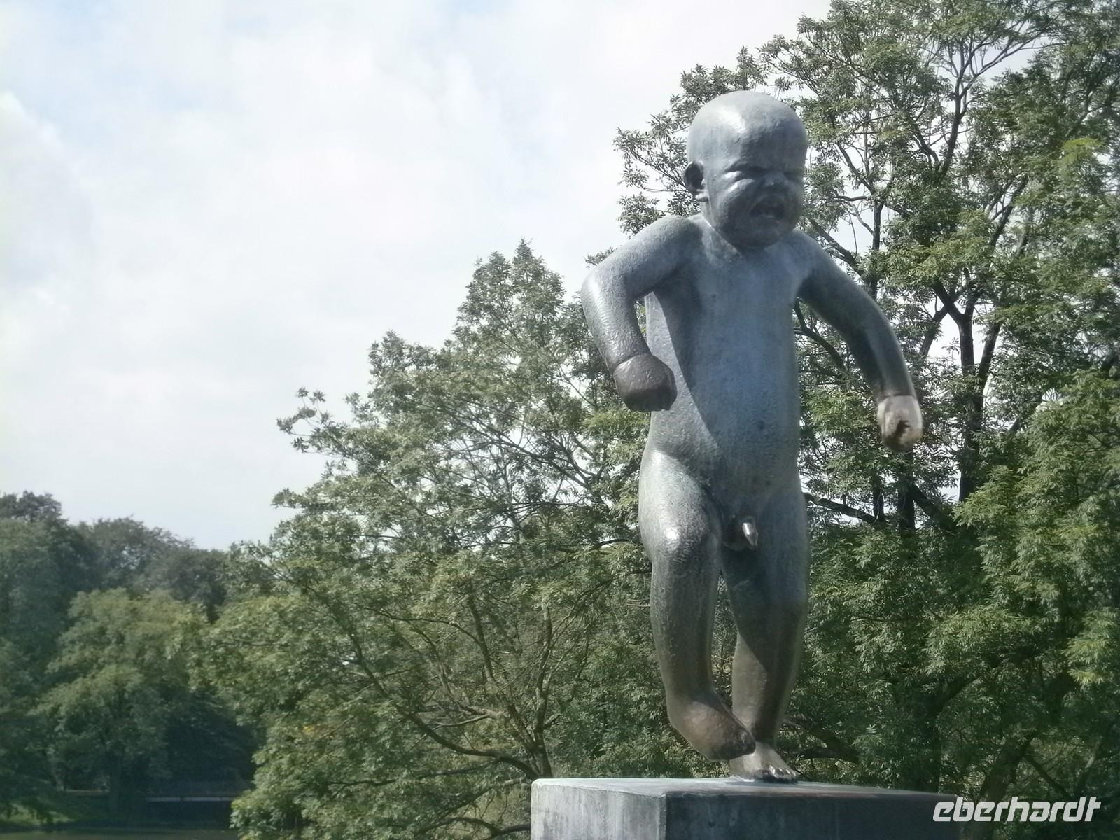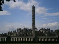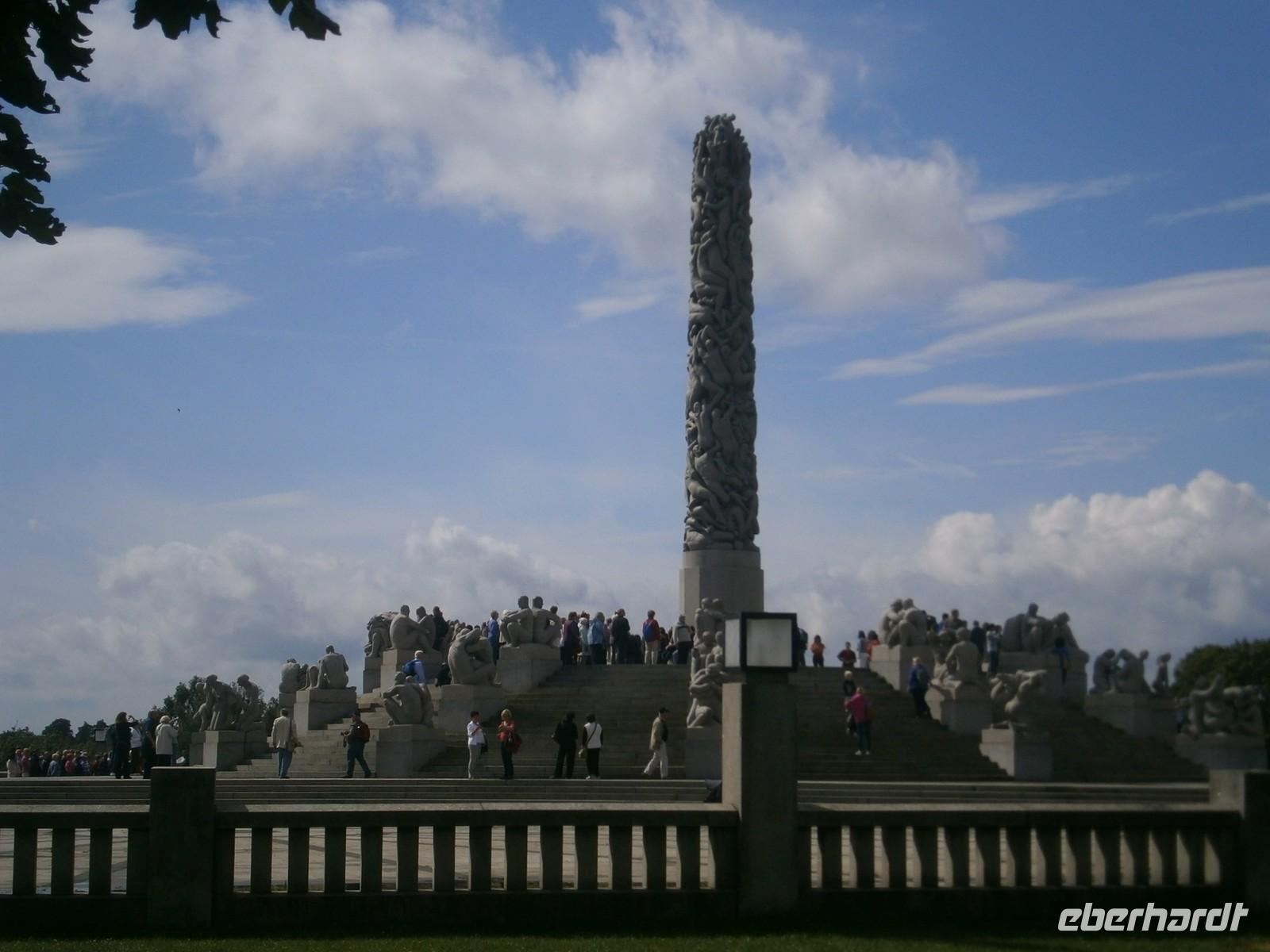 In Oslo immer wieder der Blick zum Himmel. Petrus hat ein einsehen und wir kommen trockenen Fußes durch den Vigelandpark. Die weitläufige Parkanlage ist ein Vermächtnis des Bildhauers Gustav Vigeland, durch dessen Geburtsort wir schon am 2. Reisetag hindurch gefahren sind. Am Anfang der 800 m langen Achse erhebt sich der 17 m hohe Monulit, eine Steinsäule, aus ineinander verschlungenen Menschenleibern. Unterhalb ein Brunnen, dessen Schale on einem Kreis starker Männer getragen wird. Mit jährlich über einer Million Besuchern zählt die Parkanlage zu den meist besuchten Sehenswürdigkeiten Oslos.