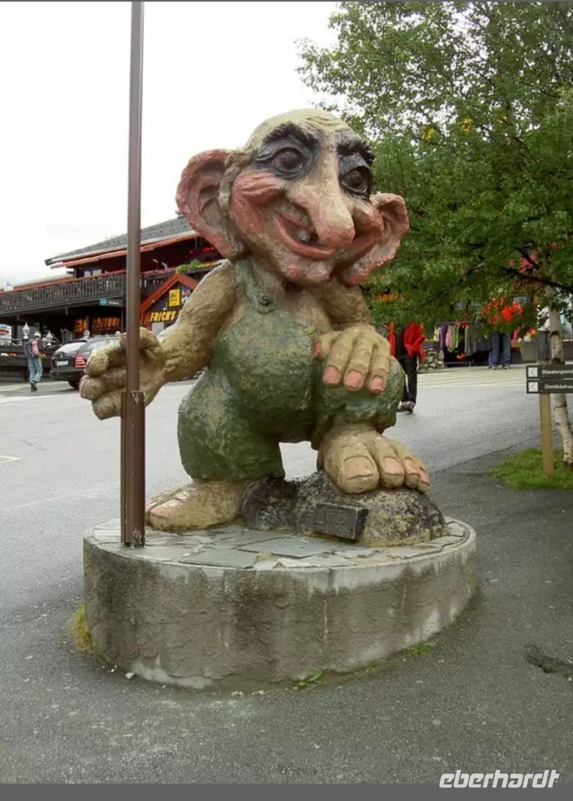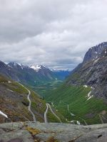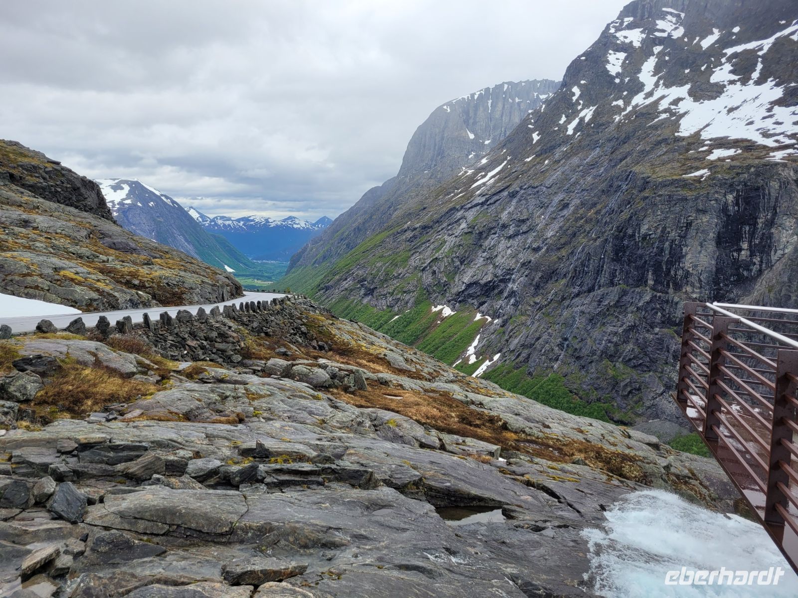 Unser erstes Ziel auf dem Weg nach Ålesund sind die legendären Trollstigen. Diese von hohen Gipfeln und tiefen Schluchten umgebene Bergstraße hat ihren Namen von der Volkssage um die dort „hausenden Trolle und Zwerge“. In elf Haarnadelkurven überwindet der Bus einen sagenhaften Höhenunterschied von über vierhundert Metern. Die Aussichtsplattform auf dem Sattel ist barrierefrei ausgebaut, so können wir die hinter uns liegende Aufahrt in einem Blick erfassen.