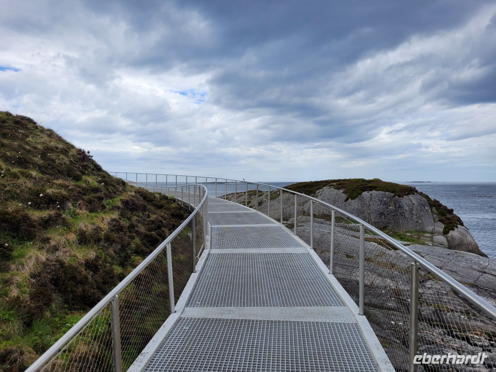 Durch einen imposanten Unterseetunnel erreichen wir dann die Atlantikstraße, die sich direkt am Meer entlang windet. Wir überqueren Brücken sowie Dämme und haben aus dem barrierefreien Bus heraus immer wieder faszinierende Ausblicke. Auf Skipholmen, der größten Insel der Gruppe, steigen wir aus und umrollen das Eiland auf dem trefflich barrierefrei angelegten Rundweg.