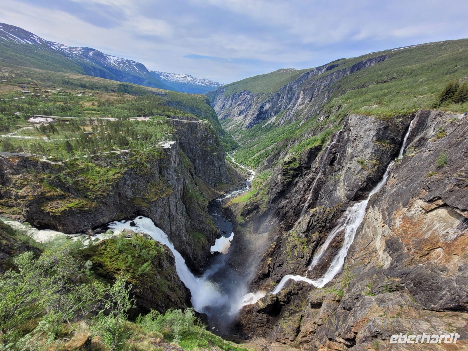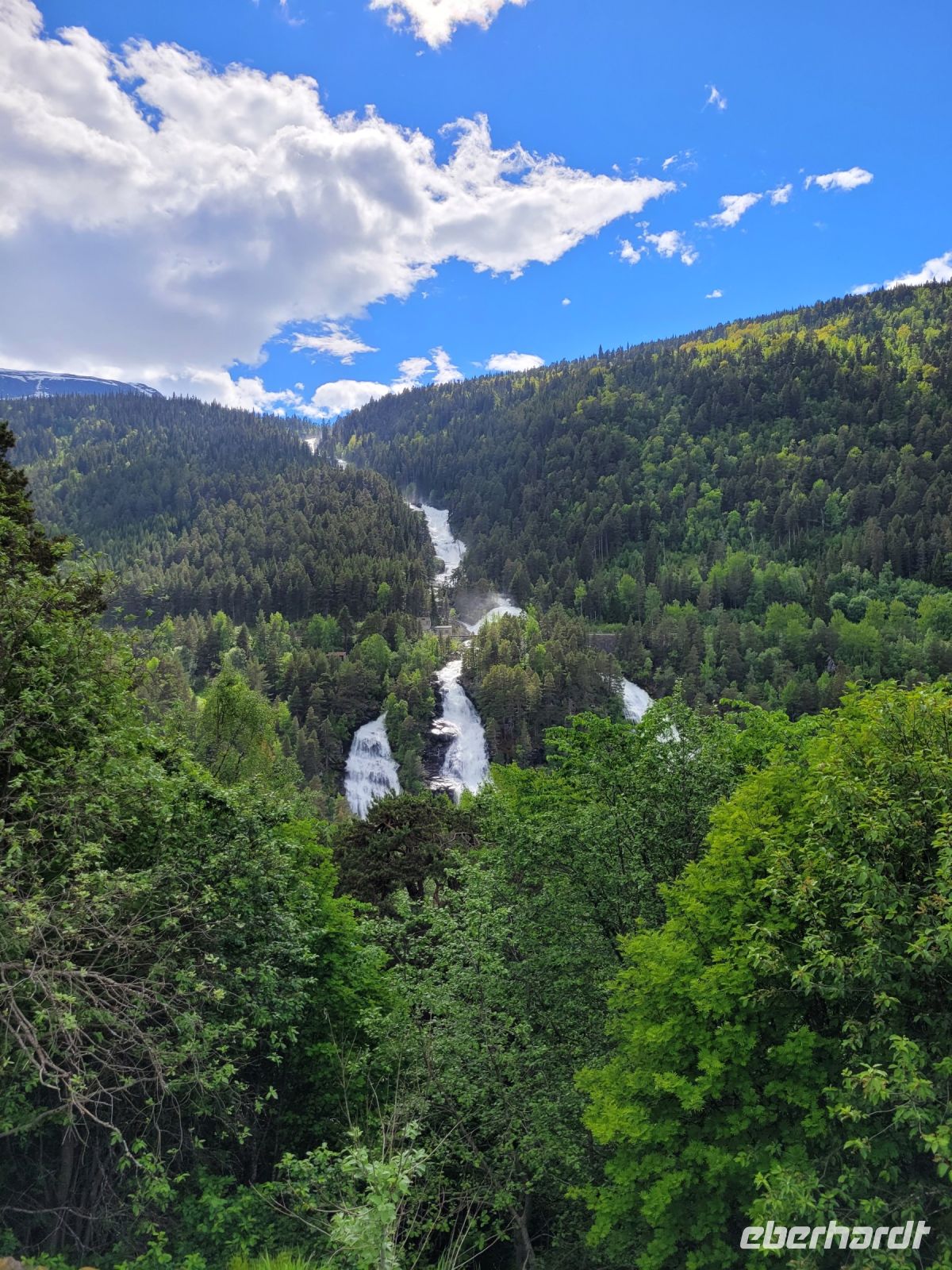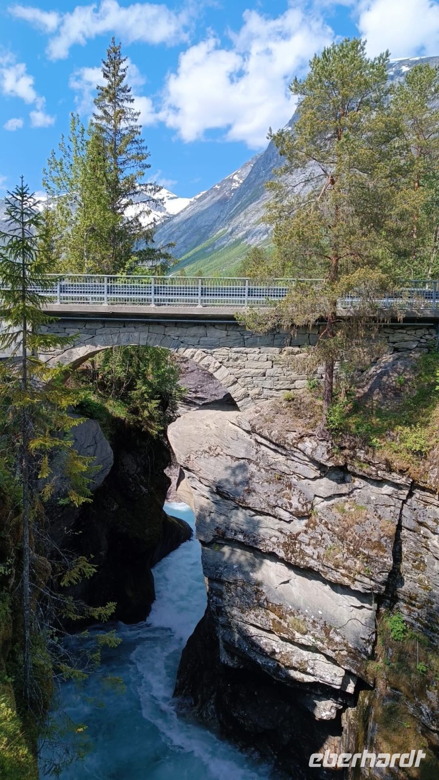 Unser letzter Ausflug von Molde aus sind die legendären Trollstigen. Diese von hohen Gipfeln und tiefen Schluchten umgebene Bergstraße hat ihren Namen von der Volkssage um die dort „hausenden Trolle und Zwerge“. In elf Haarnadelkurven überwindet der Bus einen sagenhaften Höhenunterschied von über vierhundert Metern. Die Aussichtsplattform auf dem Sattel ist barrierefrei ausgebaut, so können wir die hinter uns liegende Aufahrt in einem Blick erfassen. Durch eine noch von viel Schnee geprägte Landschaft, die Strasse ist erst seit einigen Tagen nach der Wintersperre wieder freigegeben, gelangen wir allmählich wieder talwärts, wo wir an den Stromschnellen der Gudbrandsjuvet den nächsten Aufenthalt haben. Nun geht es retour; die Befahrung der Trollstigen talwärts ist nicht minder spannend als die Auffahrt, dennoch bietet sie nochmal eine andere Perspektive. Schön beide Fahrvarianten erleben zu können. Ab Andalsnes auf alternativer Strecke wieder Richtung Hotel…