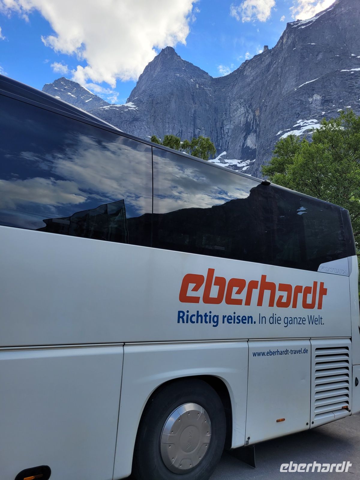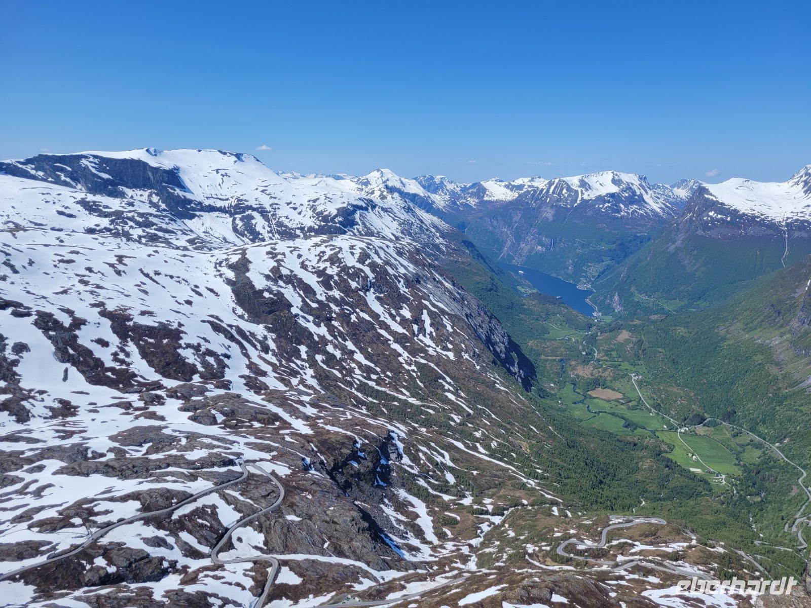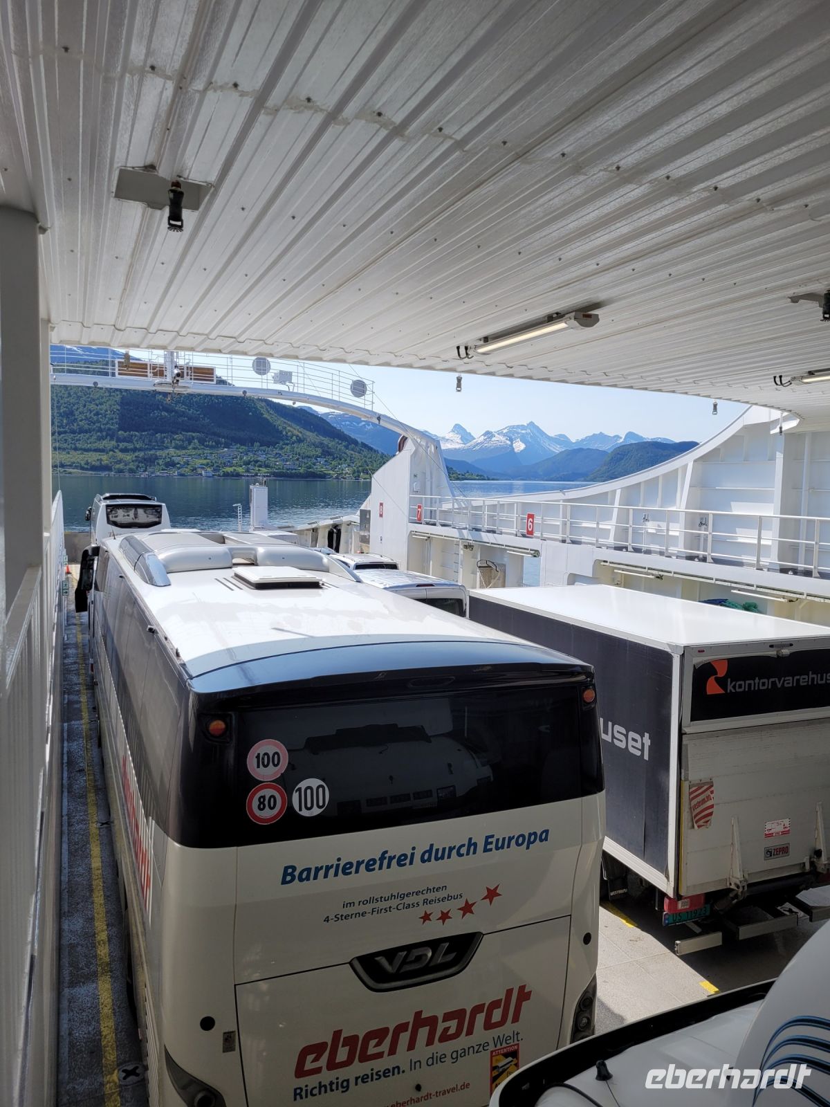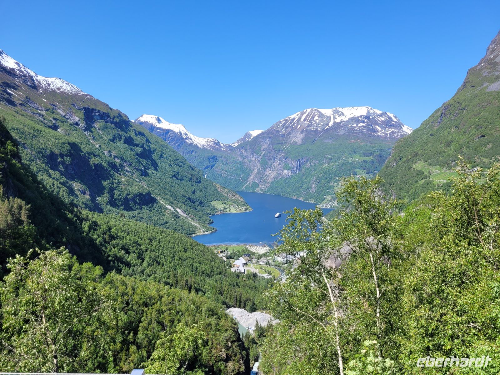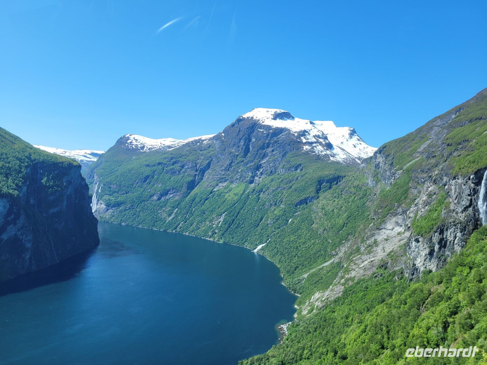 Am Morgen verlassen wir Molde unsere heutige Etappe führt nach Førde. Zunächst die gestern schon genutzte längere Fährpassage über den Romsdalsfjord nach Vestnes. Dann "erfahren" wir heute intensiv das Fjordland. Die Natur ist hier, abseits der Hauptverbindung der Europastraße, wahrhaft ein Erlebnis. Entlang tief eingeschnittener Fjorde, dem Straßenverlauf unterhalb gigantischer Bergketten folgend, erreichen wir zunächst den Geirangerfjord. Talwärts nutzen wir dabei die Adlerstraße, eine Passstraße die fast so spektakulär wie die erlebten Trollstigen ist. Die Auffahrt von Geiranger, der Geirangerstrasse nach einem Fotostopp auf den Fjord folgend, bringt uns wieder auf über eintausend Höhenmeter. Das perfekte Wetter; strahlender Sonnenschein und wolkenloser Himmel, veranlassen uns noch die Dalsnibba zu besuchen. Eindrücklich und unvergesslich der Blick aus 1500Metern Höhe auf den unter uns liegenden Geirangerfjord und die schneebedeckten Gipfel der Region. Schließlich erreichen wir Førde und beziehen dort unsere behindertengerechten Hotelzimmer. Unser Tagesresümee: Der Weg ist das Ziel…
