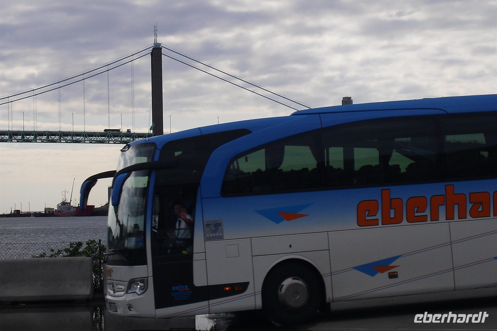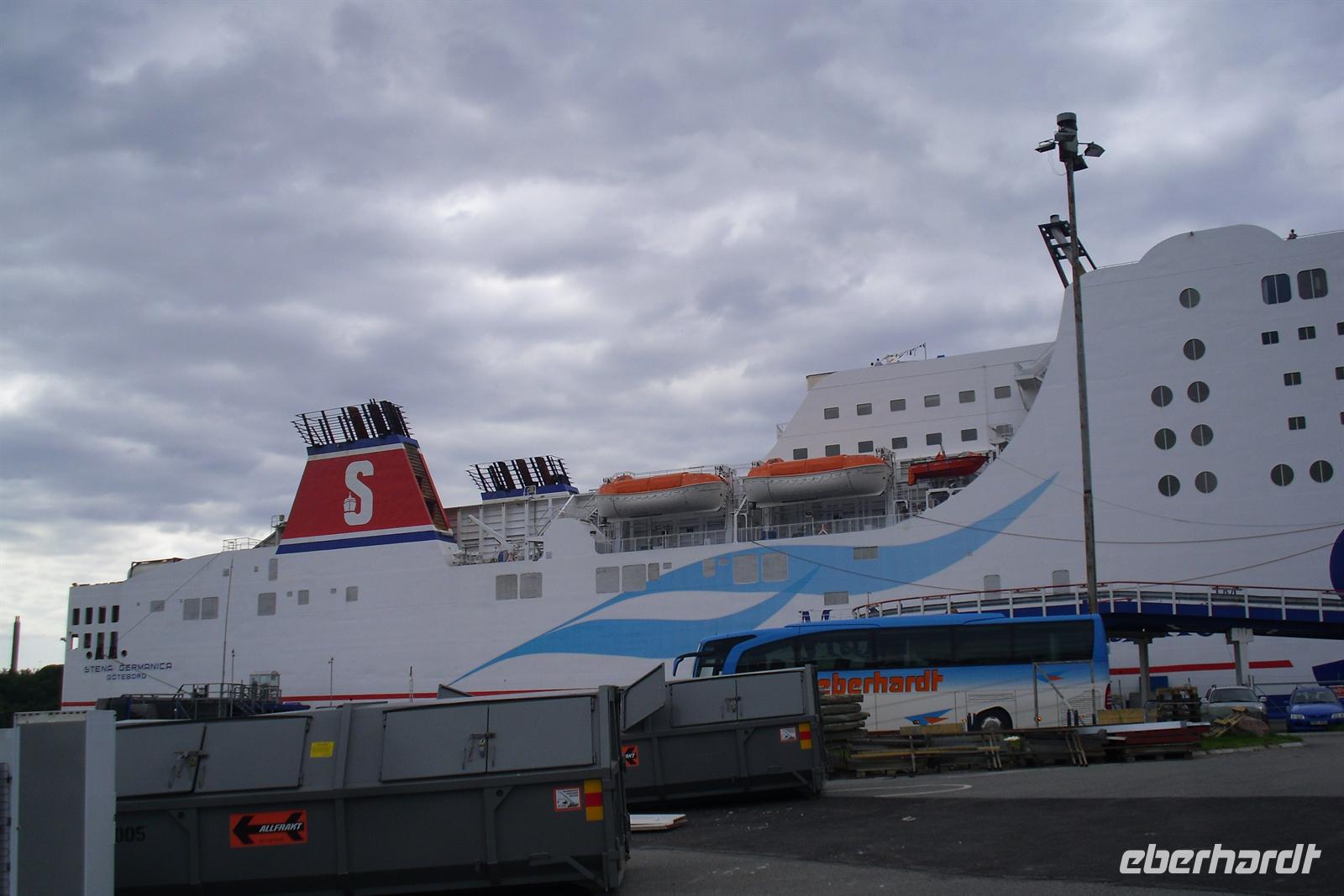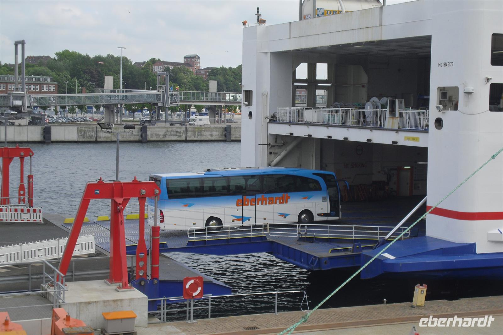 Die Route führte uns weiter über Berlin in Richtung Hamburg und über die B404 bzw. die A21 erreichten wir letztendlich am frühen Nachmittag den Schwedenkai in Kiel. Wir hatten noch etwas Zeit und machten einen kleinen Spaziergang durch die Innenstadt von Kiel. Pünktlich gegen 17 Uhr betraten wir die Fähre der „Stena Germanica“. Wir erkundeten dieses riesige Schiff mit einer Kapazität von bis zu 1.300 Personen. Bereits um 18 Uhr trafen wir uns alle, um das Abendessen als Skandinavisches Buffet zu genießen, sogar die Getränke waren hier inklusive! Danach fielen die meisten von uns müde ins Bett. Einige unserer munteren Gäste erlebten allerdings gegen Mitternacht die imposante Fahrt durch den Großen Belt - unsere Fähre fuhr hier schließlich durch eine 18 km lange Brücke, die Ost- und Westdänemark miteinander verbindet; das wach bleiben lohnte sich also!