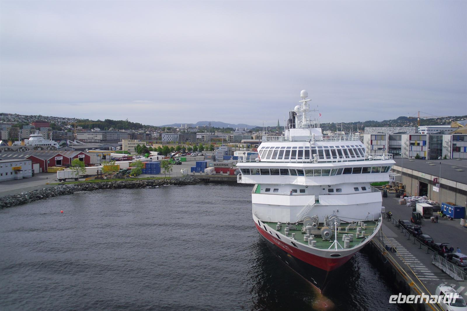 Der über dem Grab von St. Olav errichtete Nidarosdom ist das Nationalheiligtum Norwegens. Mit dem Bau wurde 1070 begonnen, die ältesten noch erhaltenen Teile stammen aber aus der Mitte des 12. Jahrhunderts. Nach dieser kleinen Stippvisite brachte uns unser Bus zum Hurtigruten-Kai, dem Ausgangspunkt unserer kleinen Kreuzfahrt auf einem der Postschiffe! Unser Schiff, die MS "Trollfjord", fährt seit Mai 2002 in der Hurtigruten Flotte und gehört zu den drei größten Schiffen. Wer Norwegen hautnah erleben will, der sollte unbedingt die Strecke Hurtigruten kennenlernen. Es handelt sich dabei um die traditionelle norwegische Postschifflinie, über die seit Ende des 19. Jahrhunderts die Ortschaften der westlichen Küste Norwegens, die etwa 2.700 Kilometer umfasst, miteinander verbunden werden. Zwischen Bergen und Kirkenes kreuzen hier Passagier-, Fracht- und Kreuzfahrtschiffe. Diese Strecke bietet somit eine einmalige Gelegenheit, die gesamte Westküste Norwegens mit all ihren Naturschönheiten kennenzulernen. Fjorde, raue und liebliche Landschaften und die Gastfreundschaft der Menschen machen Hurtigruten heute zu einer echten Touristenattraktion und was einst aus der Not heraus geboren wurde, nämlich auch abgelegene nördliche Landesteile mit dem klimatisch begünstigten Süden zu verbinden, ist inzwischen eine Sehenswürdigkeit.