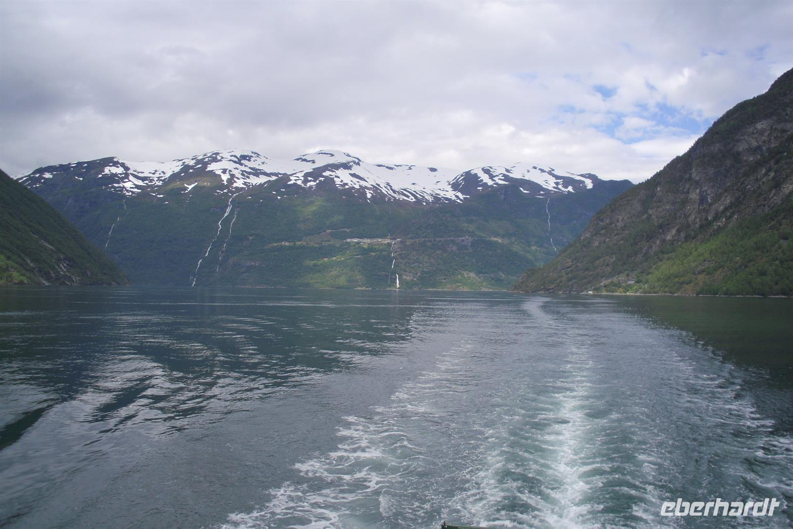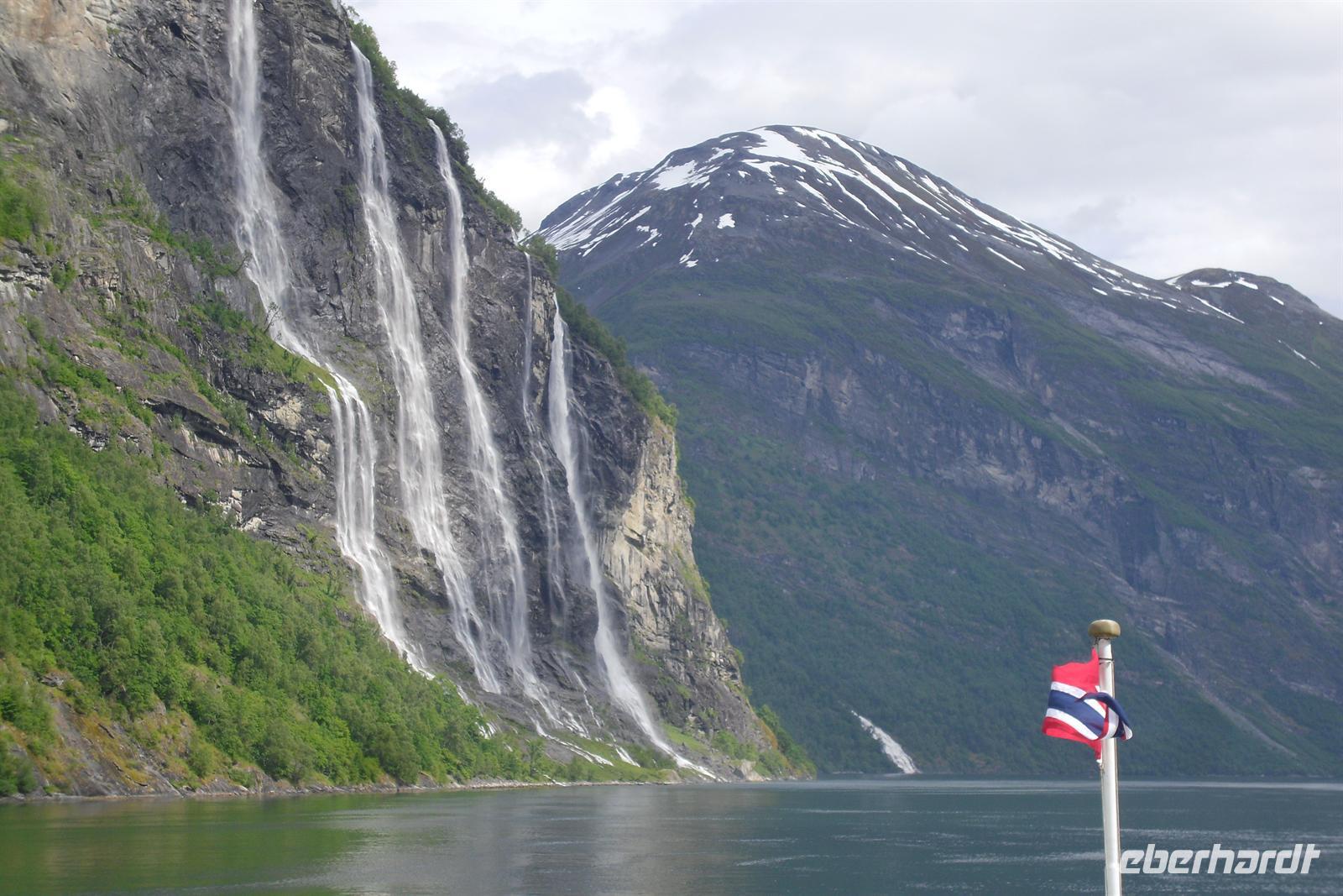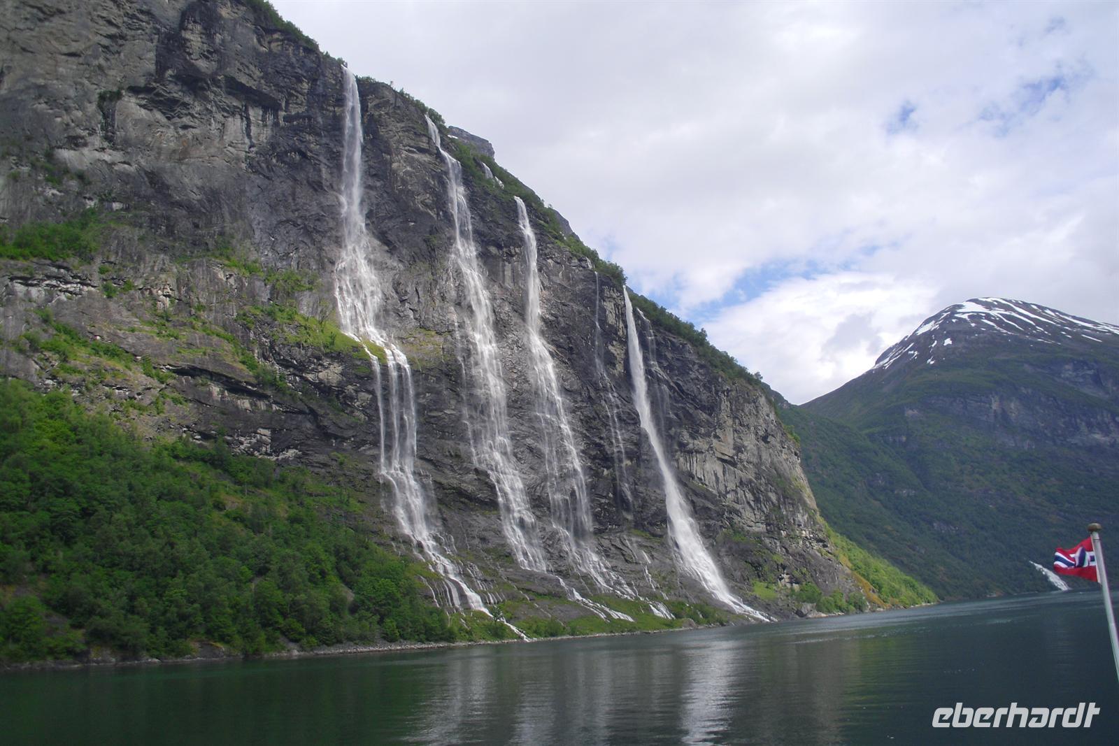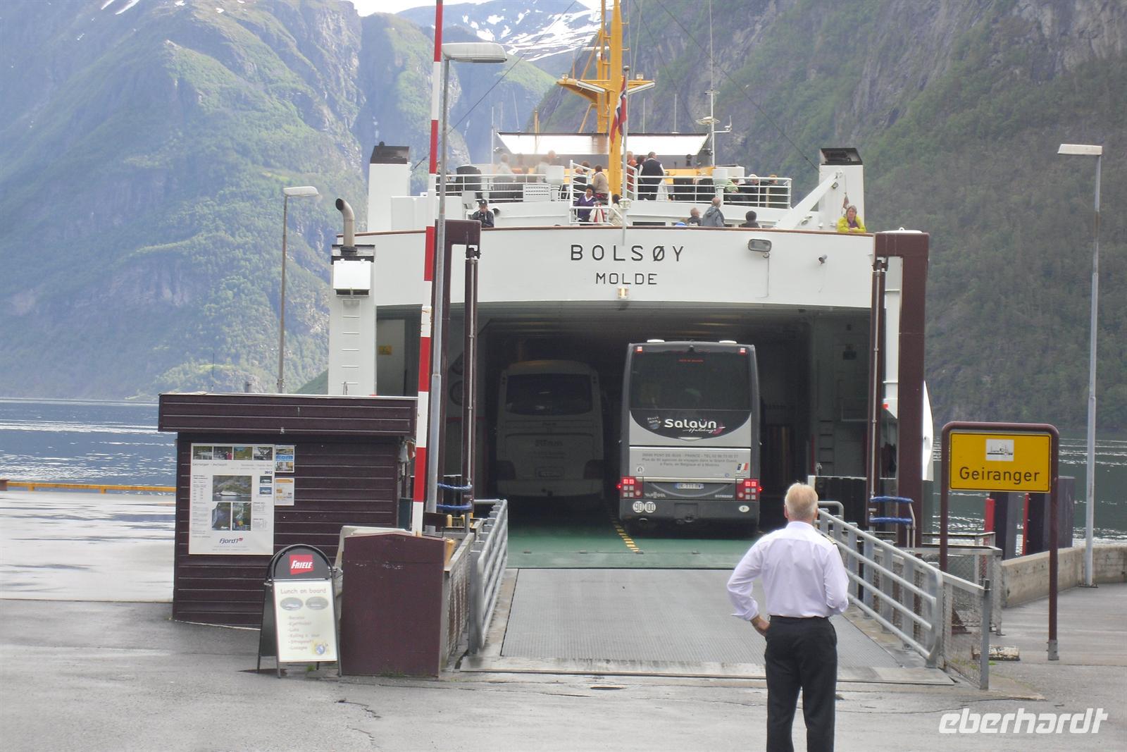 Heute starteten wir wieder gegen 8 Uhr, denn wir hatten volles Programm! Leider mußten wir Abschied von der schönen Stadt Ålesund nehmen, es ging nach Magerholm und von dort mit der Fähre über den Storfjord nach Ørsneset. Unser nächstes Ziel war Hellesylt, von wo wir zu einer etwa einstündigen Schifffahrt auf dem Geirangerfjord aufbrachen.