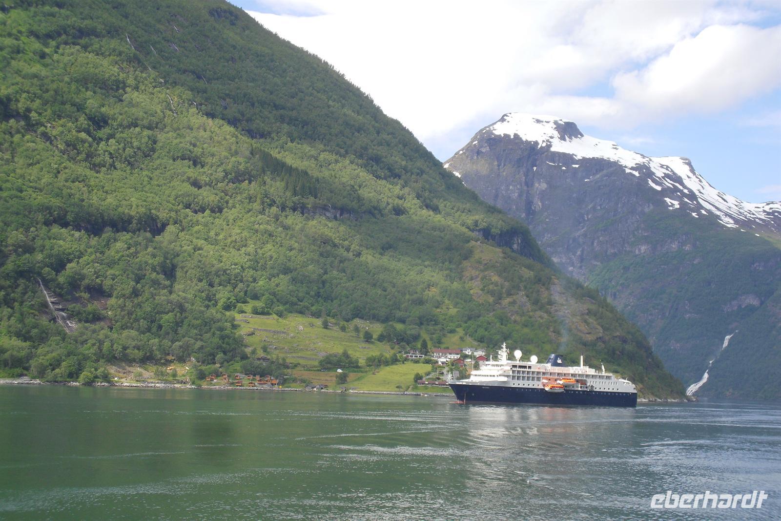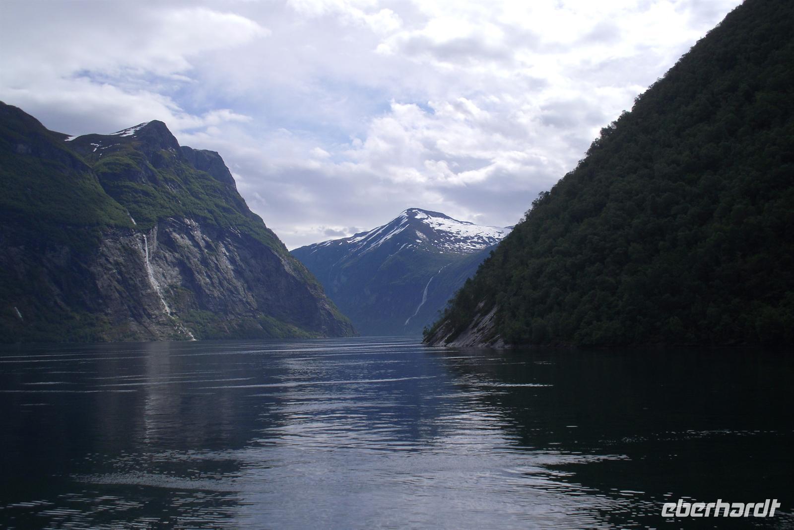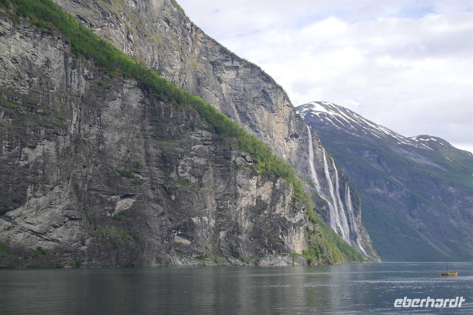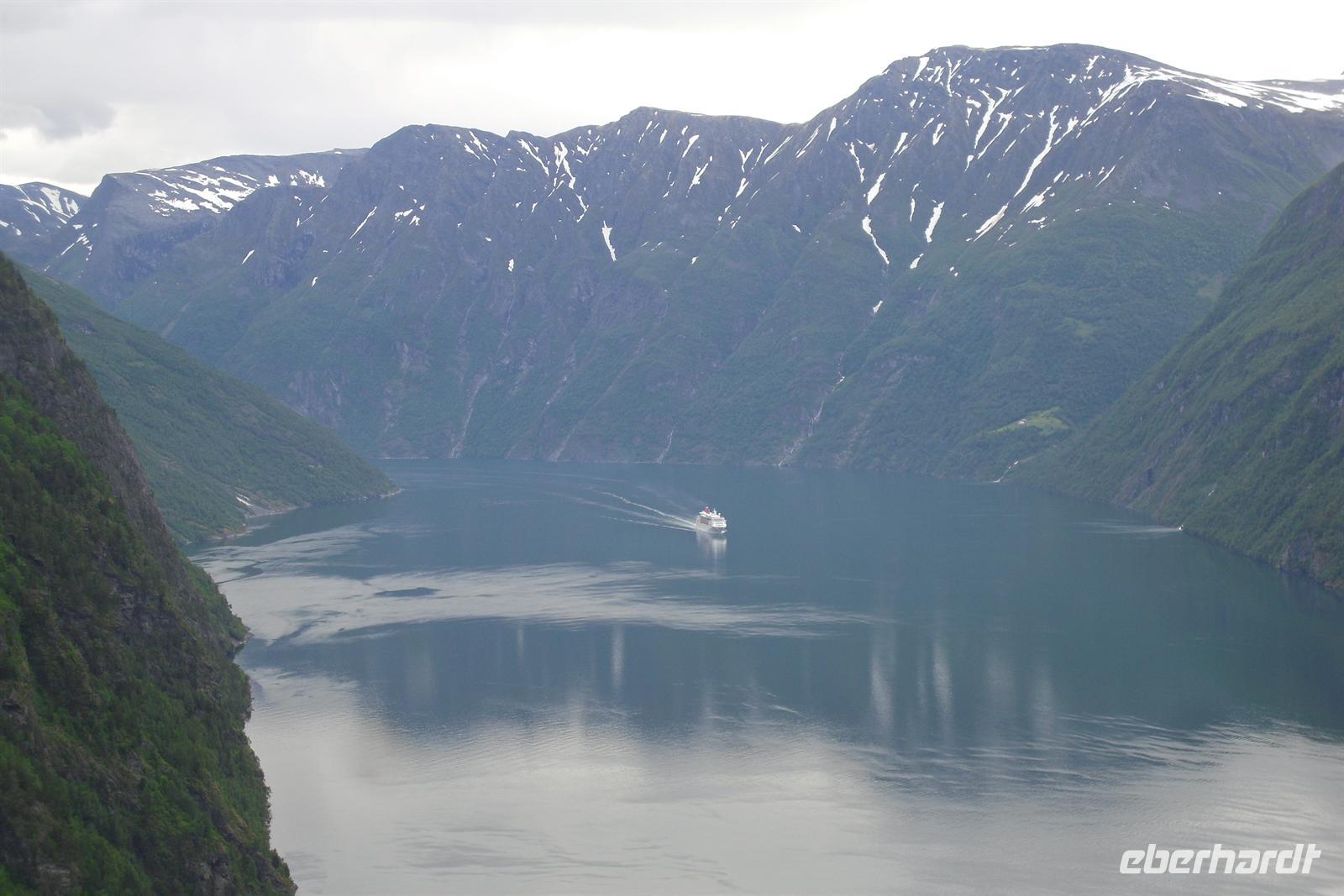 Heute starteten wir wieder gegen 8 Uhr, denn wir hatten volles Programm! Leider mußten wir Abschied von der schönen Stadt Ålesund nehmen, es ging nach Magerholm und von dort mit der Fähre über den Storfjord nach Ørsneset. Unser nächstes Ziel war Hellesylt, von wo wir zu einer etwa einstündigen Schifffahrt auf dem Geirangerfjord aufbrachen.