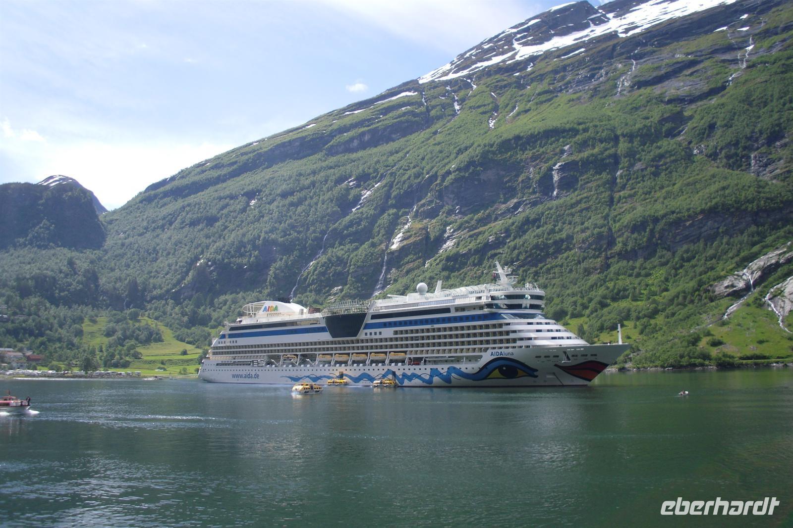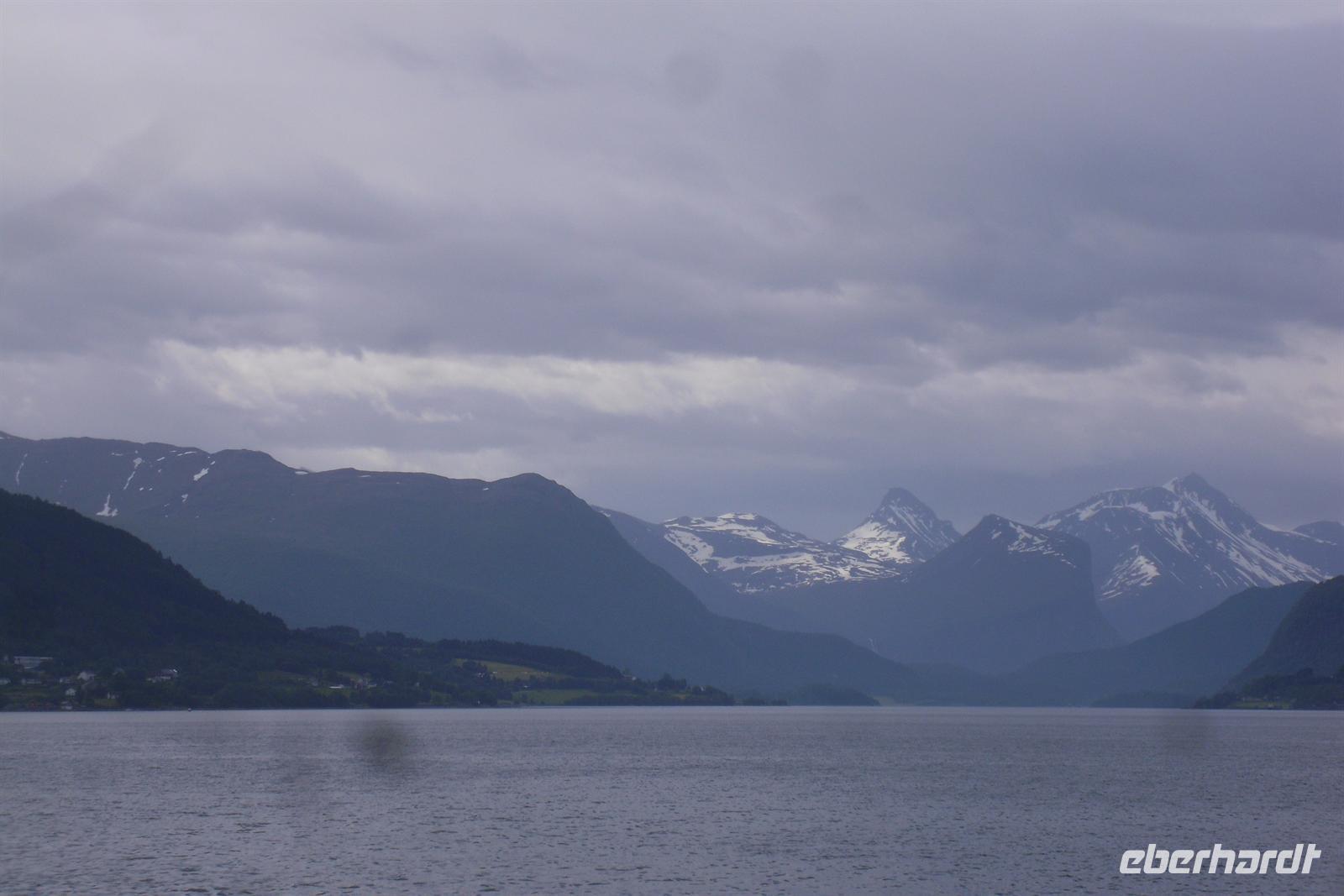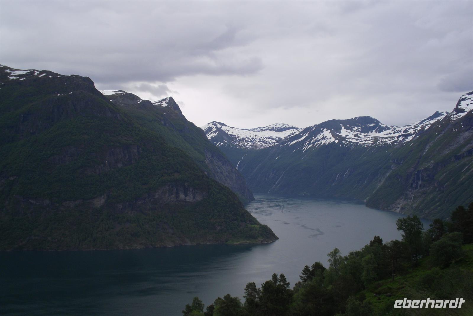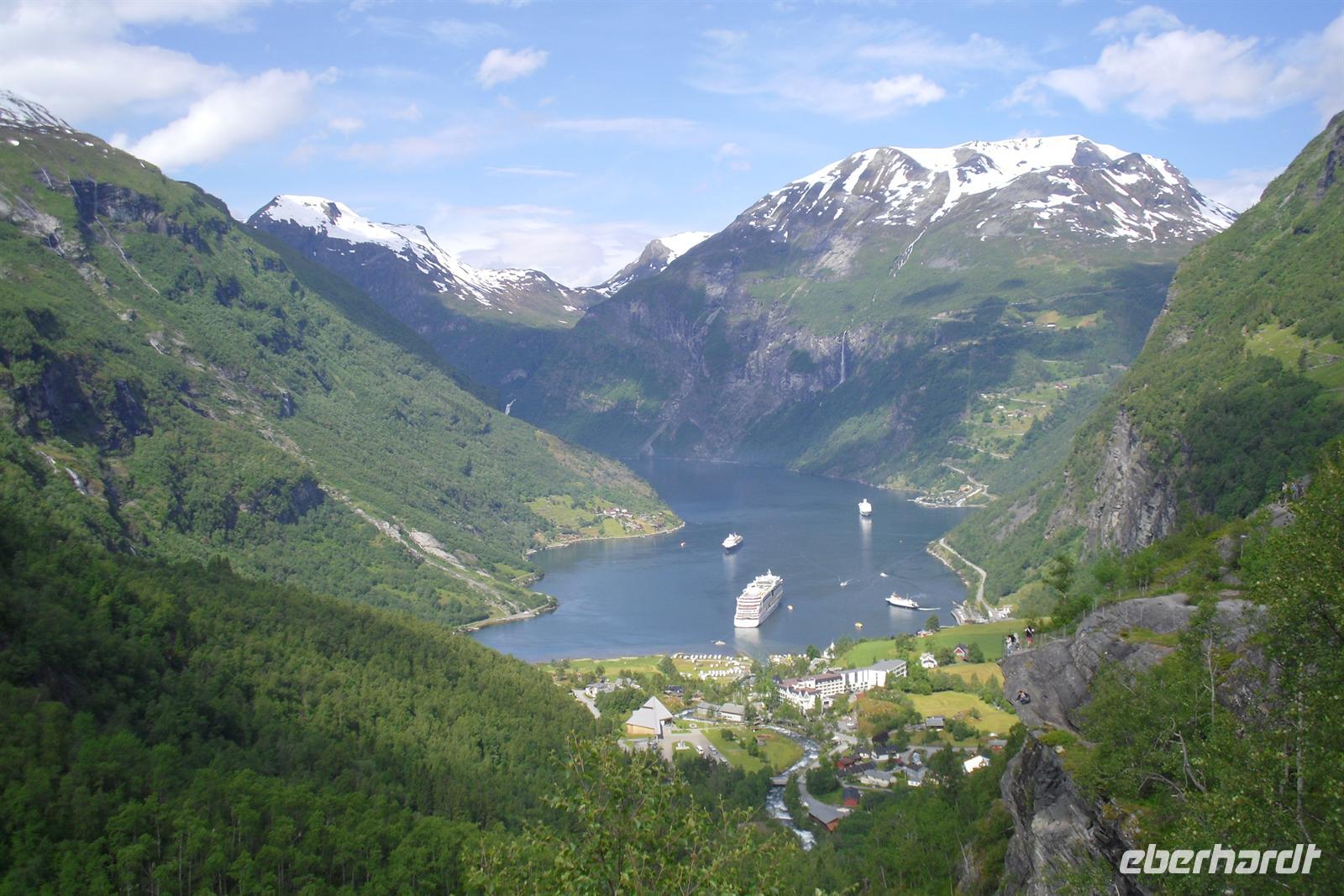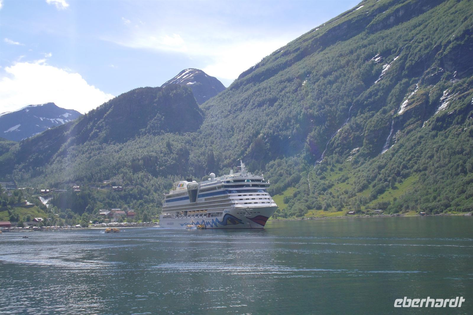 Heute starteten wir wieder gegen 8 Uhr, denn wir hatten volles Programm! Leider mußten wir Abschied von der schönen Stadt Ålesund nehmen, es ging nach Magerholm und von dort mit der Fähre über den Storfjord nach Ørsneset. Unser nächstes Ziel war Hellesylt, von wo wir zu einer etwa einstündigen Schifffahrt auf dem Geirangerfjord aufbrachen.