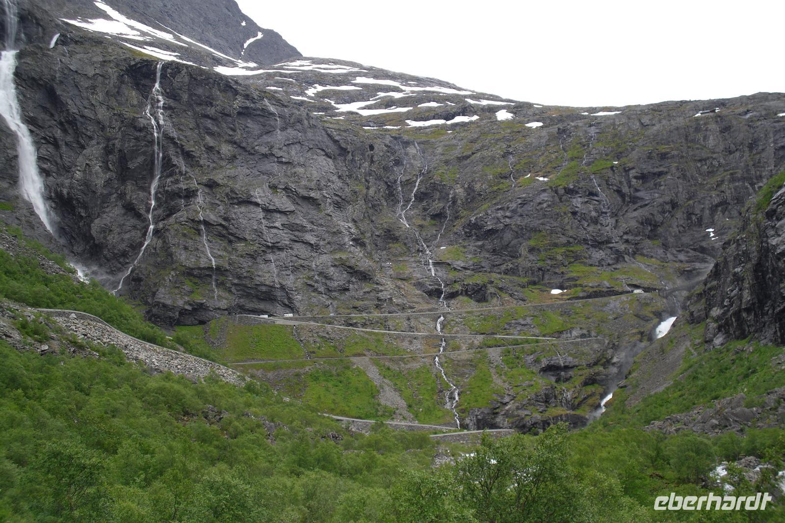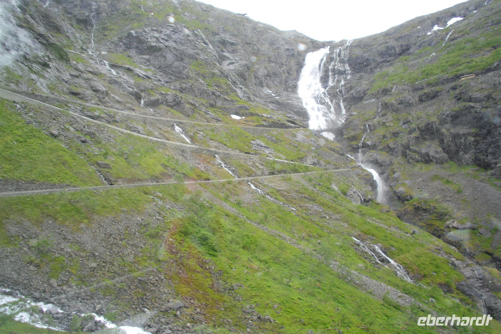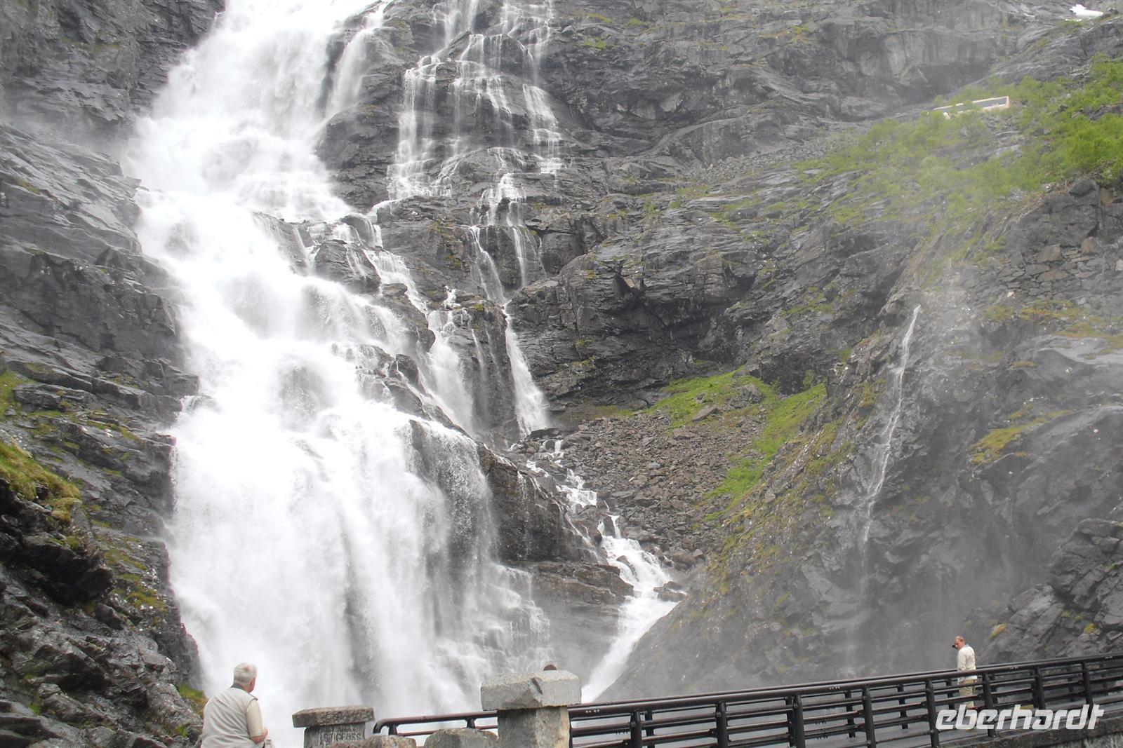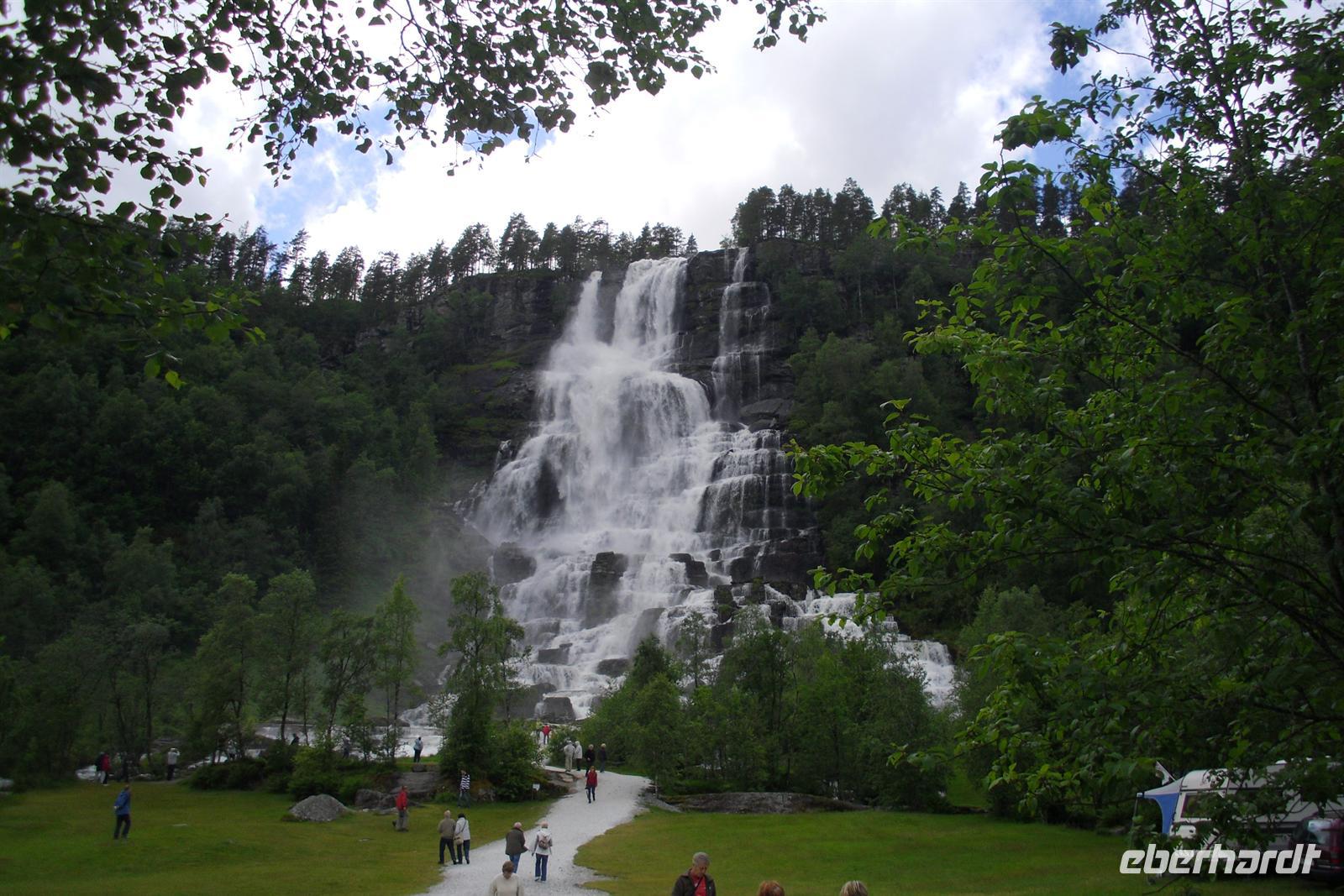 Nach einer schönen Zeit in Bergen ging es für uns auch schon wieder weiter. Eine erste kleine Pause legten wir heute am Wasserfall Steinsdalsfossen ein - hier sollte man sich die Chance nicht entgehen lassen, einmal einen Wasserfall „von hinten“ zu betrachten, zwischen Felswand und Wasser führt ein schmaler Pfad entlang.