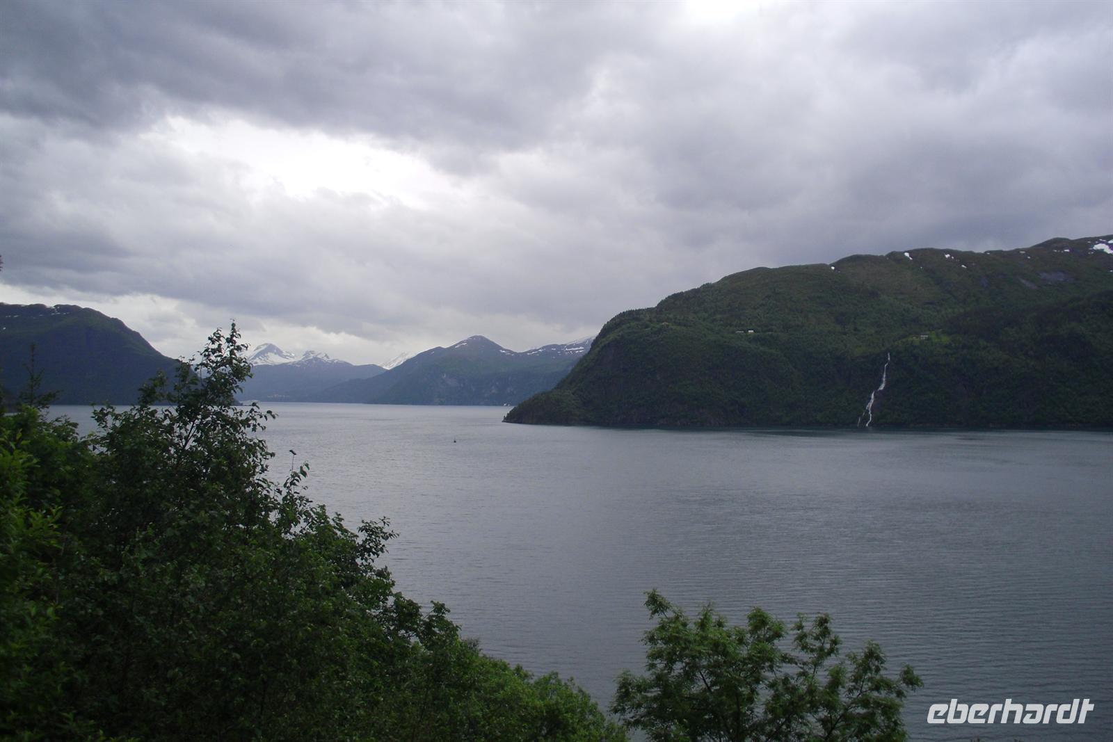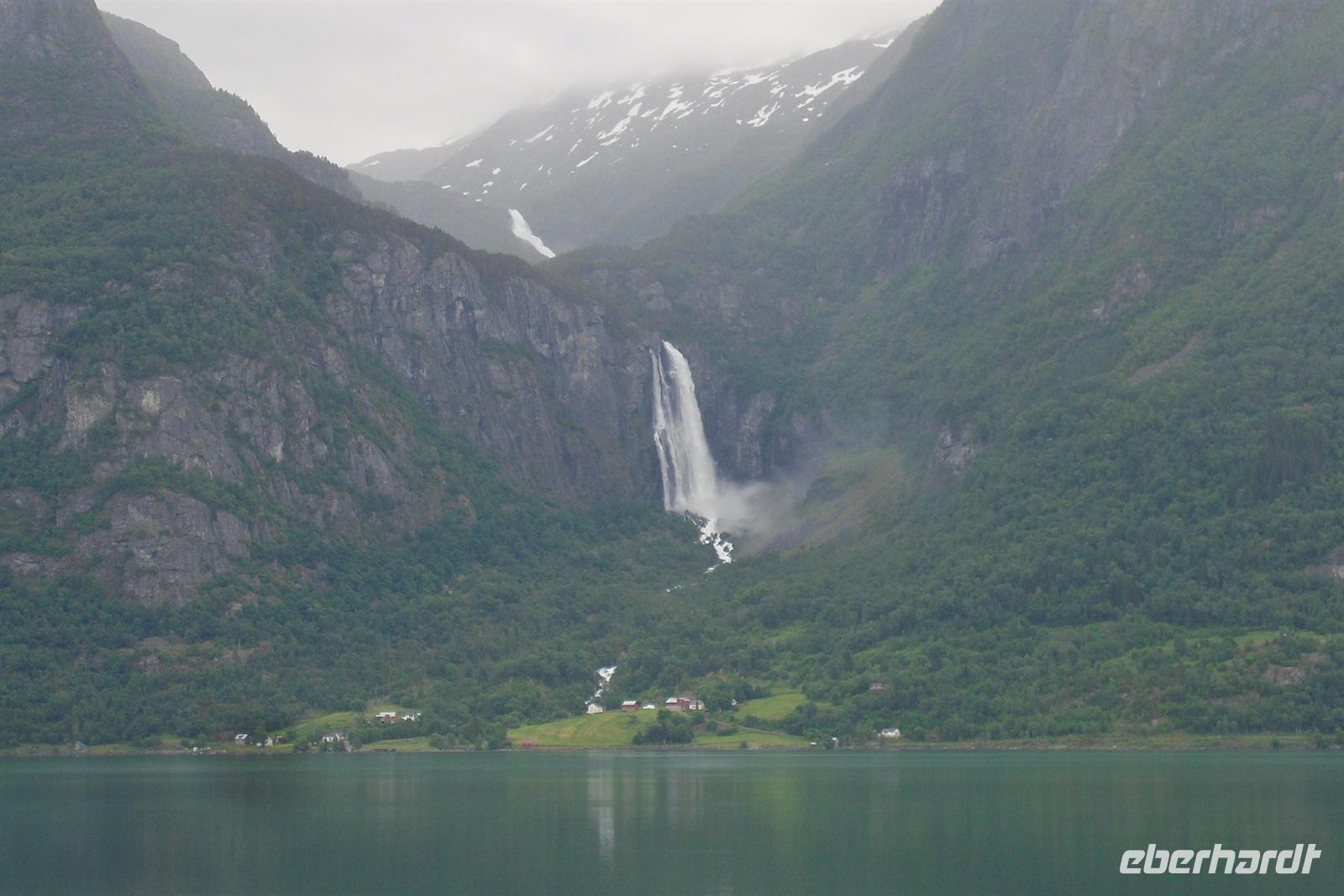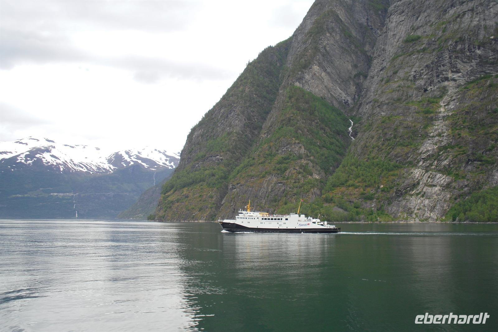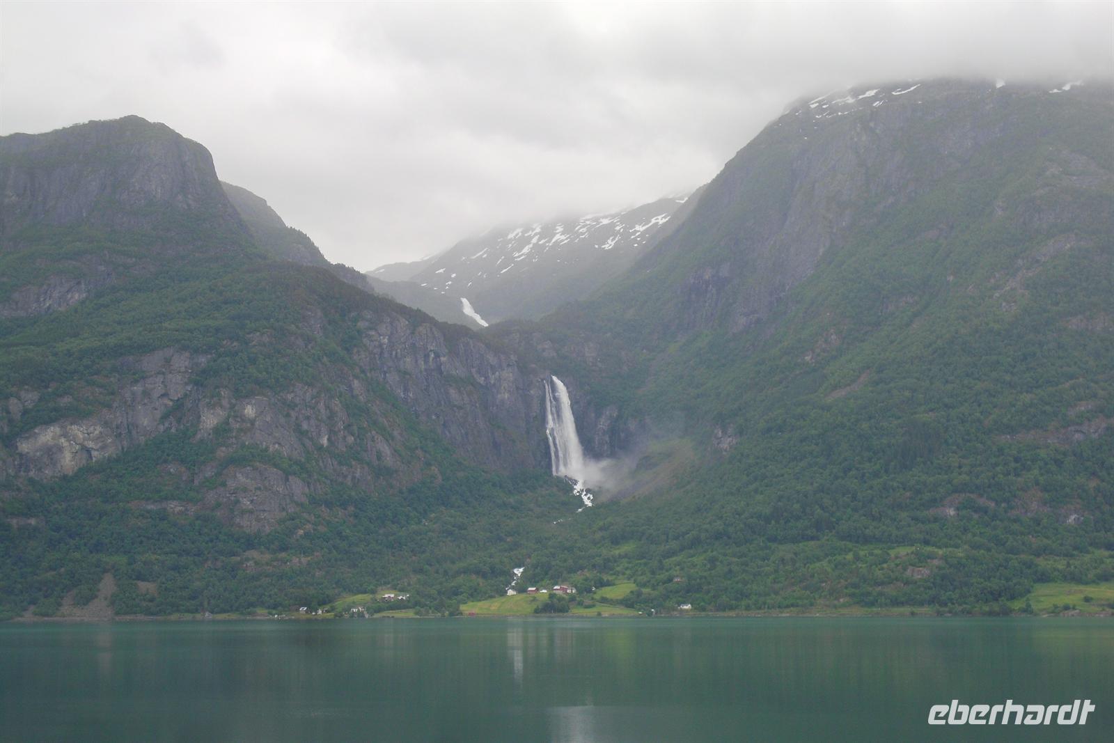 Die Passüberquerung ist eine der ältesten Verbindungswege zwischen Ost und West, sie war die Hauptroute vom gesamten Gudbrandsdal zu den Küstensiedlungen in Sogn und bis nach Bergen. An Waren wurden hier hauptsächlich Salz, Hering und Fisch aus dem Westen und Häute, Butter, und Eisen aus dem Osten transportiert - in beiden Richtungen auf dem eigenen Rücken oder zu Pferd. Unterwegs nutzten wir die reichlichen Möglichkeiten für Fotostopps, obwohl es das Wetter heute wieder mal nicht so gut mit uns meinte. Schließlich erreichten wir Skjolden am Lustrafjord bzw. am inneren Ende des Sognefjords, hier waren wir übrigens etwa 200 Kilometer vom Meer entfernt. Entlang der Nordseite des Lustrafjords und mit herrlichen Blicken auf den Fjord und die zahlreichen Wasserfälle erreichten wir Kaupanger, von wo wir pünktlich um 12 Uhr mit dem Schiff nach Gudvangen ablegten.