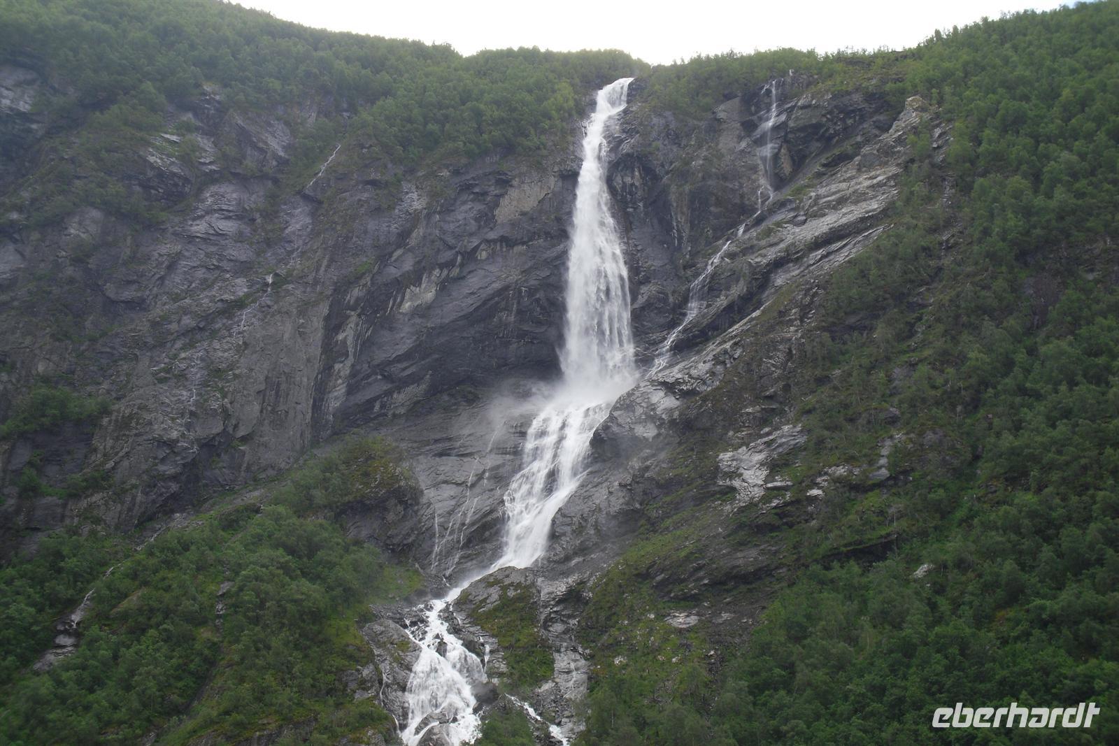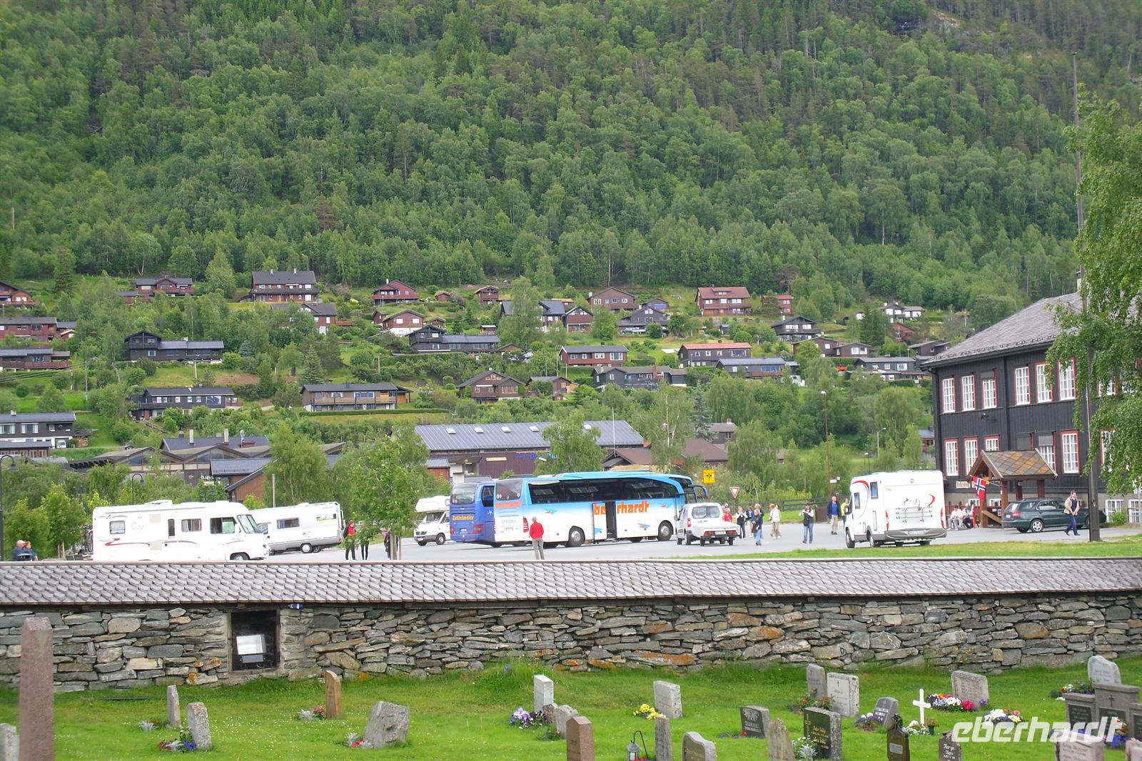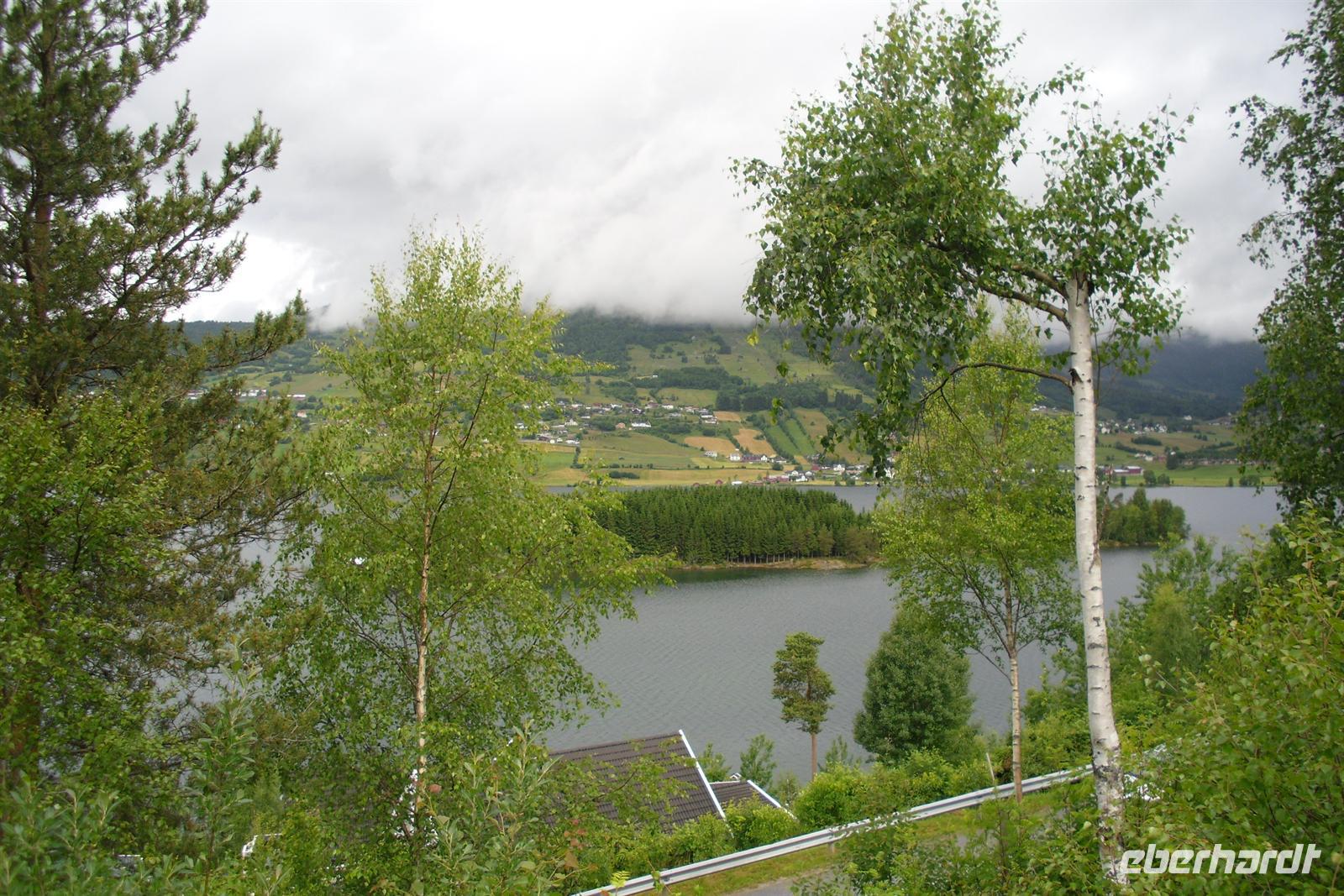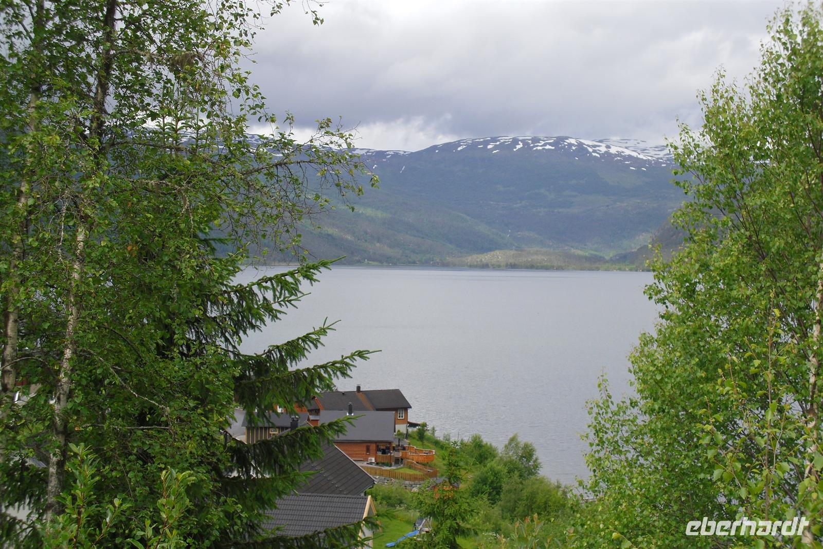 Die Passüberquerung ist eine der ältesten Verbindungswege zwischen Ost und West, sie war die Hauptroute vom gesamten Gudbrandsdal zu den Küstensiedlungen in Sogn und bis nach Bergen. An Waren wurden hier hauptsächlich Salz, Hering und Fisch aus dem Westen und Häute, Butter, und Eisen aus dem Osten transportiert - in beiden Richtungen auf dem eigenen Rücken oder zu Pferd. Unterwegs nutzten wir die reichlichen Möglichkeiten für Fotostopps, obwohl es das Wetter heute wieder mal nicht so gut mit uns meinte. Schließlich erreichten wir Skjolden am Lustrafjord bzw. am inneren Ende des Sognefjords, hier waren wir übrigens etwa 200 Kilometer vom Meer entfernt. Entlang der Nordseite des Lustrafjords und mit herrlichen Blicken auf den Fjord und die zahlreichen Wasserfälle erreichten wir Kaupanger, von wo wir pünktlich um 12 Uhr mit dem Schiff nach Gudvangen ablegten.