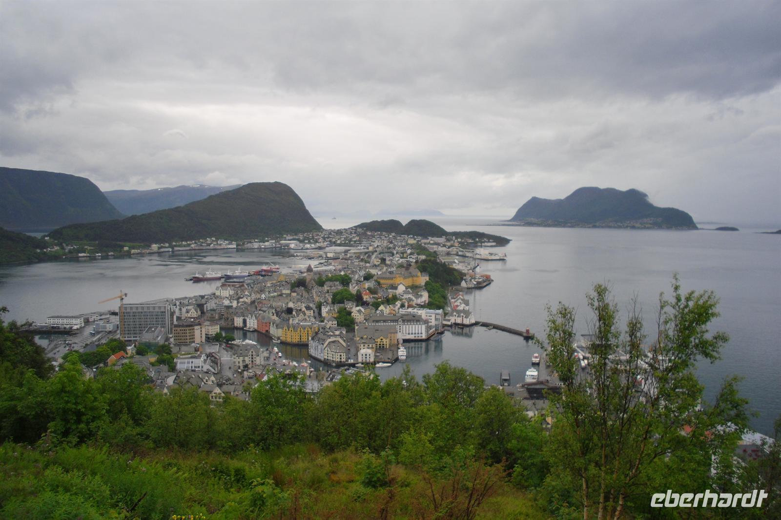 Heute brauchten wir alle allerdings eine kleine Portion Phantasie, um uns dieses Panorama vorzustellen zu können...! Nun sollte es allerdings weiter in Richtung Trollstigen gehen. Die umgebenden Berge hier sind schroff - Namen wie Kongen (König), Dronningen (Königin) und Bispen (Bischoff) bestätigen die Majestät dieser Bergwelt. Hoch oben stürzt sich der Stigfossen ins üppig grüne Isterdal, und mittendurch steigt die Trollstigen-Straße an der Bergseite empor. Nach einer Bauzeit von acht Jahren wurde der Trollstigen 1936 eröffnet und selbst heute ist die Straße ein gutes Beispiel für hohe Ingenieur- und Baukunst. Übersetzen könnte man den Namen „Trollstigen“ übrigens mit „Zauberweg“. Was sind nun eigentlich Trolle? - Es sind im nordischen Volksglauben Dämonen in Riesengestalt. Bereits seit grauer Vorzeit leben in den Bergen und in den alten Hünengräbern Norwegens die Trolle. Sie sind - wie auch die Wichteln und Zwerge - elbische Wesen. Ihre Herkunft ist unbekannt. Einem Geistlichen, der sie vertreiben wollte, klagten sie einmal, sie seien herabgestürzte Engel. Einer anderen Geschichte zufolge sind sie Nachkommen der alten Riesen, die immer weiter geschrumpft sind und weiter schrumpfen. Die Trolle sind gedrungene, plumpe, erdfarbene Wesen mit mächtigen Knollennasen; manche haben einen Schwanz und einen zotteligen Pelz. Die Kleider sind grün wie das Moos an einem Waldsee oder grau wie die Flechten auf den Fjellen. Es ist nicht leicht, Bekanntschaft mit einem Troll zu machen - das gelingt angeblich nur um die Mittagszeit geborenen Sonntagskindern oder den neunten Kindern von Eltern, die selbst neunte Kinder ihrer Eltern waren. Und das ist auch gut so. Es gibt nämlich ganz unterschiedliche Trolle. Die einen sind den Menschen freundlich und wohlgesonnen. Sie sind gutmütige Geschöpfe, die oft in der Nähe von Menschen wohnen und nachbarschaftlichen Umgang pflegen. Ihnen zu begegnen ist eine Freude und ein besonderes Erlebnis. Andere Trolle aber sind sehr böse, und vor ihnen muss man sich in Acht nehmen. Die norwegischen Bauern wissen ein Lied davon zu singen, wenn das Trollweib zur Saatzeit als Wirbelwind über den Acker fegt und mit ihrem Kleid die Saat auffängt. Auch vertauschen manche Trolle die Kinder der Menschen und legen an ihrer Stelle ein Trollkind unter, einen missgestalteten Wechselbalg. Es gibt also viel zu berichten über die Trolle..., wir mußten aber weiter. In Ålesund angekommen, ging es mit unserem Bus auf den Stadtberg Aksla hinauf - wir wurden mit einem tollen Blick auf die Stadt belohnt!
