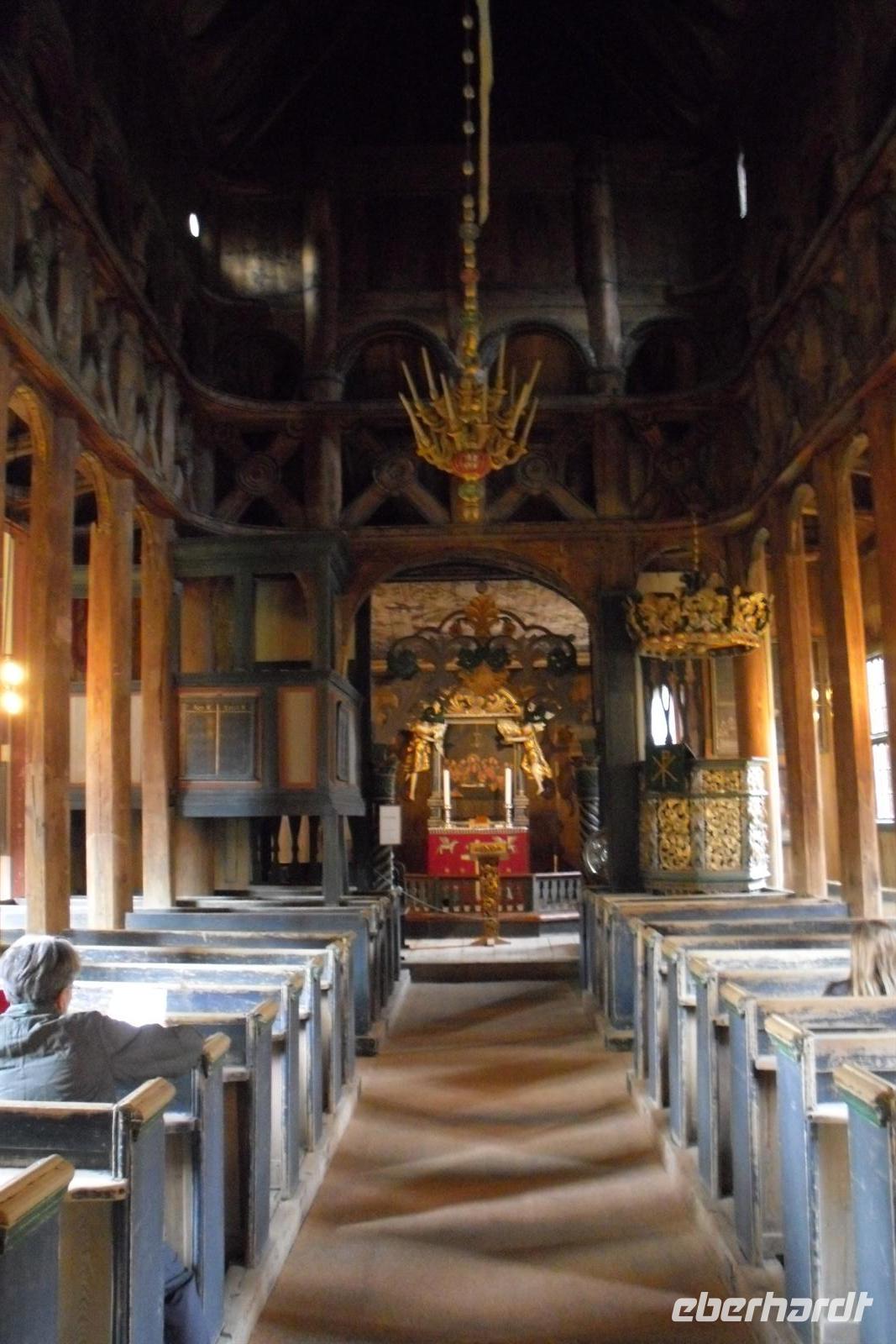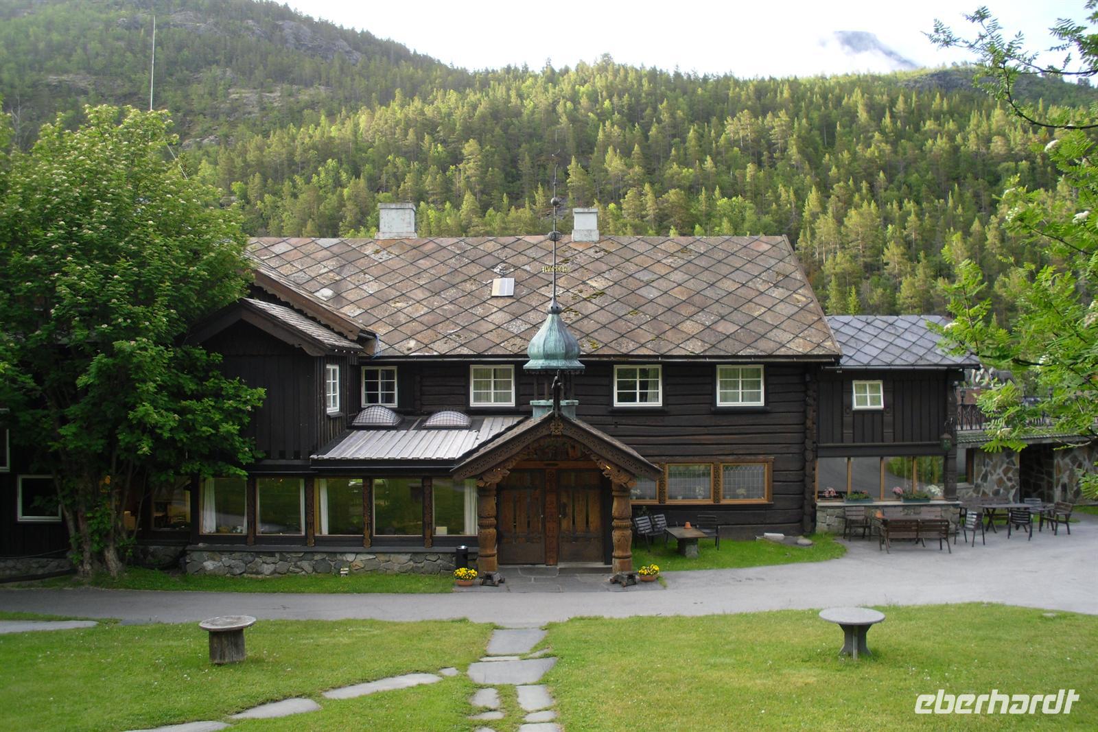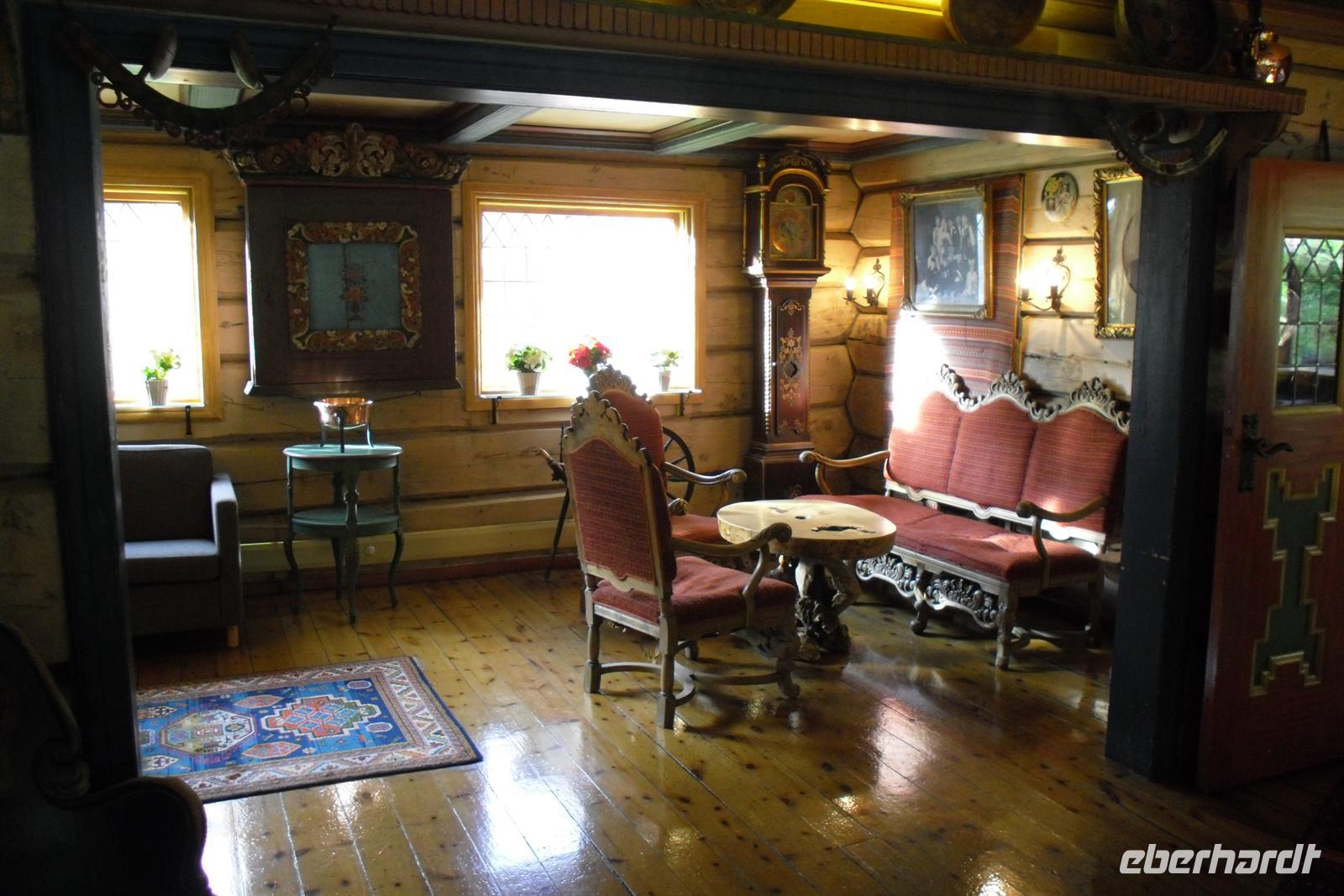 Aus den Giebeln weisen oft stilisierte Drachenköpfe, die eher an Asien erinnern, in alle Himmelsrichtungen. Von den einst angeblich fast 1.000 Stabkirchen sind keine dreißig mehr erhalten. Noch Mitte des 19. Jahrhunderts fehlte den Gemeinden in Norwegen jedes Verständnis über den Wert der alten Gebäude, die in großer Zahl abgerissen wurden, zumal sie auch zu klein geworden waren. Anschließend fuhren wir nach Bøverdalen, wo wir unser Domizil für die nächste Nacht ansteuerten. Elveseter (700 m ü. d. M.) ist ein alter Erbhof, den man in ein modernes Hotel umgewandelt hat und dessen Kulturschätze aus vergangenen Zeiten pietätvoll bewahrt wurden. Er ist dank seinen von den Besitzern selbst geschaffenen Holzschnitzereien eines der originellsten Hotels in Norwegen. Seit fünf Generationen ist der Hof im Besitz der Familie Elveseter.