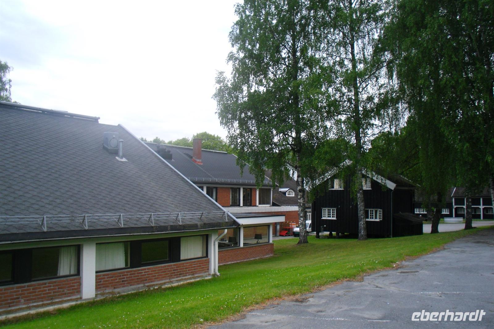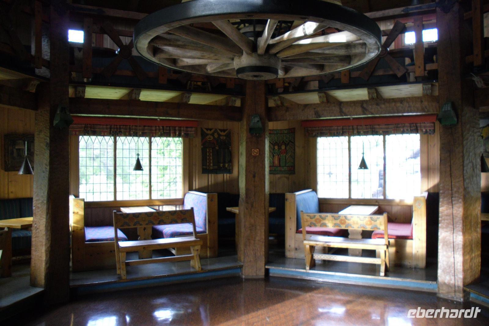 Das ganze Anwesen ist wie eine altnorwegische Götter-Wohnstätte gestaltet, und jeder Raum trägt einen Namen aus der nordischen Mythologie. Wie bei einem alten Bauerngehöft im Gudbrandsdaler Stil sind die Häuser um einen schönen Platz gruppiert. Auf dem hiesigen Anwesen steht übrigens auch seit 1992 die 33 Meter hohe geschichtsträchtige Saga-Säule, die einen Querschnitt durch die norwegische Geschichte zeigt - beginnend mit dem ersten vereinigten Reich 872 bis zur Reichsversammlung 1814. Entworfen wurde die Säule vom Bildhauer Rasmussen bereits vor dem Zweiten Weltkrieg und sollte ursprünglich vor dem Parlament in Oslo platziert werden. Wir waren alle begeistert von dem urigen Stil dieses Hotels und die meisten genossen den Abend ganz gemütlich bei Kaffee oder Tee am knisternden Feuer des Kamins; denn einen Fernseher auf den Zimmern gab es hier nicht - warum auch?, brauchten wir auch nicht...!