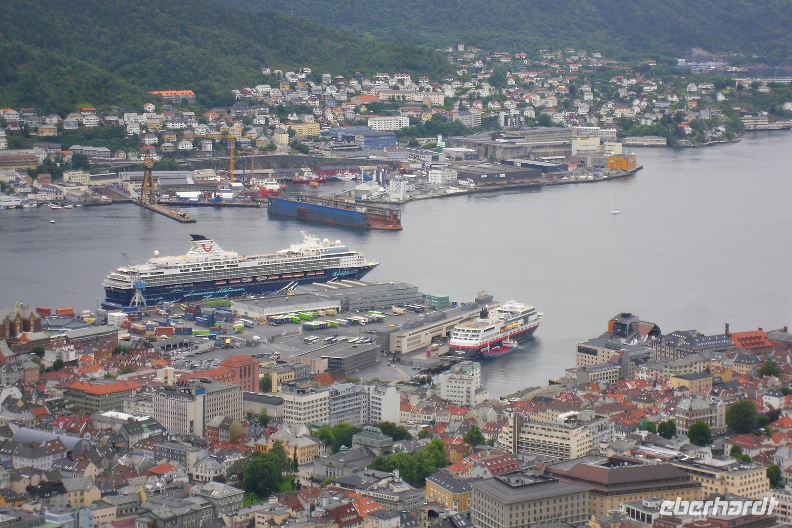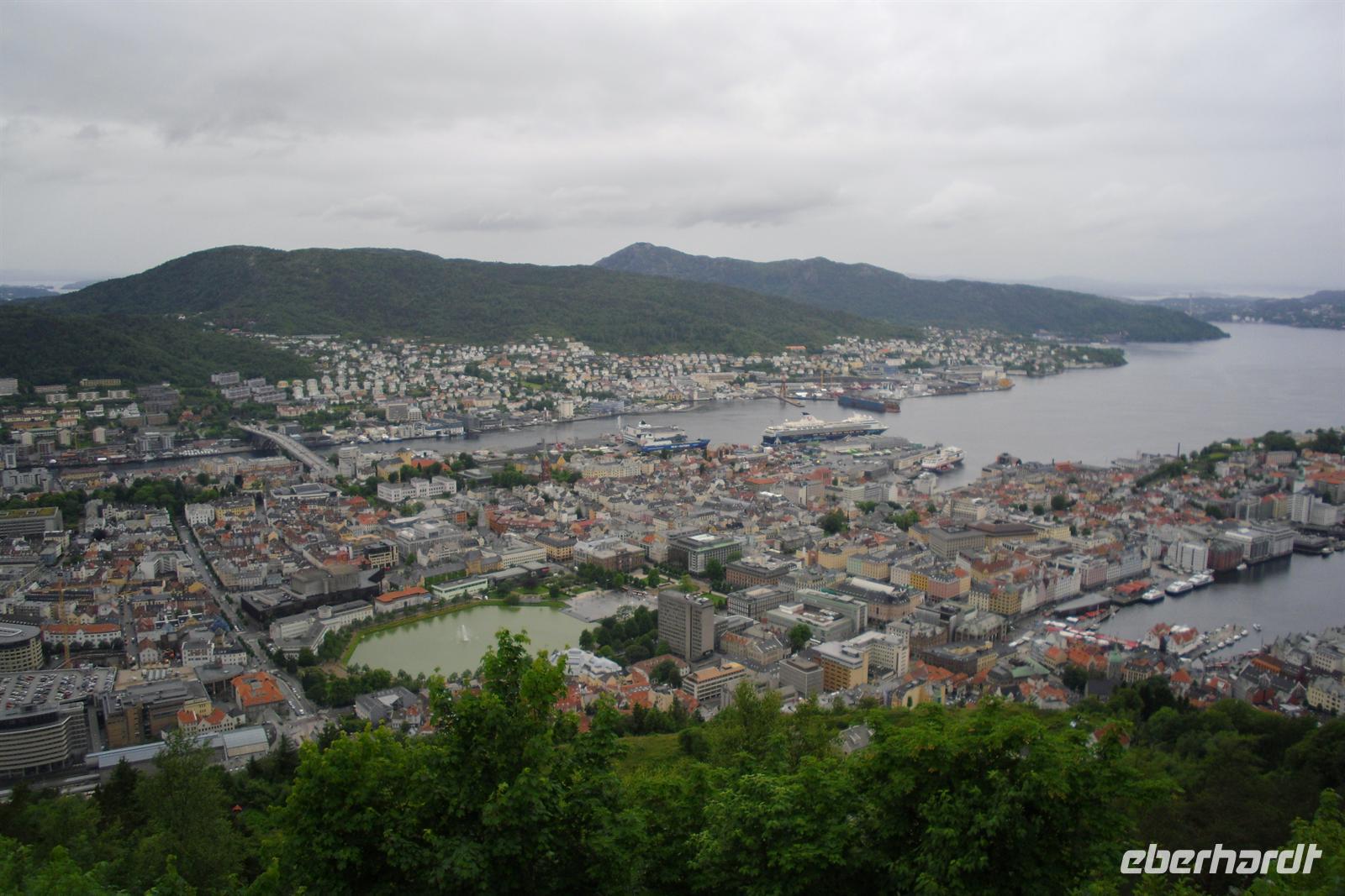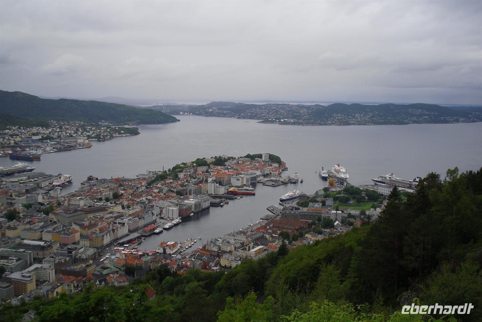 Viele unserer Gäste nutzten dabei die Gelegenheit, mit der einzigen Standseilbahn Skandinaviens zum Berg Fløyen hinauf zu fahren. Vom sogenannten "Dach von Bergen" hat man eine phantastische Aussicht über die Stadt, den Schiffsverkehr, die Fjorde und nicht zuletzt die umliegenden Inseln. Eine Aussicht, die einen beeindruckenden Überblick über die Vielfalt der Stadt und der näheren Umgebung gewährt. Eine Aussicht, die den Blick auf das offene Meer, auf die 50 km nördlich gelegene Insel Fedje sowie auf die südlich gelegenen Inseln der Region Sunnhordaland erlaubt. Bergen machte übrigens heute seinem Ruf als regenreichste Großstadt alle Ehre, denn hier soll es an etwa 250 Tagen im Jahr regnen - einen von diesen Regentagen hatten wir nun auch noch erwischt..., aber immerhin regnete es keine Bindfäden - es gab auch trockene Abschnitte!