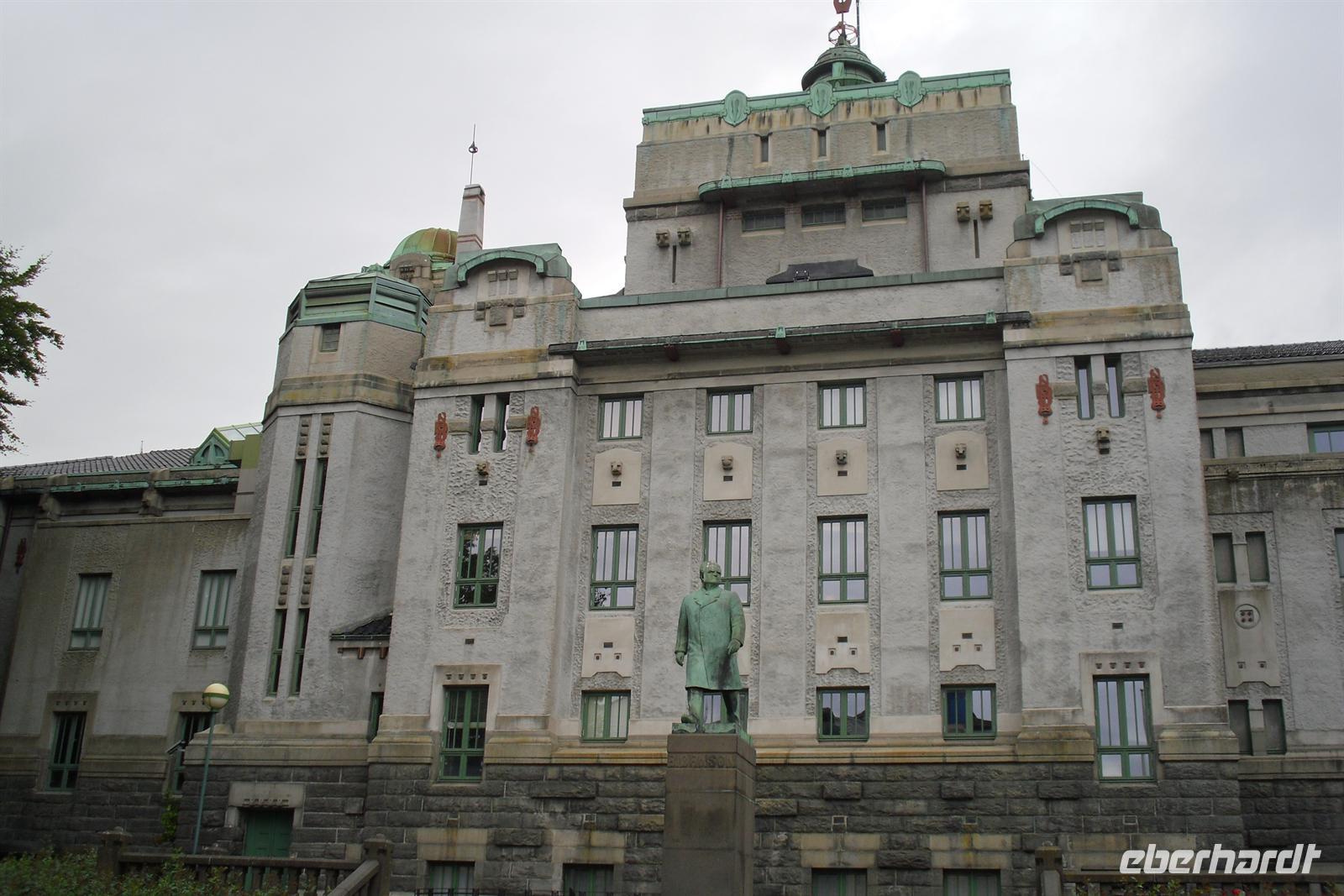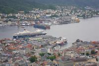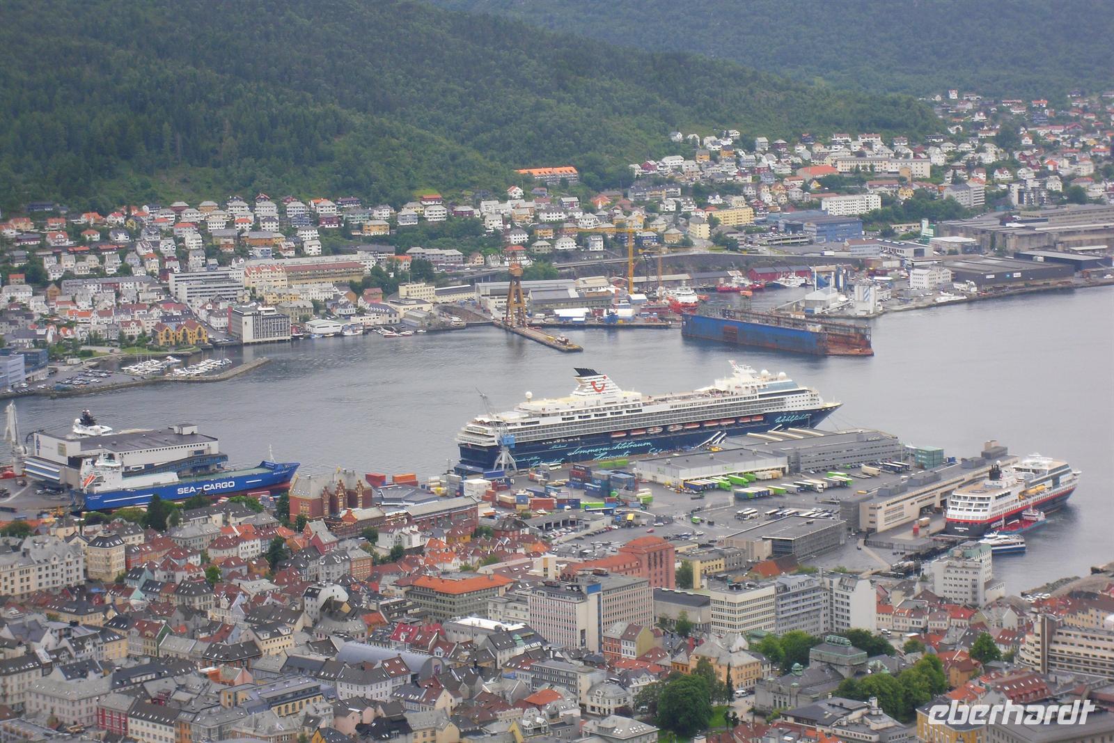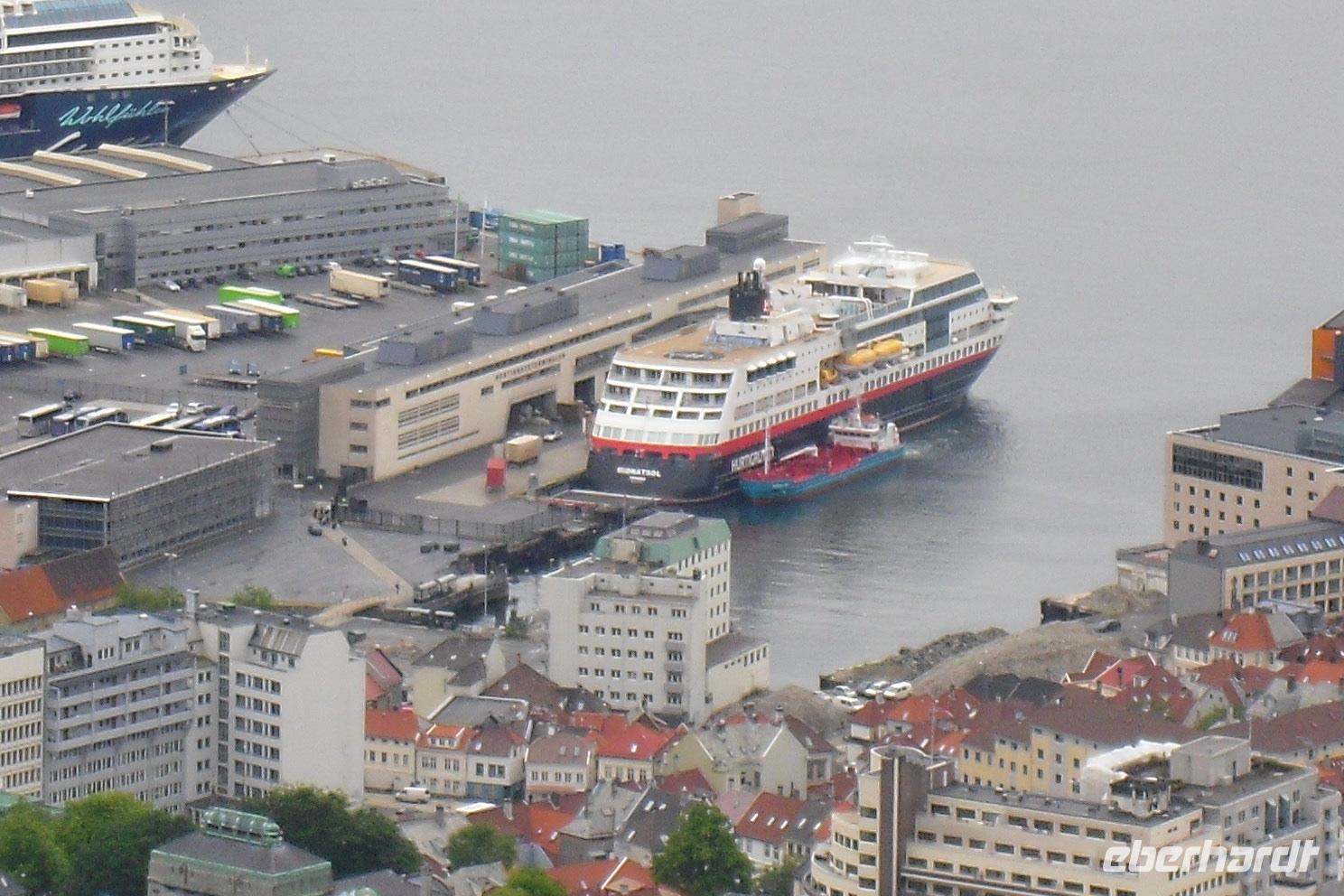 Viele unserer Gäste nutzten dabei die Gelegenheit, mit der einzigen Standseilbahn Skandinaviens zum Berg Fløyen hinauf zu fahren. Vom sogenannten "Dach von Bergen" hat man eine phantastische Aussicht über die Stadt, den Schiffsverkehr, die Fjorde und nicht zuletzt die umliegenden Inseln. Eine Aussicht, die einen beeindruckenden Überblick über die Vielfalt der Stadt und der näheren Umgebung gewährt. Eine Aussicht, die den Blick auf das offene Meer, auf die 50 km nördlich gelegene Insel Fedje sowie auf die südlich gelegenen Inseln der Region Sunnhordaland erlaubt. Bergen machte übrigens heute seinem Ruf als regenreichste Großstadt alle Ehre, denn hier soll es an etwa 250 Tagen im Jahr regnen - einen von diesen Regentagen hatten wir nun auch noch erwischt..., aber immerhin regnete es keine Bindfäden - es gab auch trockene Abschnitte!