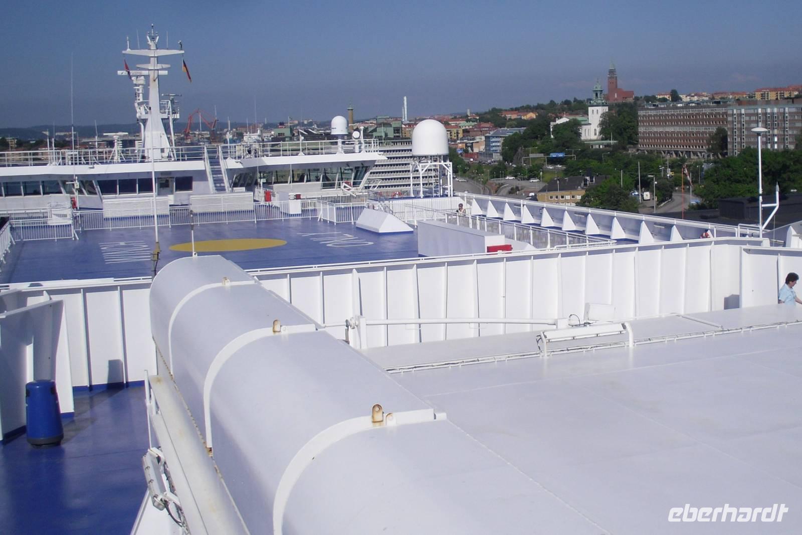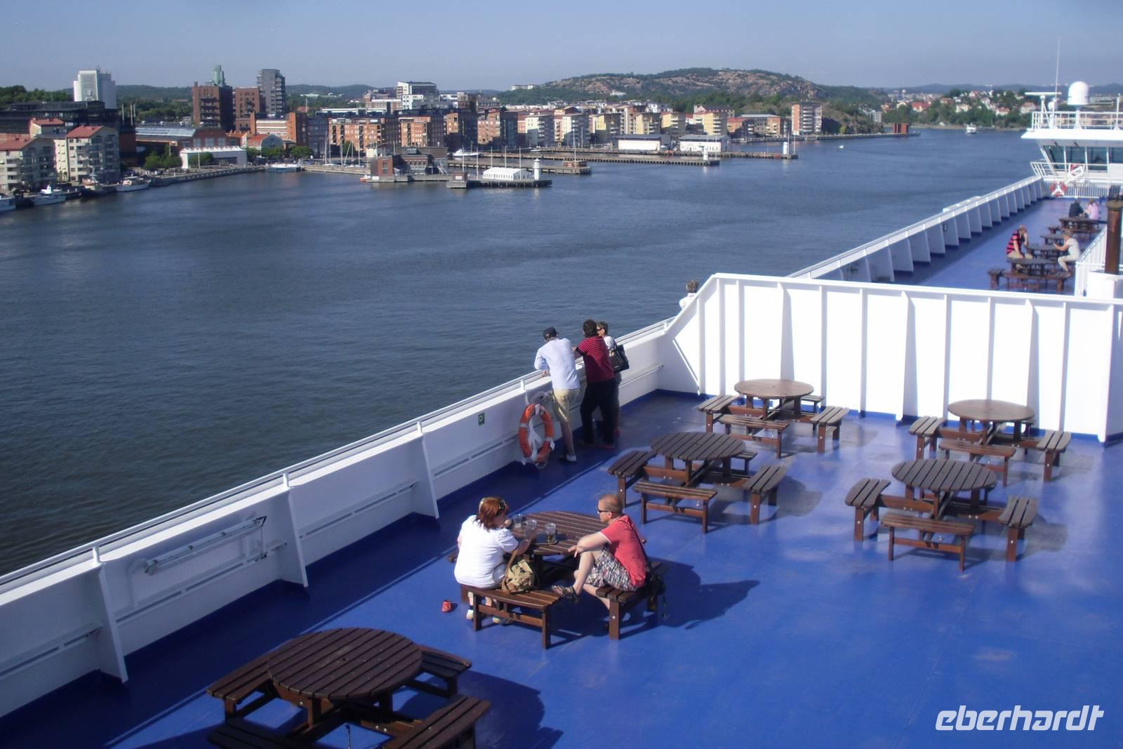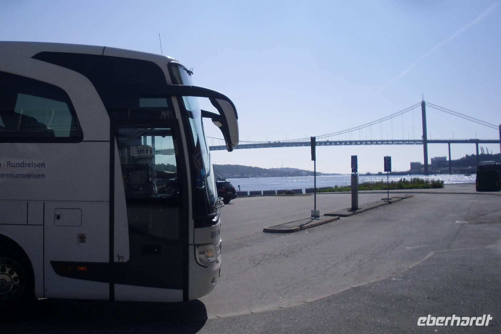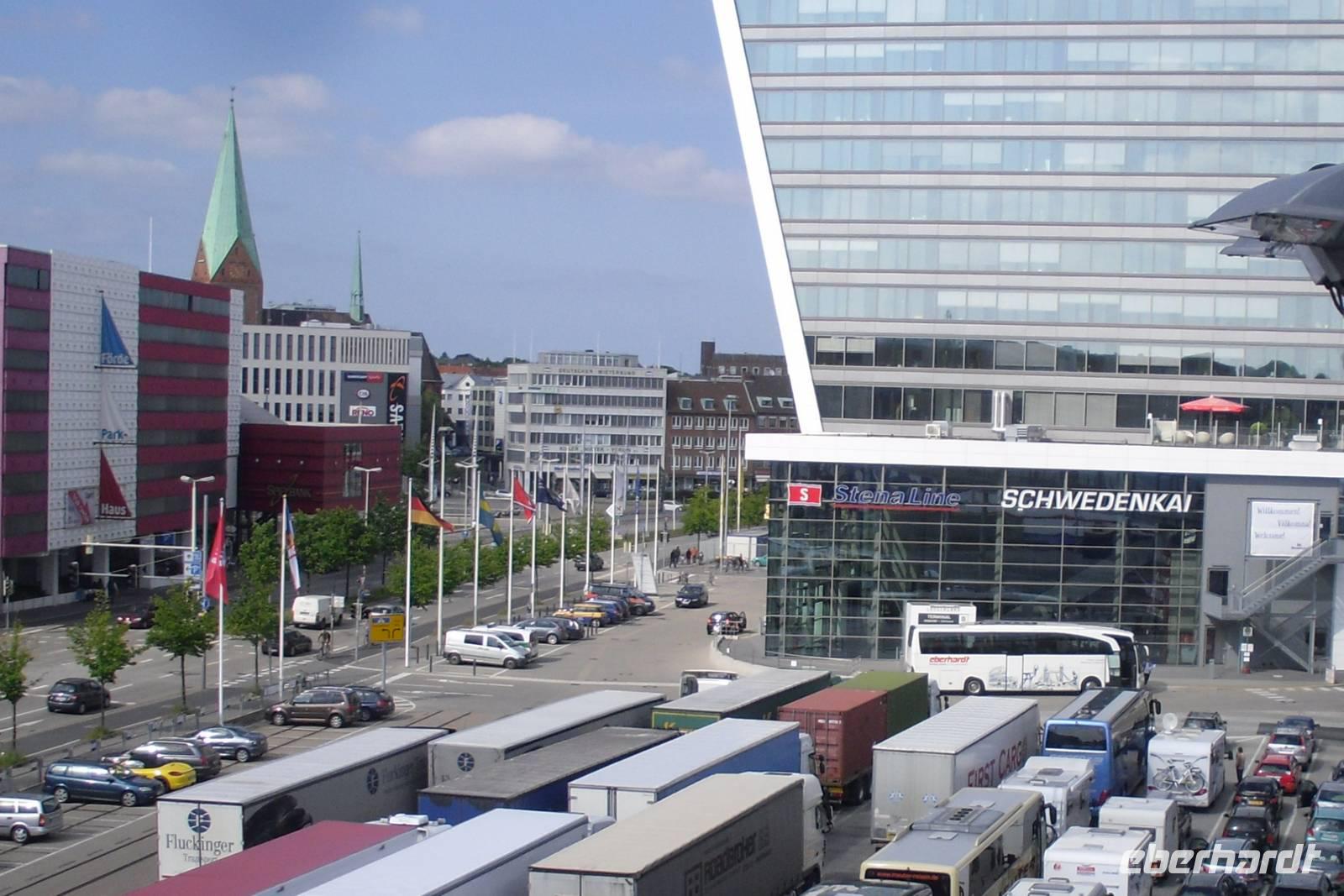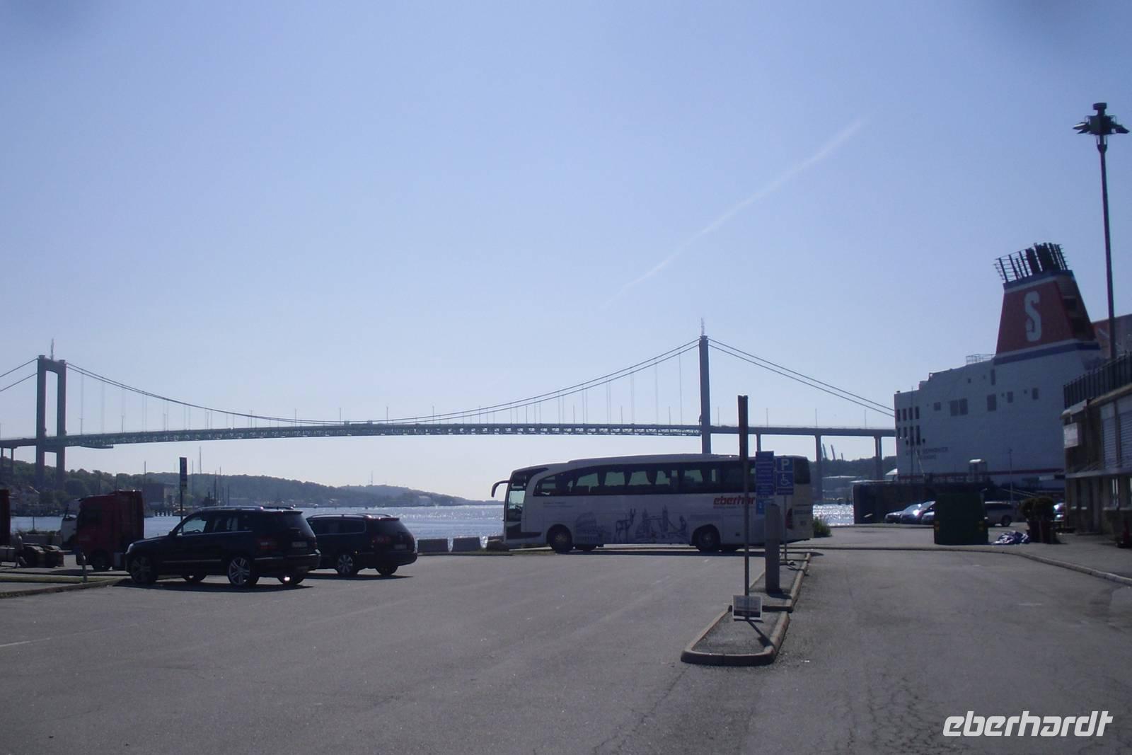 Mit einigen Gästen starteten wir bereits am Dresdner Flughafen, über Döbeln ging es dann zum Leipziger Flughafen und in der Nähe von Berlin war unsere Gruppe mit insgesamt 37 Gästen komplett. Die Route führte uns weiter in Richtung Hamburg und über die B404 bzw. die A21 erreichten wir letztendlich am frühen Nachmittag den Schwedenkai in Kiel. Wir hatten noch etwas Zeit und machten einen kleinen Spaziergang durch die Innenstadt von Kiel. Pünktlich gegen 17 Uhr betraten wir die Fähre der "Stena Germanica". Wir erkundeten dieses riesige Schiff mit einer Kapazität von bis zu 1.300 Personen. Bereits kurz nach 18 Uhr trafen wir uns alle, um das Abendessen als Skandinavisches Buffet zu genießen, sogar die Getränke waren hier inklusive! Danach fielen die meisten von uns müde ins Bett. Einige unserer munteren Gäste erlebten allerdings gegen Mitternacht die imposante Fahrt durch den Großen Belt - unsere Fähre fuhr hier schließlich durch eine 18 km lange Brücke, die Ost- und Westdänemark miteinander verbindet; das wach bleiben lohnte sich also!