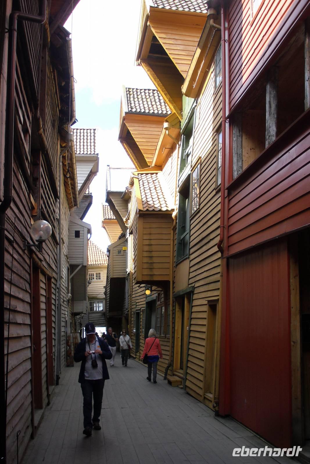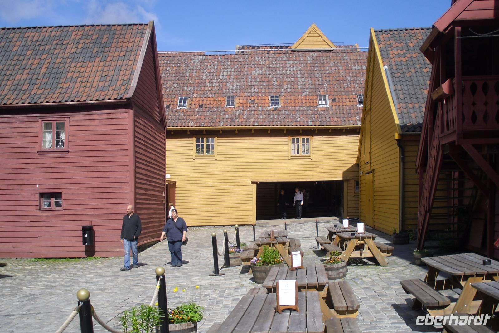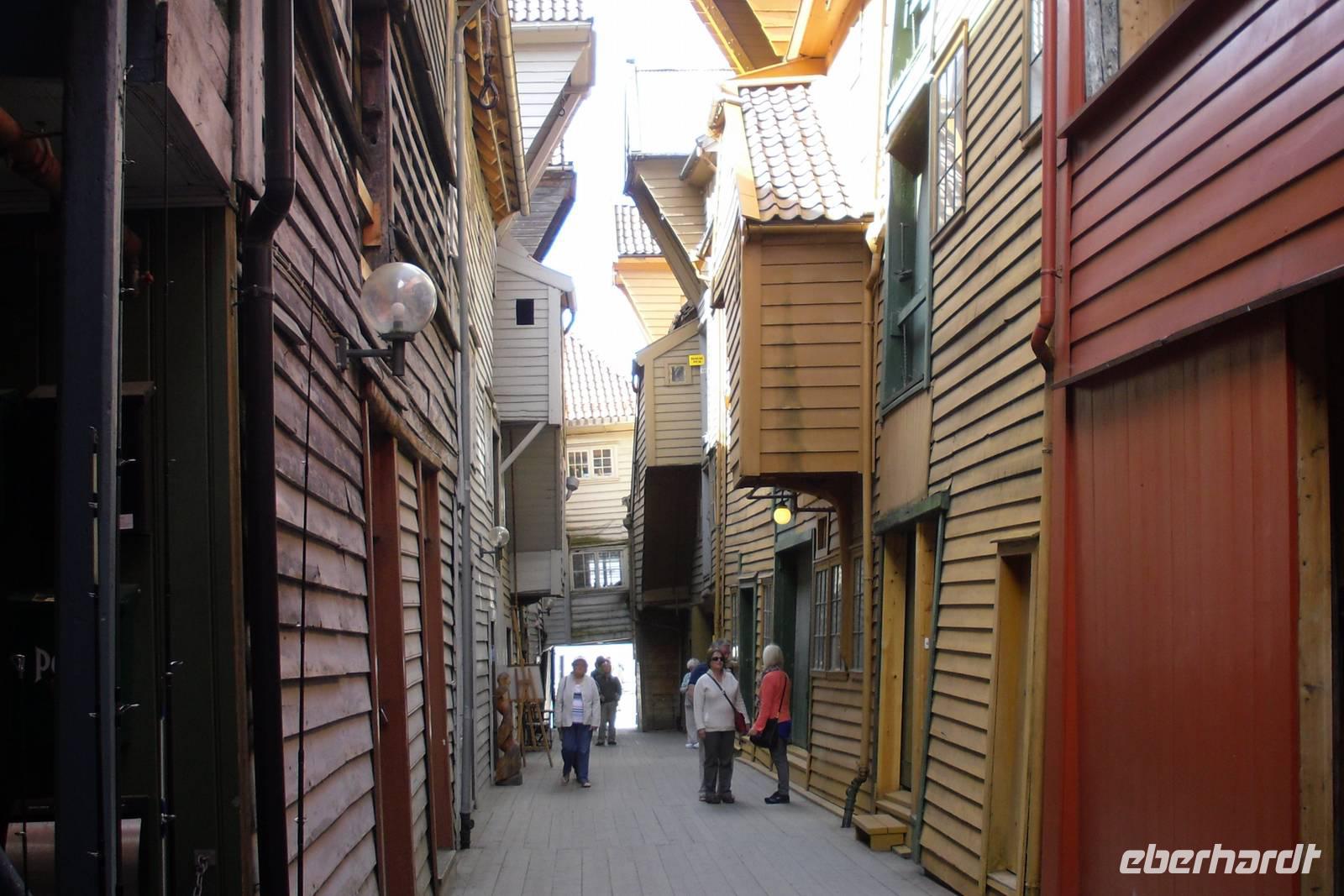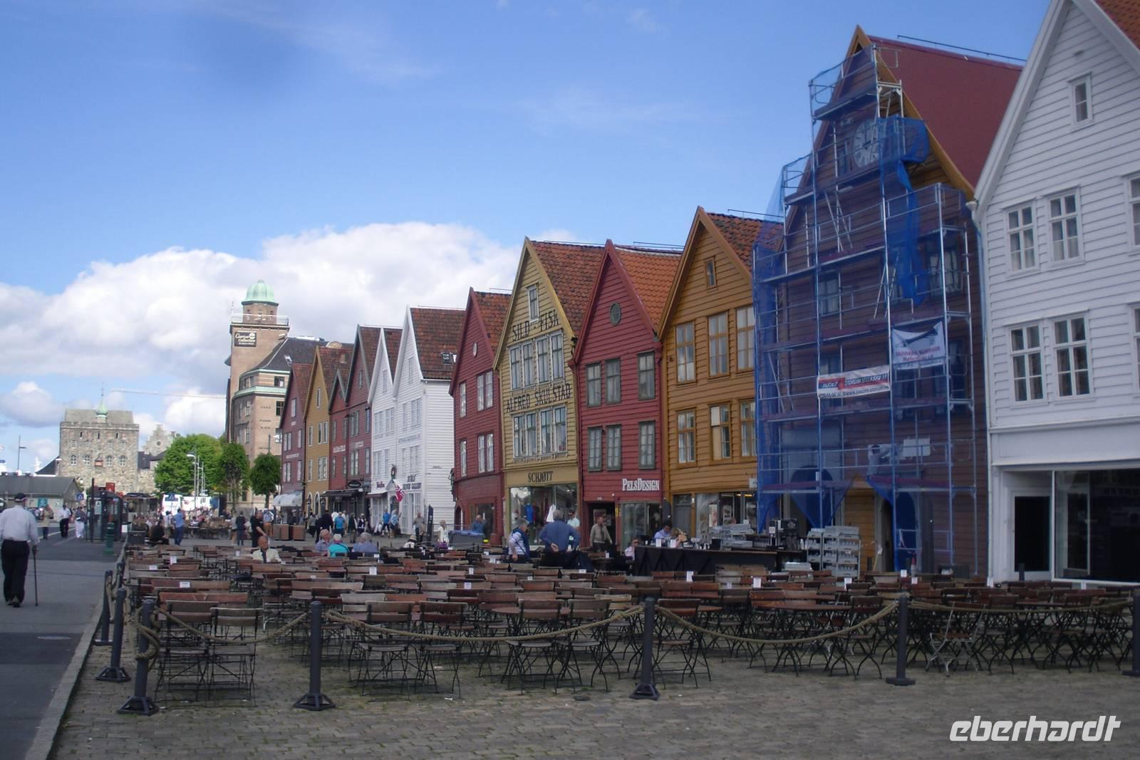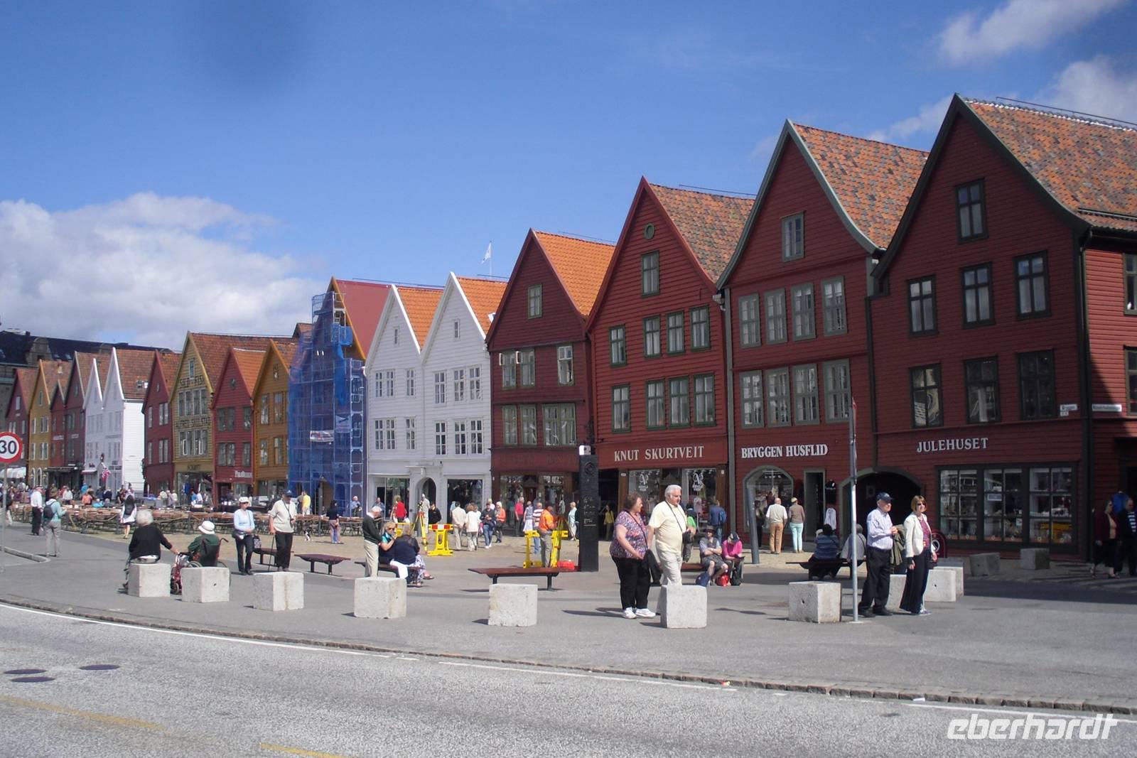 Wir fuhren heute über die Sognefjellstraße, der Reichsstraße 55. Der mit 1.434 Metern höchstgelegene Gebirgspass Nordeuropas ist seit 1938 für Autos befahrbar. Die Passüberquerung ist eine der ältesten Verbindungswege zwischen Ost und West, sie war die Hauptroute vom gesamten Gudbrandsdal zu den Küstensiedlungen in Sogn und bis nach Bergen. An Waren wurden hier hauptsächlich Salz, Hering und Fisch aus dem Westen und Häute, Butter, und Eisen aus dem Osten transportiert - in beiden Richtungen auf dem eigenen Rücken oder zu Pferd. Unterwegs nutzten wir die reichlichen Möglichkeiten für Fotostopps, obwohl es das Wetter heute wieder mal nicht so gut mit uns meinte. Schließlich erreichten wir Skjolden am Lustrafjord bzw. am inneren Ende des Sognefjords, hier waren wir übrigens etwa 200 Kilometer vom Meer entfernt. Entlang der Nordseite des Lustrafjords und mit herrlichen Blicken auf den Fjord und die zahlreichen Wasserfälle erreichten wir Kaupanger, von wo wir am Nachmittag mit dem Schiff nach Gudvangen ablegten. Nach einer herrlichen Fahrt durch die verschiedenen Fjordarme des Sognefjordes kamen wir am späten Nachmittag in Gudvangen, am südlichen Ende des schmalen Nærøyfjordes, an. Mit dem Bus fuhren wir nun in Richtung Bergen weiter. Auf unserem Weg dorthin legten wir einen Stopp am Tvindefoss ein, ein herrlicher Wasserfall - eine wahre „Wassersymphonie"! Schließlich erreichten wir Voss, das administrative, kommerzielle und touristische Zentrum eines ausgedehnten Tals (Vossevangen) inmitten der Bergwelt zwischen Sogne- und Hardangerfjord. Die fruchtbaren Böden haben die Region zum bedeutendsten landwirtschaftlichen Nutzgebiet nach Südostnorwegen, Trondheimgebiet und Gudbrandsdal gemacht. Am Abend erreichten wir schließlich das zentral gelegenes Best Western Hotel Hordaheimen in Bergen, unser Domizil für die nächsten zwei Nächte. Leider wirkte das Hotel von außen nicht gerade einladend, das komplette Hotel war eingerüstet und nicht als Hotel wahr zu nehmen. Nichts desto trotz - die Zimmer waren größtenteils in Ordnung und die ideale Lage unweit des Naturhafens Vågen überzeugte letztendlich.