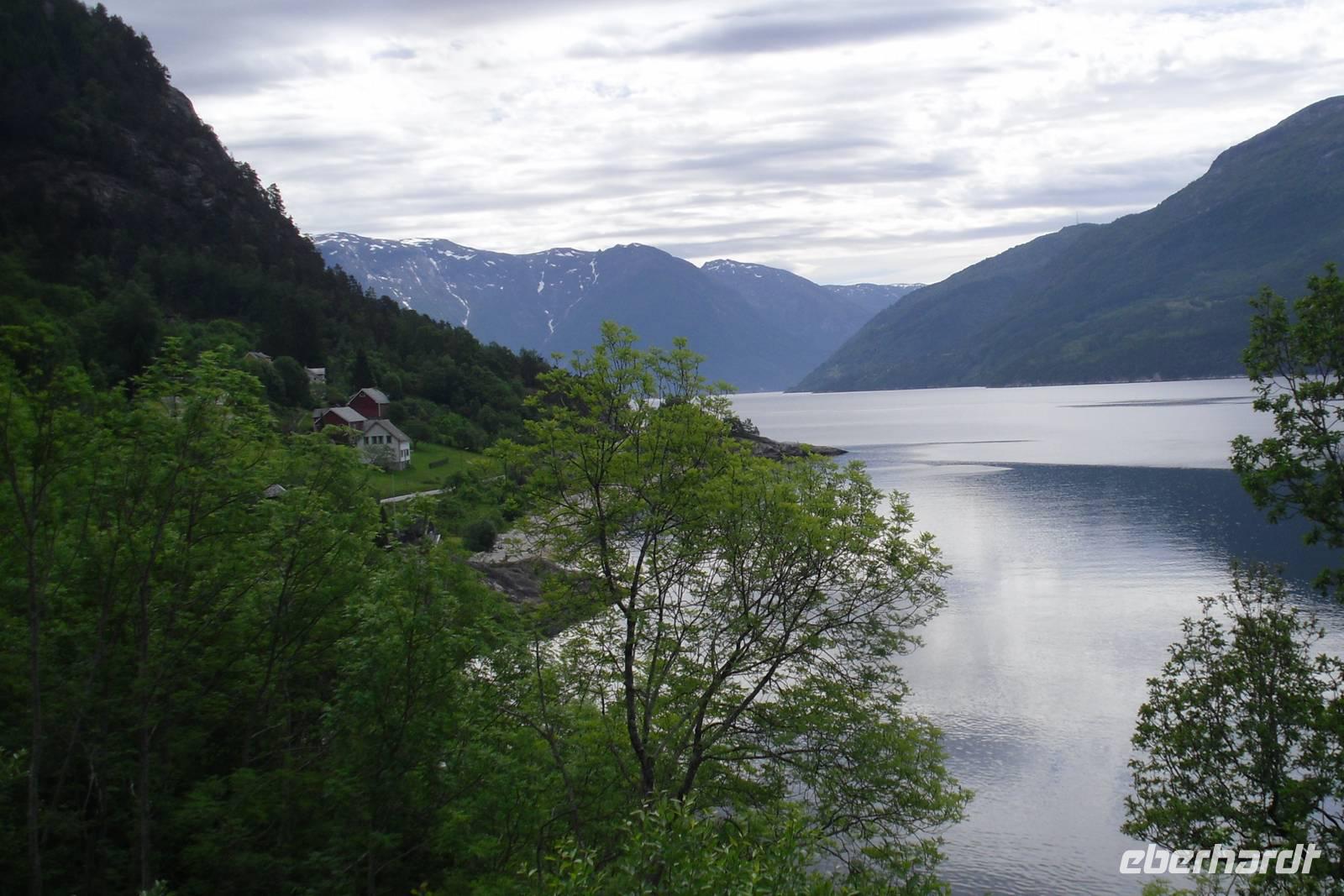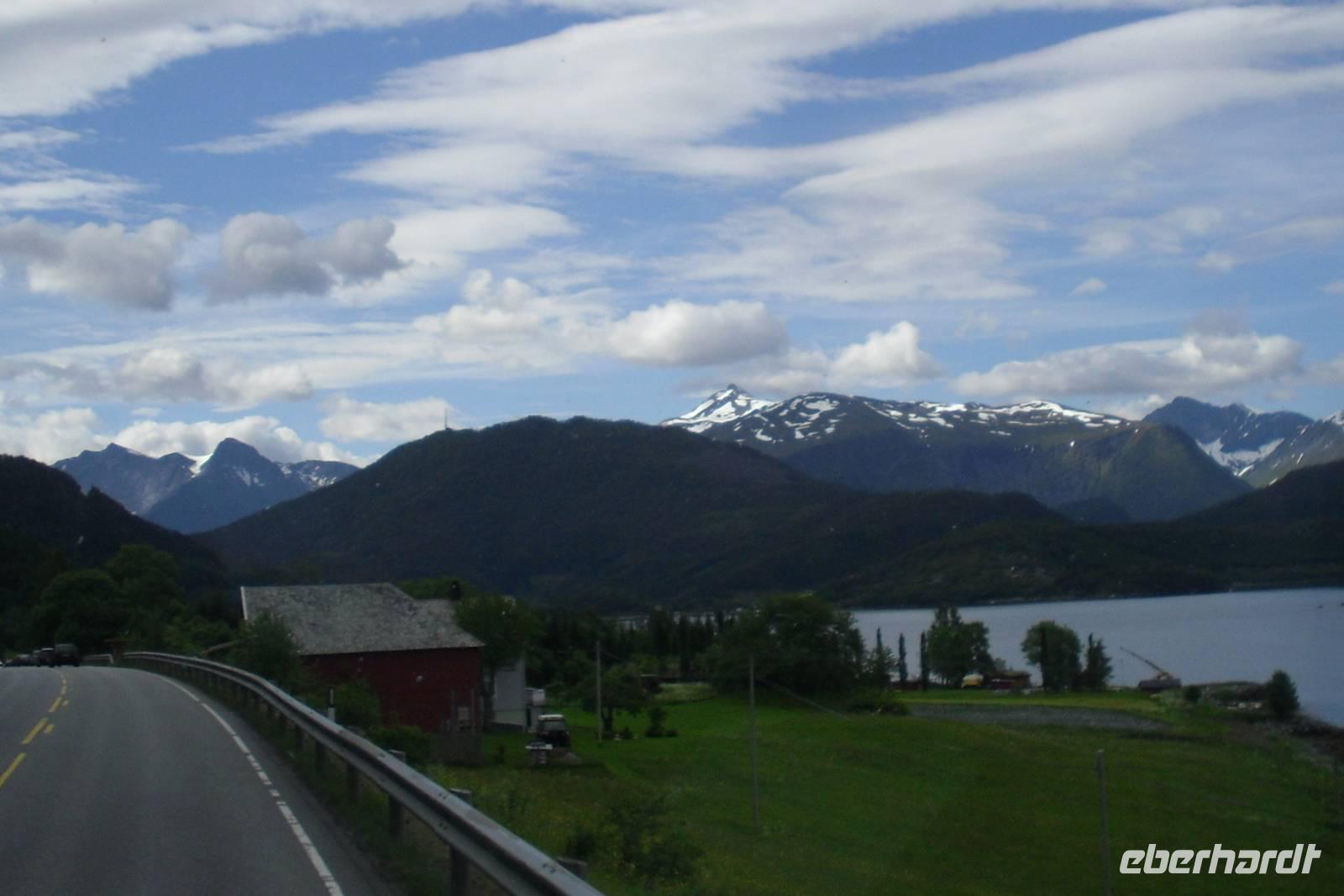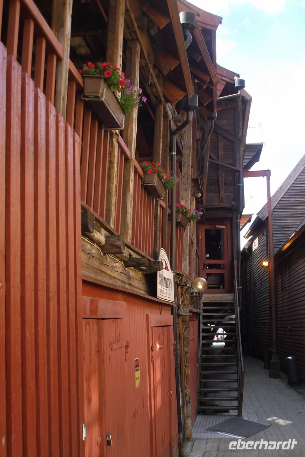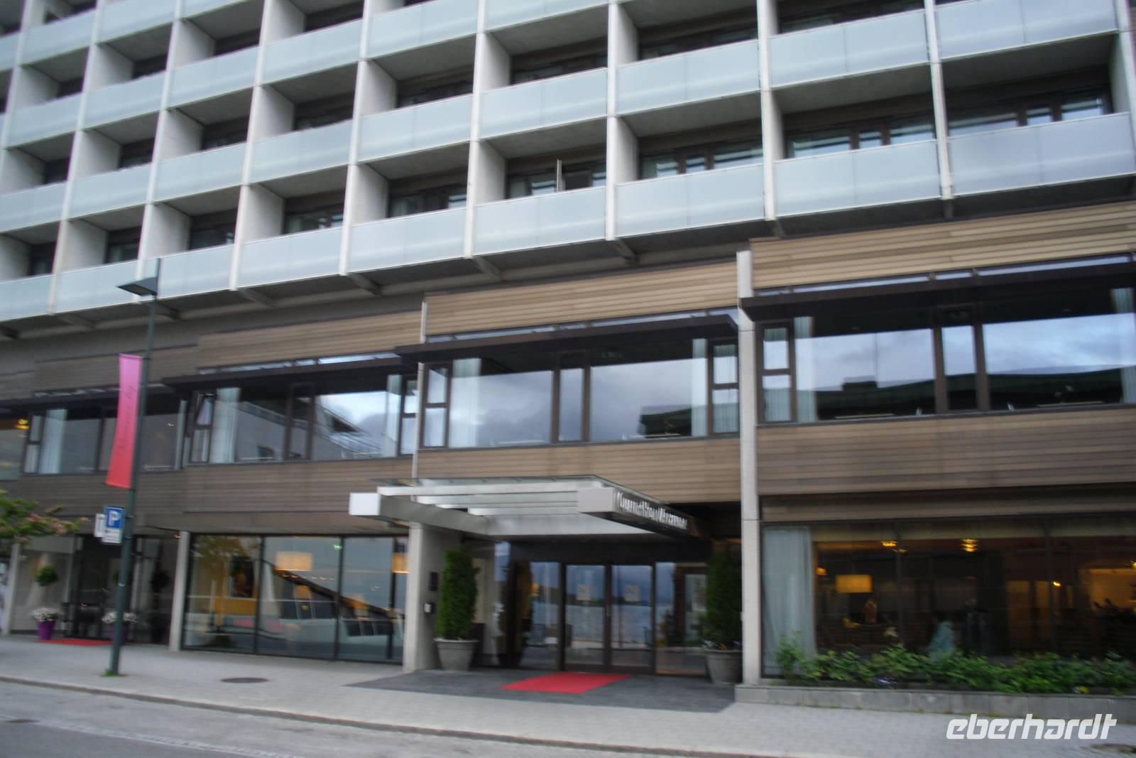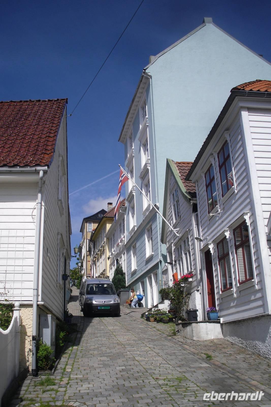 Wir fuhren heute über die Sognefjellstraße, der Reichsstraße 55. Der mit 1.434 Metern höchstgelegene Gebirgspass Nordeuropas ist seit 1938 für Autos befahrbar. Die Passüberquerung ist eine der ältesten Verbindungswege zwischen Ost und West, sie war die Hauptroute vom gesamten Gudbrandsdal zu den Küstensiedlungen in Sogn und bis nach Bergen. An Waren wurden hier hauptsächlich Salz, Hering und Fisch aus dem Westen und Häute, Butter, und Eisen aus dem Osten transportiert - in beiden Richtungen auf dem eigenen Rücken oder zu Pferd. Unterwegs nutzten wir die reichlichen Möglichkeiten für Fotostopps, obwohl es das Wetter heute wieder mal nicht so gut mit uns meinte. Schließlich erreichten wir Skjolden am Lustrafjord bzw. am inneren Ende des Sognefjords, hier waren wir übrigens etwa 200 Kilometer vom Meer entfernt. Entlang der Nordseite des Lustrafjords und mit herrlichen Blicken auf den Fjord und die zahlreichen Wasserfälle erreichten wir Kaupanger, von wo wir am Nachmittag mit dem Schiff nach Gudvangen ablegten. Nach einer herrlichen Fahrt durch die verschiedenen Fjordarme des Sognefjordes kamen wir am späten Nachmittag in Gudvangen, am südlichen Ende des schmalen Nærøyfjordes, an. Mit dem Bus fuhren wir nun in Richtung Bergen weiter. Auf unserem Weg dorthin legten wir einen Stopp am Tvindefoss ein, ein herrlicher Wasserfall - eine wahre „Wassersymphonie"! Schließlich erreichten wir Voss, das administrative, kommerzielle und touristische Zentrum eines ausgedehnten Tals (Vossevangen) inmitten der Bergwelt zwischen Sogne- und Hardangerfjord. Die fruchtbaren Böden haben die Region zum bedeutendsten landwirtschaftlichen Nutzgebiet nach Südostnorwegen, Trondheimgebiet und Gudbrandsdal gemacht. Am Abend erreichten wir schließlich das zentral gelegenes Best Western Hotel Hordaheimen in Bergen, unser Domizil für die nächsten zwei Nächte. Leider wirkte das Hotel von außen nicht gerade einladend, das komplette Hotel war eingerüstet und nicht als Hotel wahr zu nehmen. Nichts desto trotz - die Zimmer waren größtenteils in Ordnung und die ideale Lage unweit des Naturhafens Vågen überzeugte letztendlich.