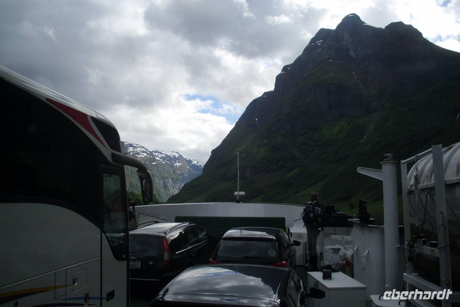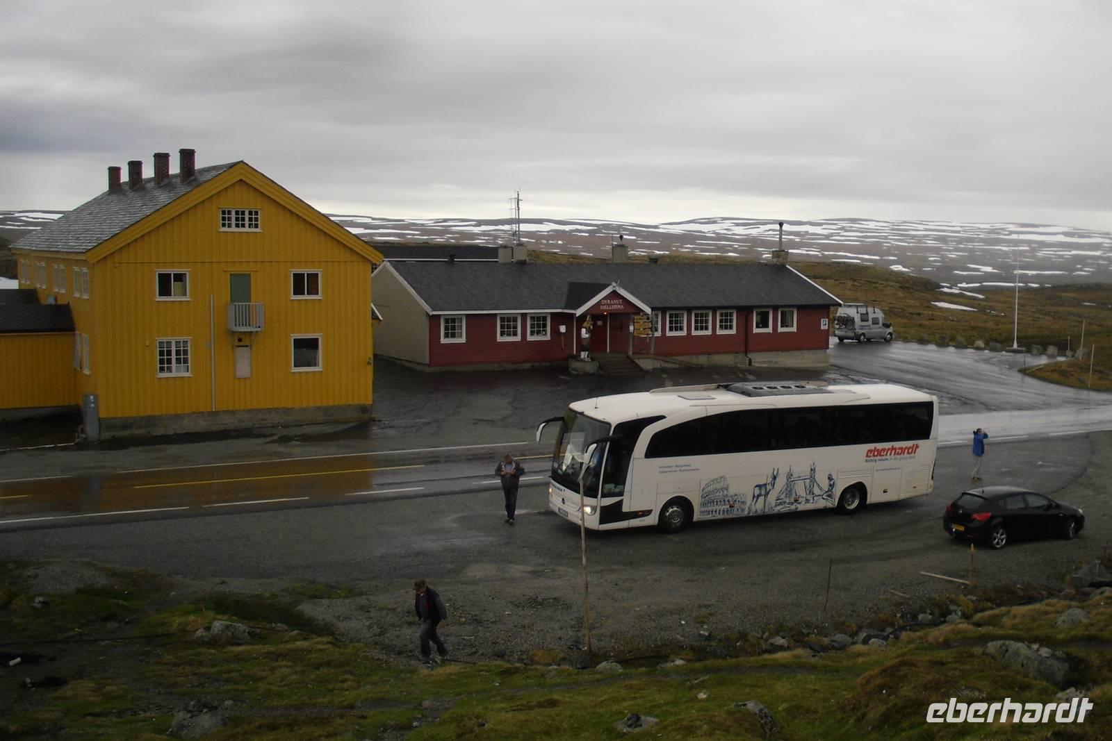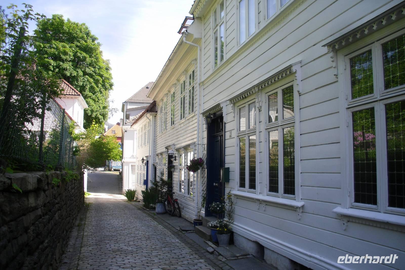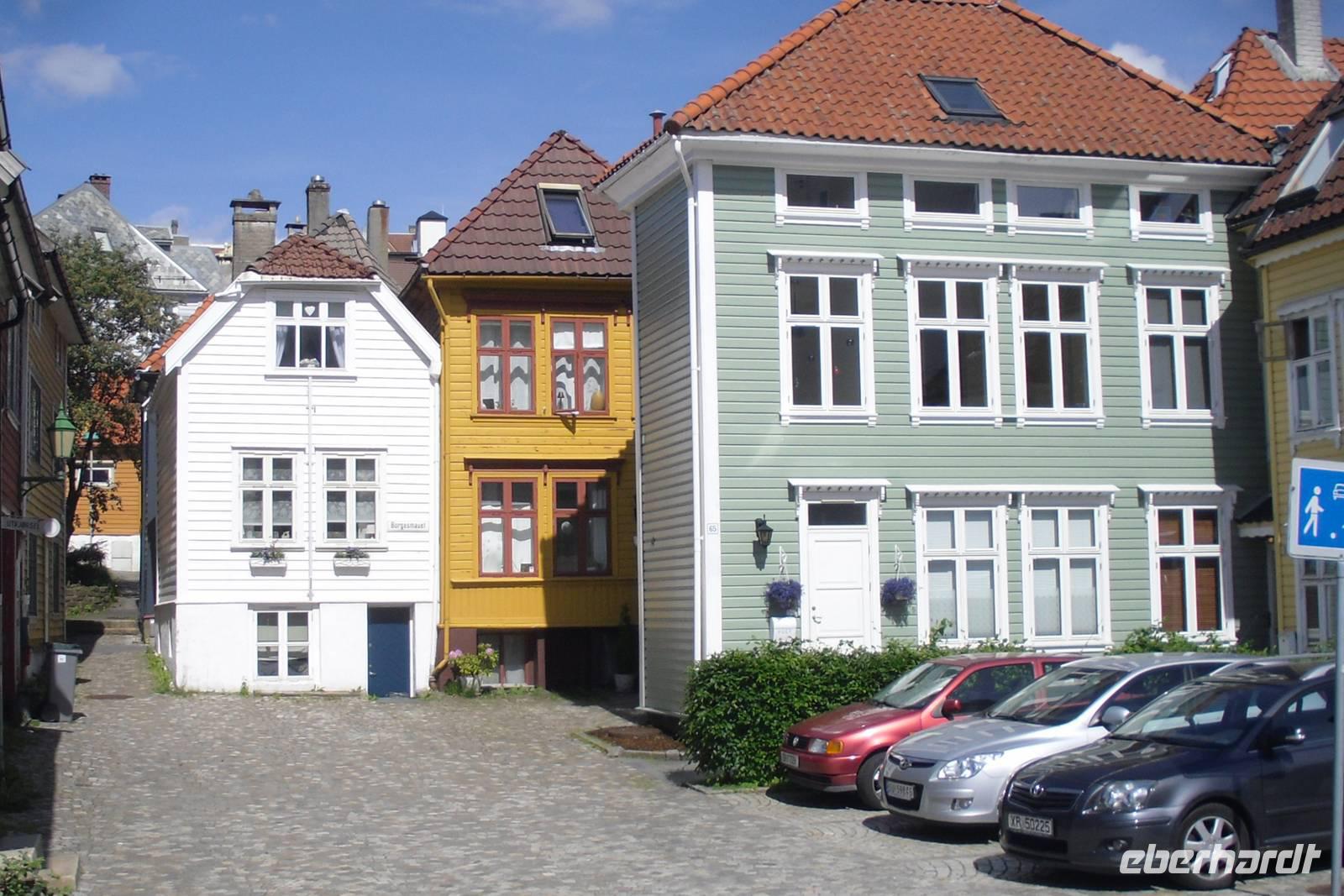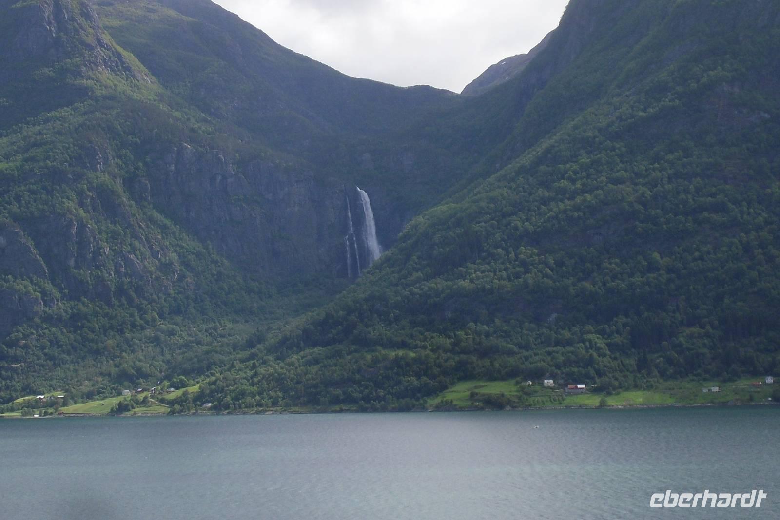 Wir fuhren heute über die Sognefjellstraße, der Reichsstraße 55. Der mit 1.434 Metern höchstgelegene Gebirgspass Nordeuropas ist seit 1938 für Autos befahrbar. Die Passüberquerung ist eine der ältesten Verbindungswege zwischen Ost und West, sie war die Hauptroute vom gesamten Gudbrandsdal zu den Küstensiedlungen in Sogn und bis nach Bergen. An Waren wurden hier hauptsächlich Salz, Hering und Fisch aus dem Westen und Häute, Butter, und Eisen aus dem Osten transportiert - in beiden Richtungen auf dem eigenen Rücken oder zu Pferd. Unterwegs nutzten wir die reichlichen Möglichkeiten für Fotostopps, obwohl es das Wetter heute wieder mal nicht so gut mit uns meinte. Schließlich erreichten wir Skjolden am Lustrafjord bzw. am inneren Ende des Sognefjords, hier waren wir übrigens etwa 200 Kilometer vom Meer entfernt. Entlang der Nordseite des Lustrafjords und mit herrlichen Blicken auf den Fjord und die zahlreichen Wasserfälle erreichten wir Kaupanger, von wo wir am Nachmittag mit dem Schiff nach Gudvangen ablegten. Nach einer herrlichen Fahrt durch die verschiedenen Fjordarme des Sognefjordes kamen wir am späten Nachmittag in Gudvangen, am südlichen Ende des schmalen Nærøyfjordes, an. Mit dem Bus fuhren wir nun in Richtung Bergen weiter. Auf unserem Weg dorthin legten wir einen Stopp am Tvindefoss ein, ein herrlicher Wasserfall - eine wahre „Wassersymphonie"! Schließlich erreichten wir Voss, das administrative, kommerzielle und touristische Zentrum eines ausgedehnten Tals (Vossevangen) inmitten der Bergwelt zwischen Sogne- und Hardangerfjord. Die fruchtbaren Böden haben die Region zum bedeutendsten landwirtschaftlichen Nutzgebiet nach Südostnorwegen, Trondheimgebiet und Gudbrandsdal gemacht. Am Abend erreichten wir schließlich das zentral gelegenes Best Western Hotel Hordaheimen in Bergen, unser Domizil für die nächsten zwei Nächte. Leider wirkte das Hotel von außen nicht gerade einladend, das komplette Hotel war eingerüstet und nicht als Hotel wahr zu nehmen. Nichts desto trotz - die Zimmer waren größtenteils in Ordnung und die ideale Lage unweit des Naturhafens Vågen überzeugte letztendlich.