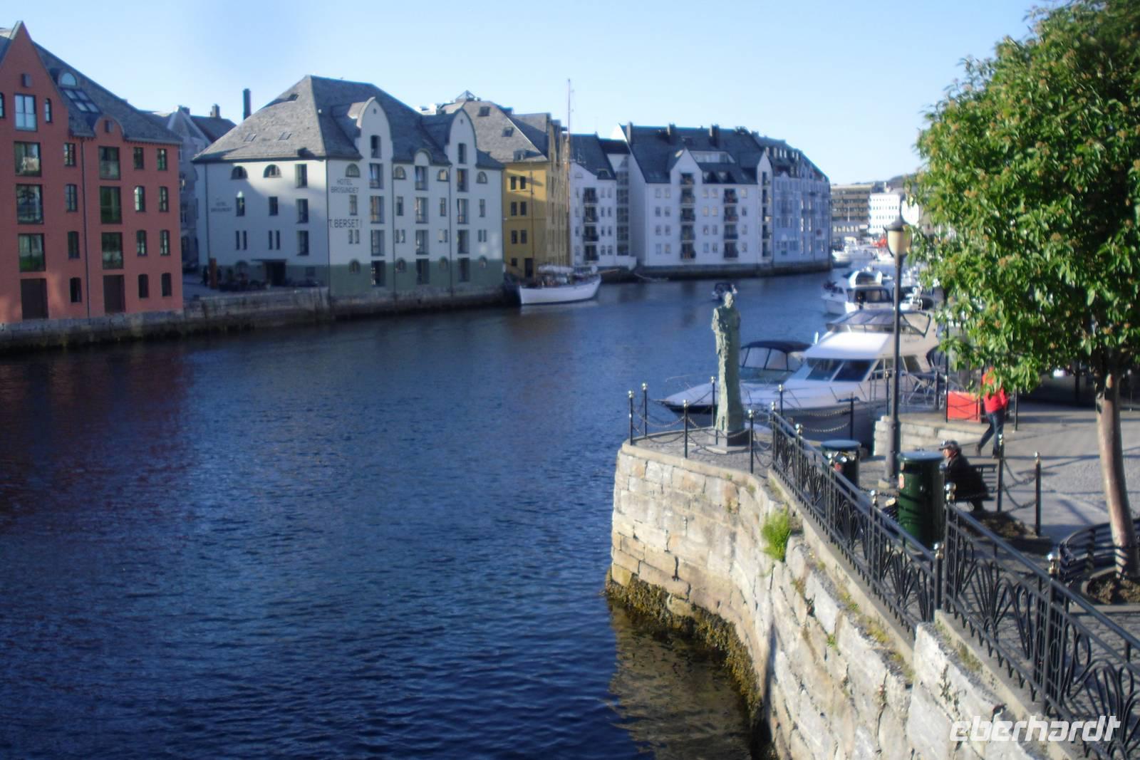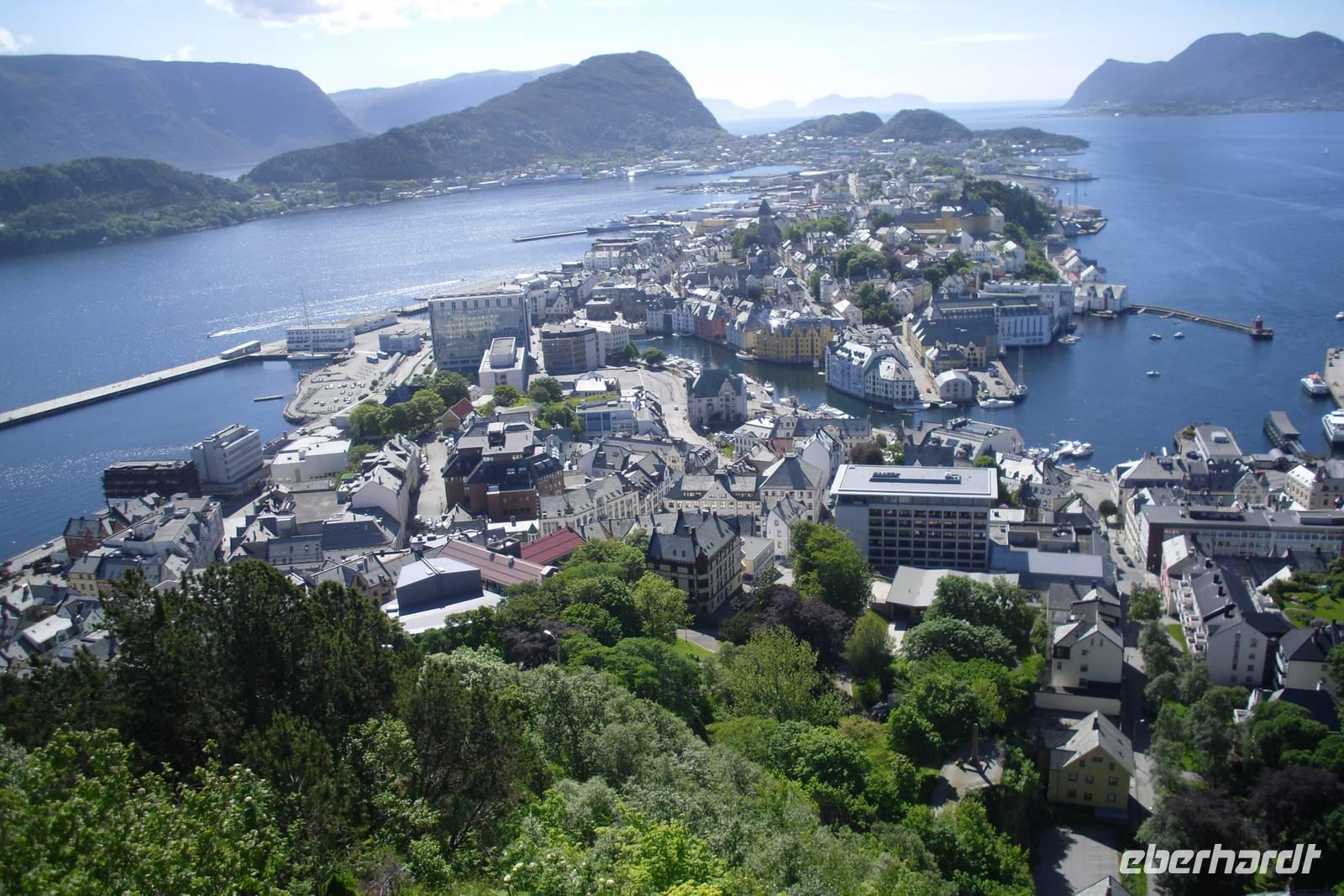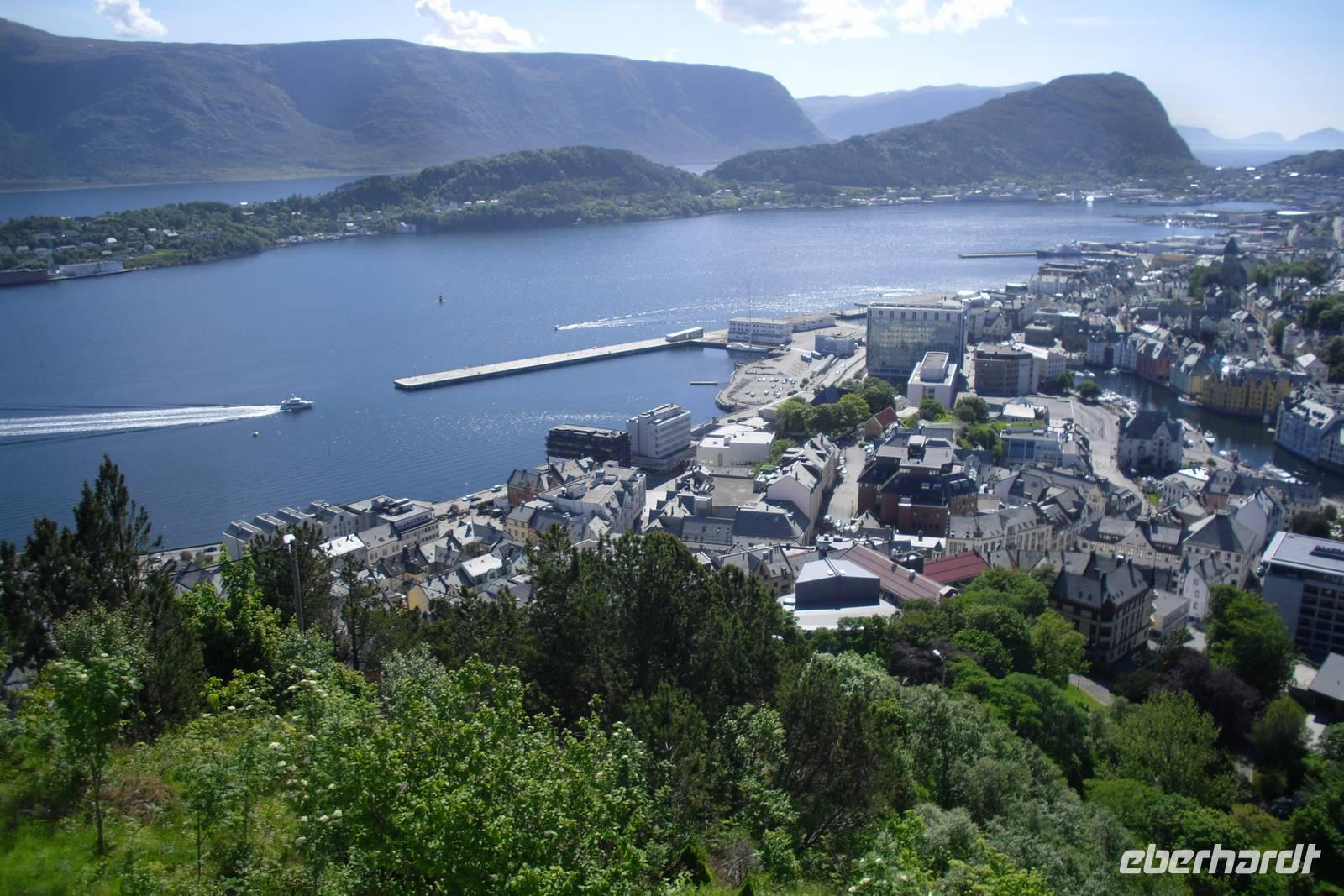 Hier oben kann man bei schönem Wetter das bekannte "Moldepanorama" genießen, denn man hat einen herrlichen Blick über den Fjord und auf die schneebedeckten Gipfel der Romsdaler Alpen - wir hatten Glück und der Wettergott hatte ein Einsehen mit uns! Nun sollte es allerdings weiter in Richtung Trollstigen gehen. Die umgebenden Berge hier sind schroff - Namen wie Kongen (König), Dronningen (Königin) und Bispen (Bischoff) bestätigen die Majestät dieser Bergwelt. Hoch oben stürzt sich der Stigfossen ins üppig grüne Isterdal, und mittendurch steigt die Trollstigen-Straße an der Bergseite empor. Nach einer Bauzeit von acht Jahren wurde der Trollstigen 1936 eröffnet und selbst heute ist die Straße ein gutes Beispiel für hohe Ingenieur- und Baukunst. Übersetzen könnte man den Namen "Trollstigen" übrigens mit "Zauberweg". Was sind nun eigentlich Trolle? - Es sind im nordischen Volksglauben Dämonen in Riesengestalt. Bereits seit grauer Vorzeit leben in den Bergen und in den alten Hünengräbern Norwegens die Trolle. Sie sind - wie auch die Wichteln und Zwerge - elbische Wesen. Ihre Herkunft ist unbekannt. Einem Geistlichen, der sie vertreiben wollte, klagten sie einmal, sie seien herabgestürzte Engel. Einer anderen Geschichte zufolge sind sie Nachkommen der alten Riesen, die immer weiter geschrumpft sind und weiter schrumpfen. Die Trolle sind gedrungene, plumpe, erdfarbene Wesen mit mächtigen Knollennasen; manche haben einen Schwanz und einen zotteligen Pelz. Die Kleider sind grün wie das Moos an einem Waldsee oder grau wie die Flechten auf den Fjellen. Es ist nicht leicht, Bekanntschaft mit einem Troll zu machen - das gelingt angeblich nur um die Mittagszeit geborenen Sonntagskindern oder den neunten Kindern von Eltern, die selbst neunte Kinder ihrer Eltern waren. Und das ist auch gut so. Es gibt nämlich ganz unterschiedliche Trolle. Die einen sind den Menschen freundlich und wohlgesonnen. Sie sind gutmütige Geschöpfe, die oft in der Nähe von Menschen wohnen und nachbarschaftlichen Umgang pflegen. Ihnen zu begegnen ist eine Freude und ein besonderes Erlebnis. Andere Trolle aber sind sehr böse, und vor ihnen muss man sich in Acht nehmen. Die norwegischen Bauern wissen ein Lied davon zu singen, wenn das Trollweib zur Saatzeit als Wirbelwind über den Acker fegt und mit ihrem Kleid die Saat auffängt. Auch vertauschen manche Trolle die Kinder der Menschen und legen an ihrer Stelle ein Trollkind unter, einen missgestalteten Wechselbalg. Es gibt also viel zu berichten über die Trolle..., wir mussen aber weiter. In Ålesund angekommen, ging es mit unserem Bus auf den Stadtberg Aksla hinauf - wir wurden bei strahlendem Sonnenschein mit einem tollen Blick auf die Stadt belohnt! Am späten Nachmittag checkten wir schließlich in unserem zentral gelegenen Thon Hotel in Ålesund ein. Manch einer unserer Gäste nutzte die verbleibende Zeit bis zum Abendessen zu einem Spaziergang durch die Stadt. Wer lässt sich nicht von Ålesund faszinieren? - Die Stadt gibt sich jung, doch die Geschichte, die sie erzählt, ist voller Dramatik. In einer stürmischen Winternacht vor über einhundert Jahren brannte der gesamte Stadtkern bis auf die Grundmauern nieder. Nur wenige Häuser überlebten die Flammen und zehntausend Menschen verloren ihr Zuhause. Wie ein Vogel Phönix aus der Asche erhob sich eine neue Stadt im charakteristischen Jugendstil mit einer Vielfalt an Türmen, Spitzen und wunderschönen Ausschmückungen, die aus einer Phantasiewelt zu stammen scheinen. Nicht ohne Grund wurde Ålesund im Jahre 2007 von den Norwegern zur schönsten Stadt des Landes ernannt.