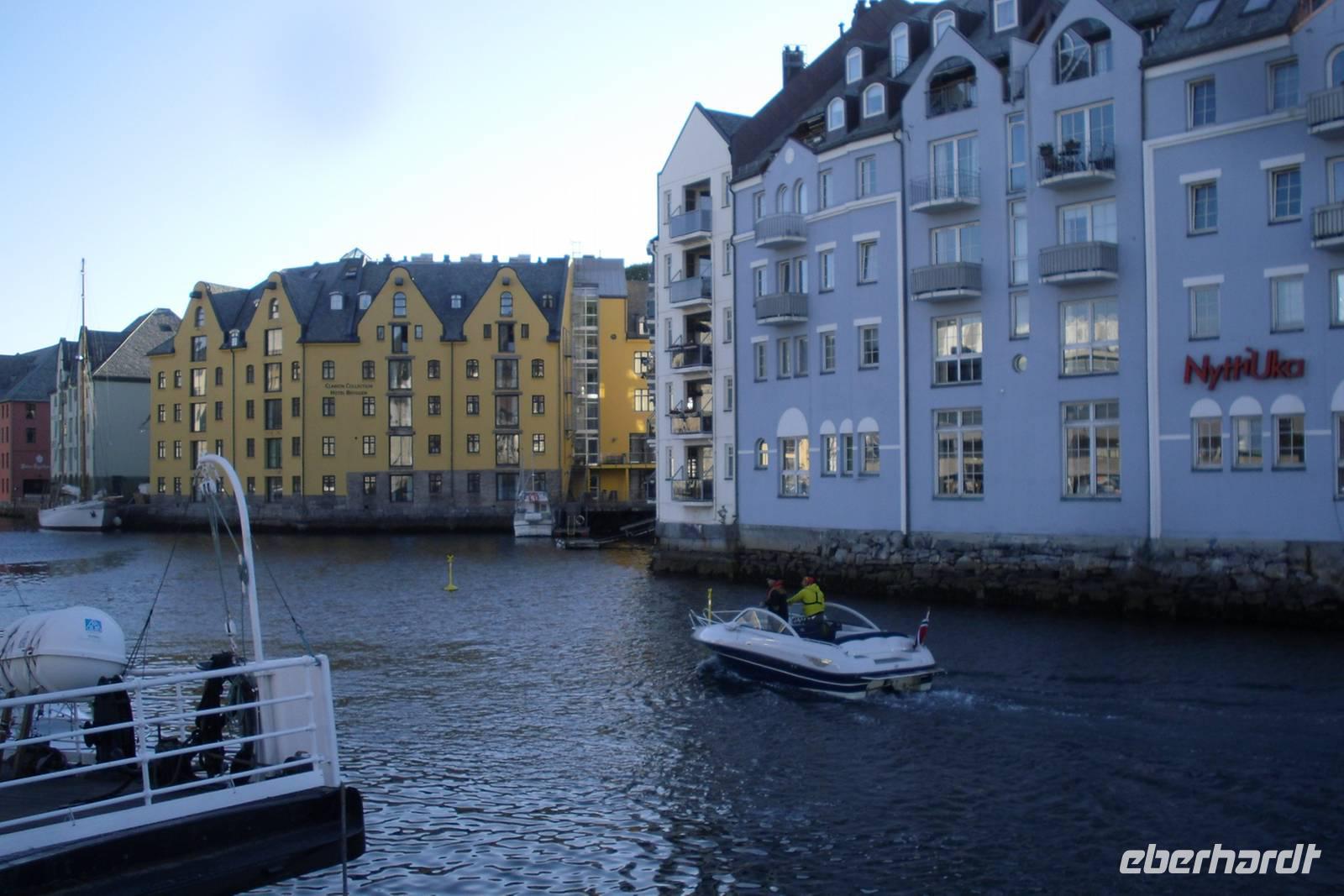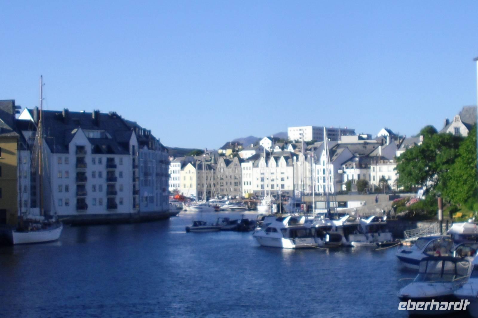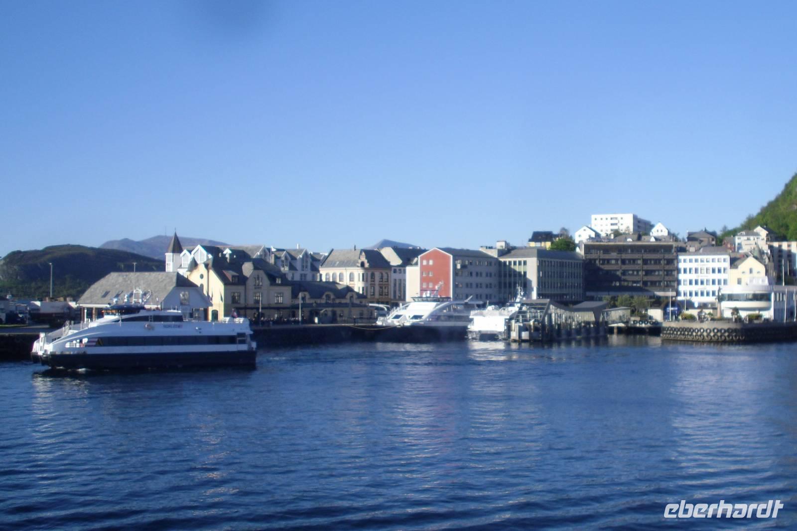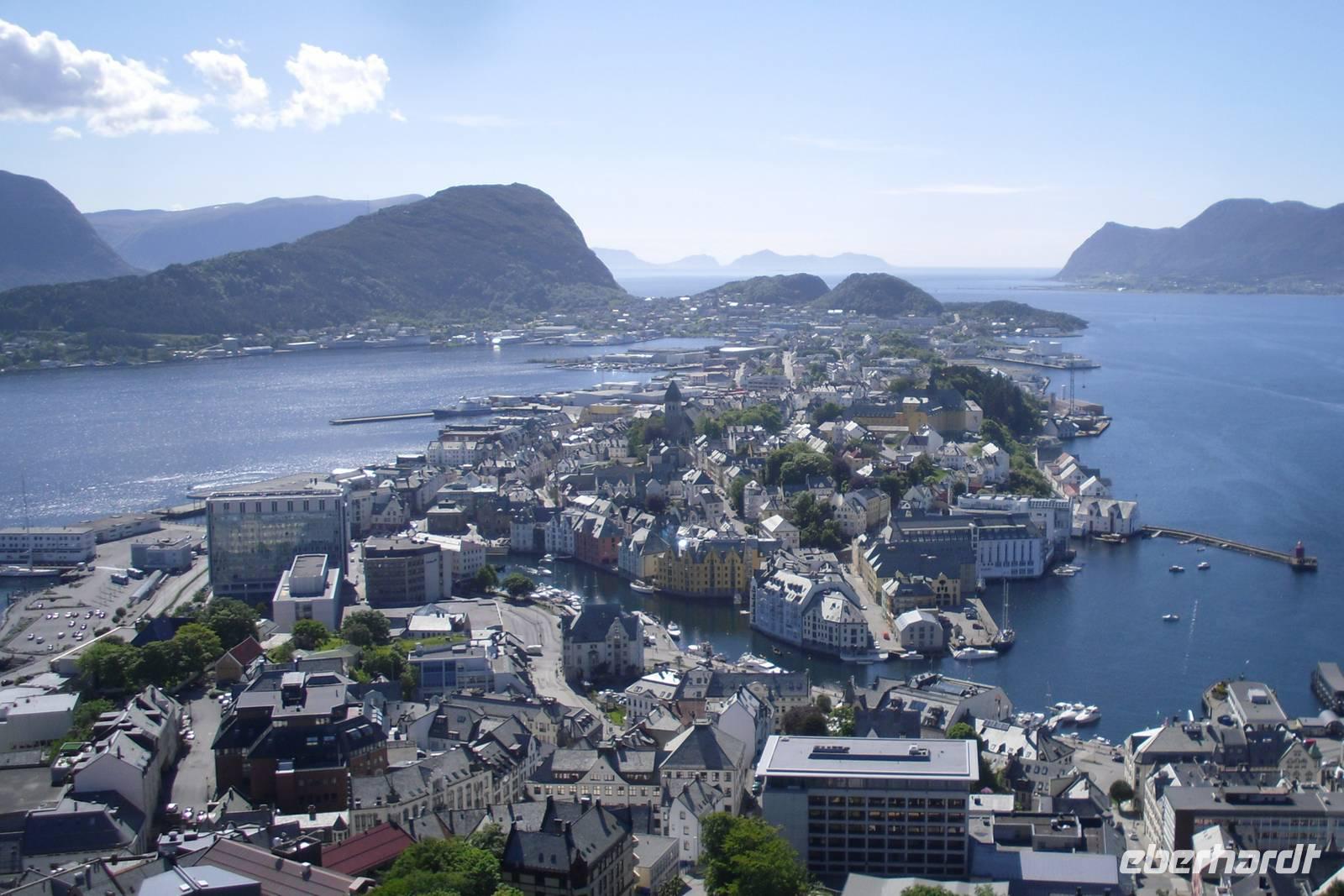 Hier oben kann man bei schönem Wetter das bekannte "Moldepanorama" genießen, denn man hat einen herrlichen Blick über den Fjord und auf die schneebedeckten Gipfel der Romsdaler Alpen - wir hatten Glück und der Wettergott hatte ein Einsehen mit uns! Nun sollte es allerdings weiter in Richtung Trollstigen gehen. Die umgebenden Berge hier sind schroff - Namen wie Kongen (König), Dronningen (Königin) und Bispen (Bischoff) bestätigen die Majestät dieser Bergwelt. Hoch oben stürzt sich der Stigfossen ins üppig grüne Isterdal, und mittendurch steigt die Trollstigen-Straße an der Bergseite empor. Nach einer Bauzeit von acht Jahren wurde der Trollstigen 1936 eröffnet und selbst heute ist die Straße ein gutes Beispiel für hohe Ingenieur- und Baukunst. Übersetzen könnte man den Namen "Trollstigen" übrigens mit "Zauberweg". Was sind nun eigentlich Trolle? - Es sind im nordischen Volksglauben Dämonen in Riesengestalt. Bereits seit grauer Vorzeit leben in den Bergen und in den alten Hünengräbern Norwegens die Trolle. Sie sind - wie auch die Wichteln und Zwerge - elbische Wesen. Ihre Herkunft ist unbekannt. Einem Geistlichen, der sie vertreiben wollte, klagten sie einmal, sie seien herabgestürzte Engel. Einer anderen Geschichte zufolge sind sie Nachkommen der alten Riesen, die immer weiter geschrumpft sind und weiter schrumpfen. Die Trolle sind gedrungene, plumpe, erdfarbene Wesen mit mächtigen Knollennasen; manche haben einen Schwanz und einen zotteligen Pelz. Die Kleider sind grün wie das Moos an einem Waldsee oder grau wie die Flechten auf den Fjellen. Es ist nicht leicht, Bekanntschaft mit einem Troll zu machen - das gelingt angeblich nur um die Mittagszeit geborenen Sonntagskindern oder den neunten Kindern von Eltern, die selbst neunte Kinder ihrer Eltern waren. Und das ist auch gut so. Es gibt nämlich ganz unterschiedliche Trolle. Die einen sind den Menschen freundlich und wohlgesonnen. Sie sind gutmütige Geschöpfe, die oft in der Nähe von Menschen wohnen und nachbarschaftlichen Umgang pflegen. Ihnen zu begegnen ist eine Freude und ein besonderes Erlebnis. Andere Trolle aber sind sehr böse, und vor ihnen muss man sich in Acht nehmen. Die norwegischen Bauern wissen ein Lied davon zu singen, wenn das Trollweib zur Saatzeit als Wirbelwind über den Acker fegt und mit ihrem Kleid die Saat auffängt. Auch vertauschen manche Trolle die Kinder der Menschen und legen an ihrer Stelle ein Trollkind unter, einen missgestalteten Wechselbalg. Es gibt also viel zu berichten über die Trolle..., wir mussen aber weiter. In Ålesund angekommen, ging es mit unserem Bus auf den Stadtberg Aksla hinauf - wir wurden bei strahlendem Sonnenschein mit einem tollen Blick auf die Stadt belohnt! Am späten Nachmittag checkten wir schließlich in unserem zentral gelegenen Thon Hotel in Ålesund ein. Manch einer unserer Gäste nutzte die verbleibende Zeit bis zum Abendessen zu einem Spaziergang durch die Stadt. Wer lässt sich nicht von Ålesund faszinieren? - Die Stadt gibt sich jung, doch die Geschichte, die sie erzählt, ist voller Dramatik. In einer stürmischen Winternacht vor über einhundert Jahren brannte der gesamte Stadtkern bis auf die Grundmauern nieder. Nur wenige Häuser überlebten die Flammen und zehntausend Menschen verloren ihr Zuhause. Wie ein Vogel Phönix aus der Asche erhob sich eine neue Stadt im charakteristischen Jugendstil mit einer Vielfalt an Türmen, Spitzen und wunderschönen Ausschmückungen, die aus einer Phantasiewelt zu stammen scheinen. Nicht ohne Grund wurde Ålesund im Jahre 2007 von den Norwegern zur schönsten Stadt des Landes ernannt.