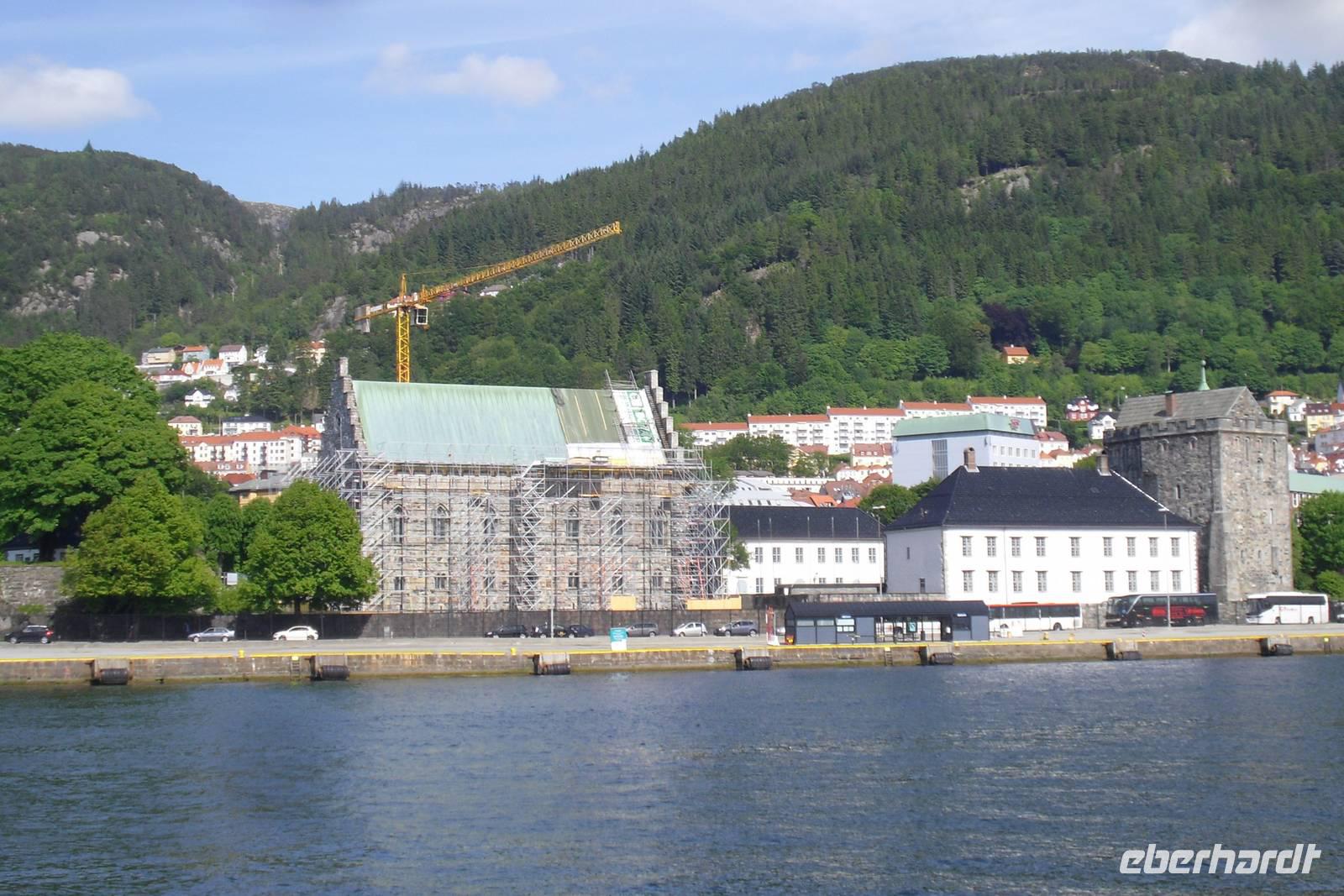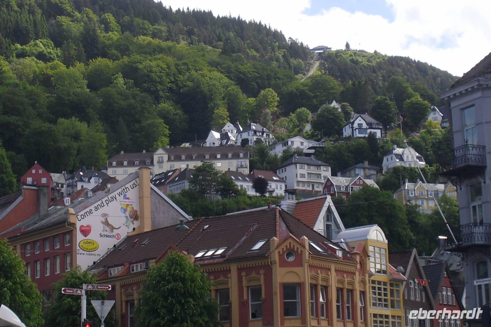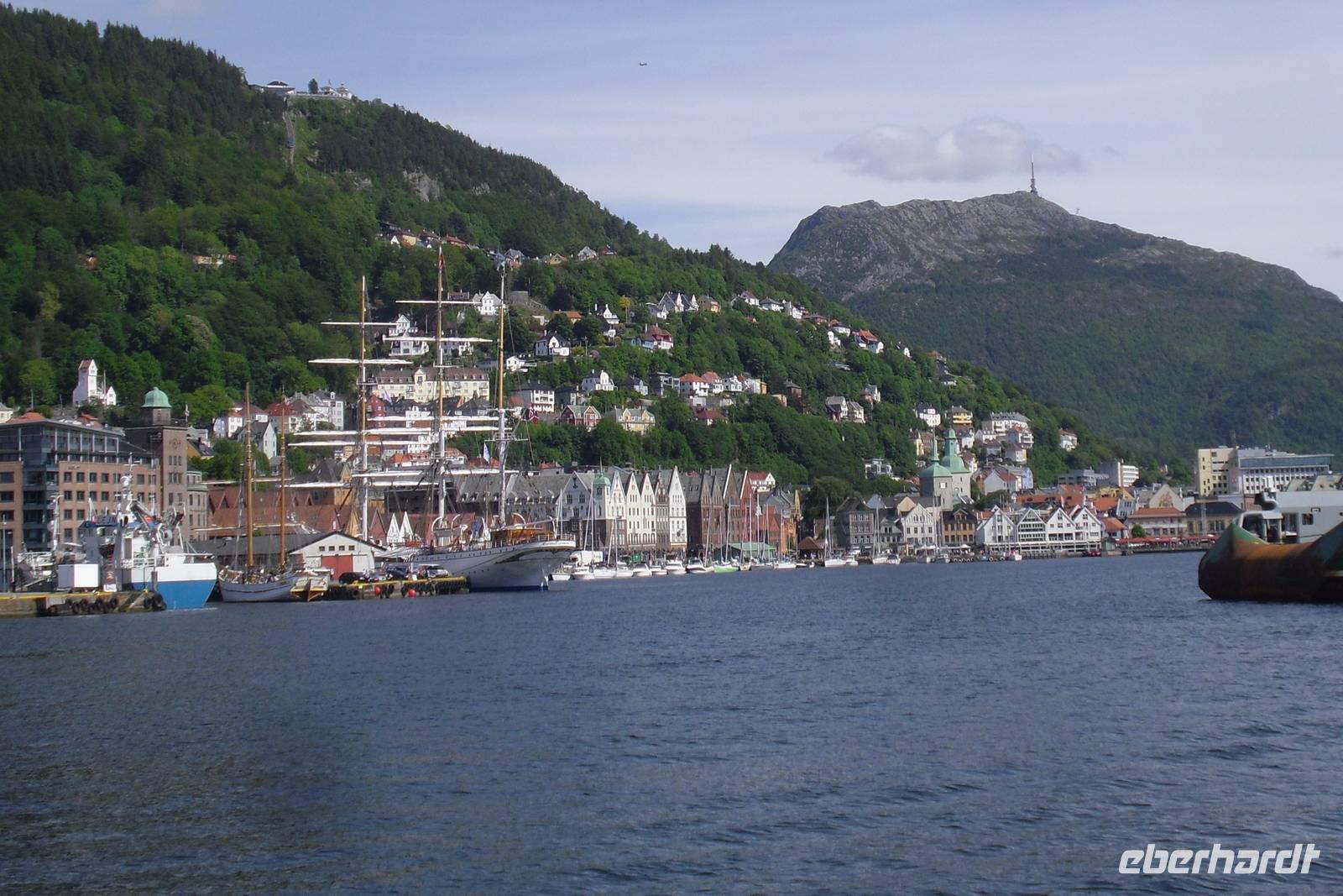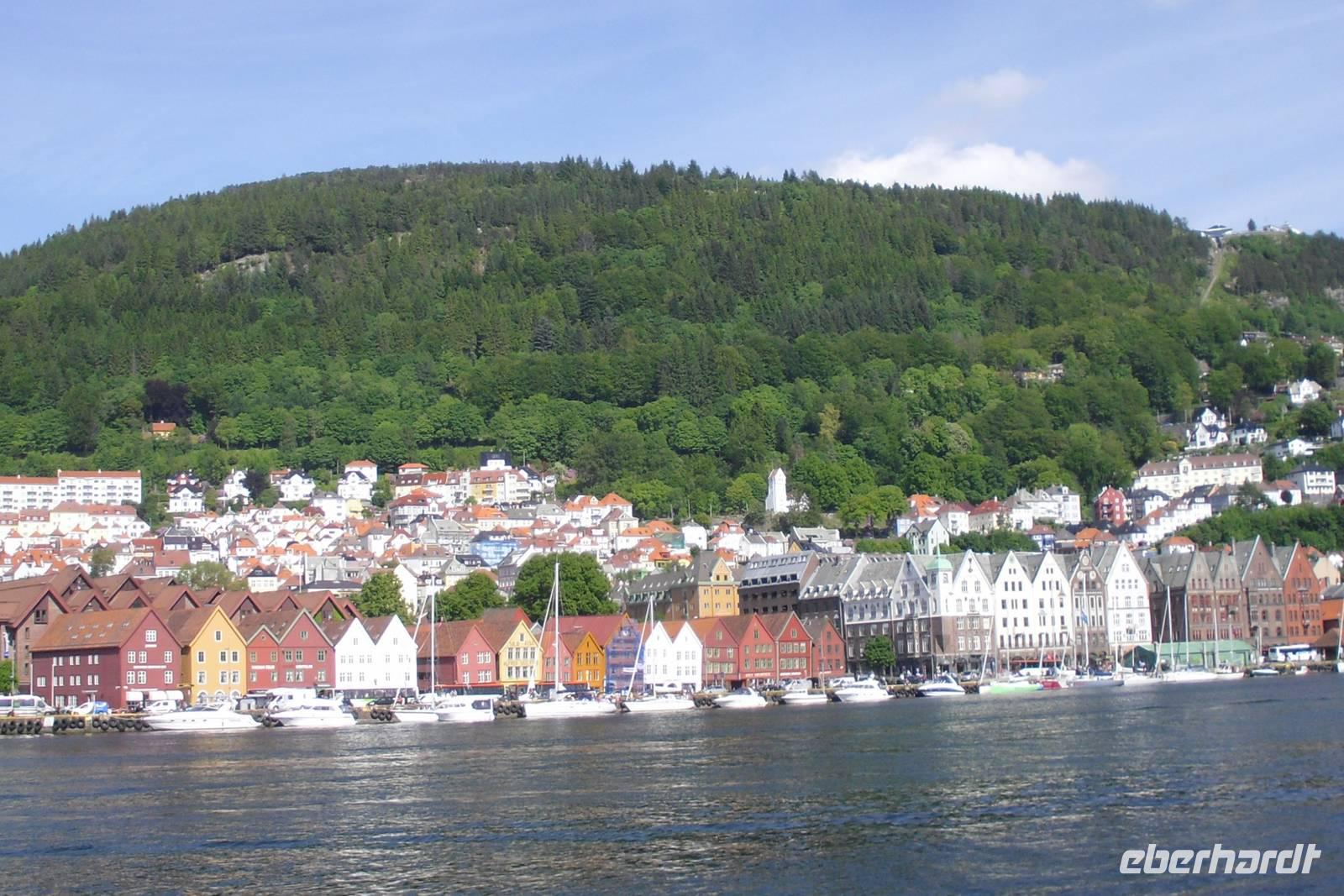 Nach einem reichhaltigen Frühstücksbuffet begannen wir mit unserer etwa 2-stündigen Stadtrundfahrt durch Bergen. Seit König Olaf Kyrre im 11. Jahrhundert mit seinen Wikingerschiffen in der Hafenbucht Vågen anlegte und Bergen dort gründete, zieht die Stadt Menschen aus aller Welt an. Viele Besucher kamen und gingen, andere ließen sich in der norwegischen Hafenstadt nieder. Viele Einheimische verließen ihre traute Umgebung und lernten während ihrer Wanderjahre andere Länder, Leute und Sitten kennen, ehe sie zurückkamen. So konnte sich Bergen zu einem Schmelztiegel verschiedener Kulturen und zu "Norwegens internationalster Stadt" entwickeln. Bergen wuchs um den Hafen herum nach und nach zu einer Stadt heran. Handel, Schifffahrt und Handwerk waren ihre Existenzgrundlage. Schon früh wurde Bergen die größte Stadt des Nordens und Norwegens erste Haupt- und Residenzstadt des Königs. Bereits im 14. Jahrhundert war die Stadt so bedeutend geworden, dass die Hanseaten auf Bryggen ein Kontor gründeten, das noch heute zu sehen ist. Nachdem wir interessante Informationen über diese Stadt erhalten hatten, konnten wir heute mal nach individuellen Bedürfnissen bummeln und etwas Freizeit genießen. Viele unserer Gäste nutzten dabei die Gelegenheit, mit der einzigen Standseilbahn Skandinaviens zum Berg Fløyen hinauf zu fahren. Vom sogenannten "Dach von Bergen" hat man eine fantastische Aussicht über die Stadt, den Schiffsverkehr, die Fjorde und nicht zuletzt die umliegenden Inseln. Eine Aussicht, die einen beeindruckenden Überblick über die Vielfalt der Stadt und der näheren Umgebung gewährt. Eine Aussicht, die den Blick auf das offene Meer, auf die 50 km nördlich gelegene Insel Fedje sowie auf die südlich gelegenen Inseln der Region Sunnhordaland erlaubt. Bergen machte übrigens heute seinem Ruf als regenreichste Großstadt keine Ehre, denn hier soll es an etwa 250 Tagen im Jahr regnen - wir durften hier einen traumhaften Sonnentag verleben!